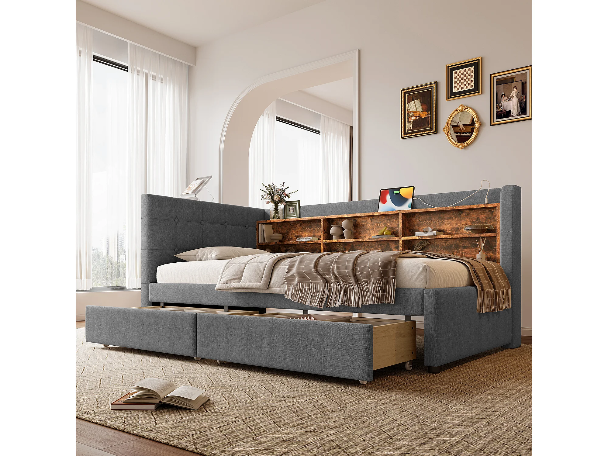 Schlafsofa 90×200 cm - mit 2 Schubladen - USB + Type-C Anschluss - mit Staufach - Leinen - grau (Matratze nicht inbegriffen)