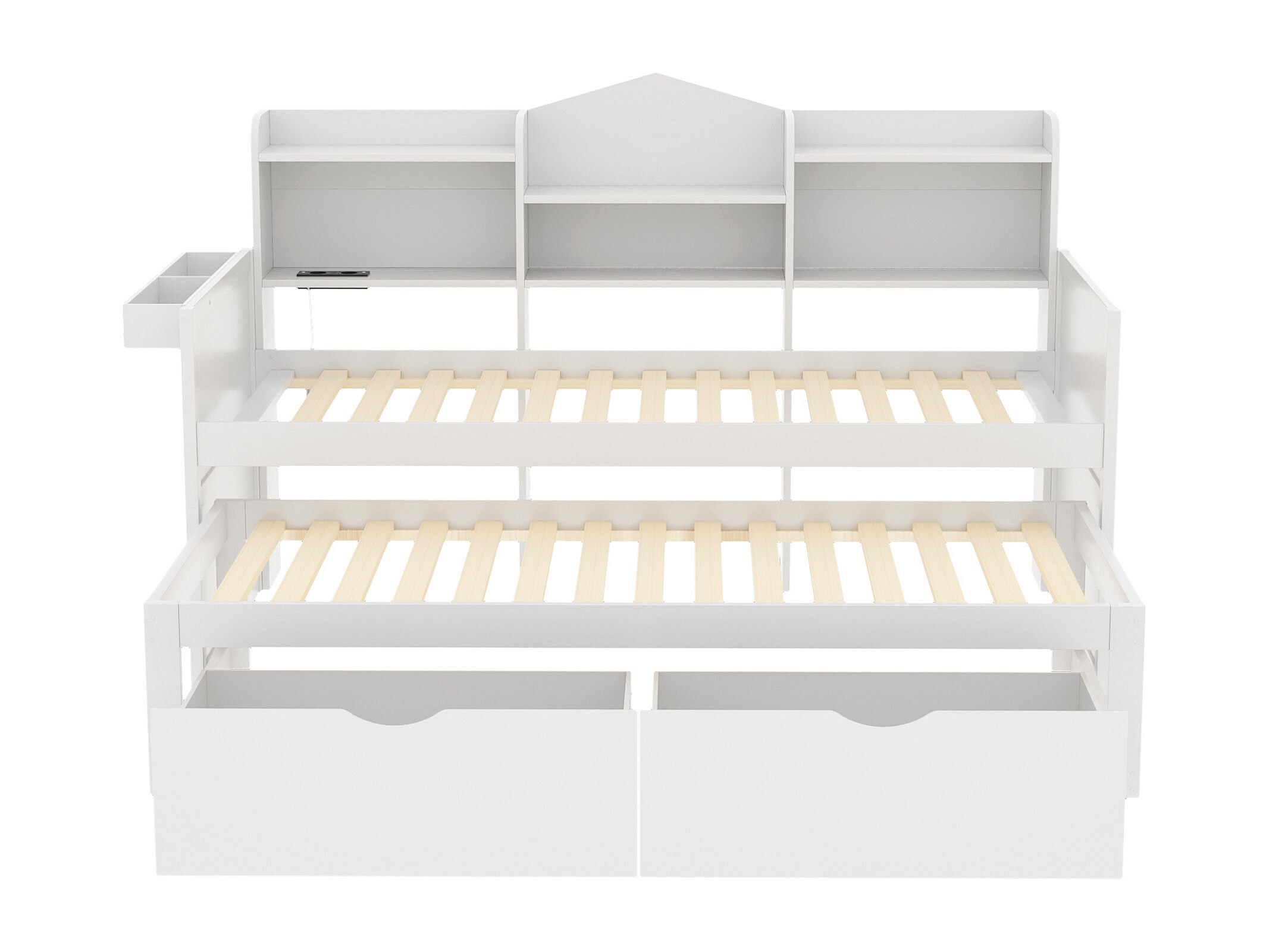 Schlafsofa 90x200 cm mit Ausziehbett 90x190, 2 Schubladen, großer Stauraum, Korb, USB-Anschluss, Einzelbett aus weißem Holz