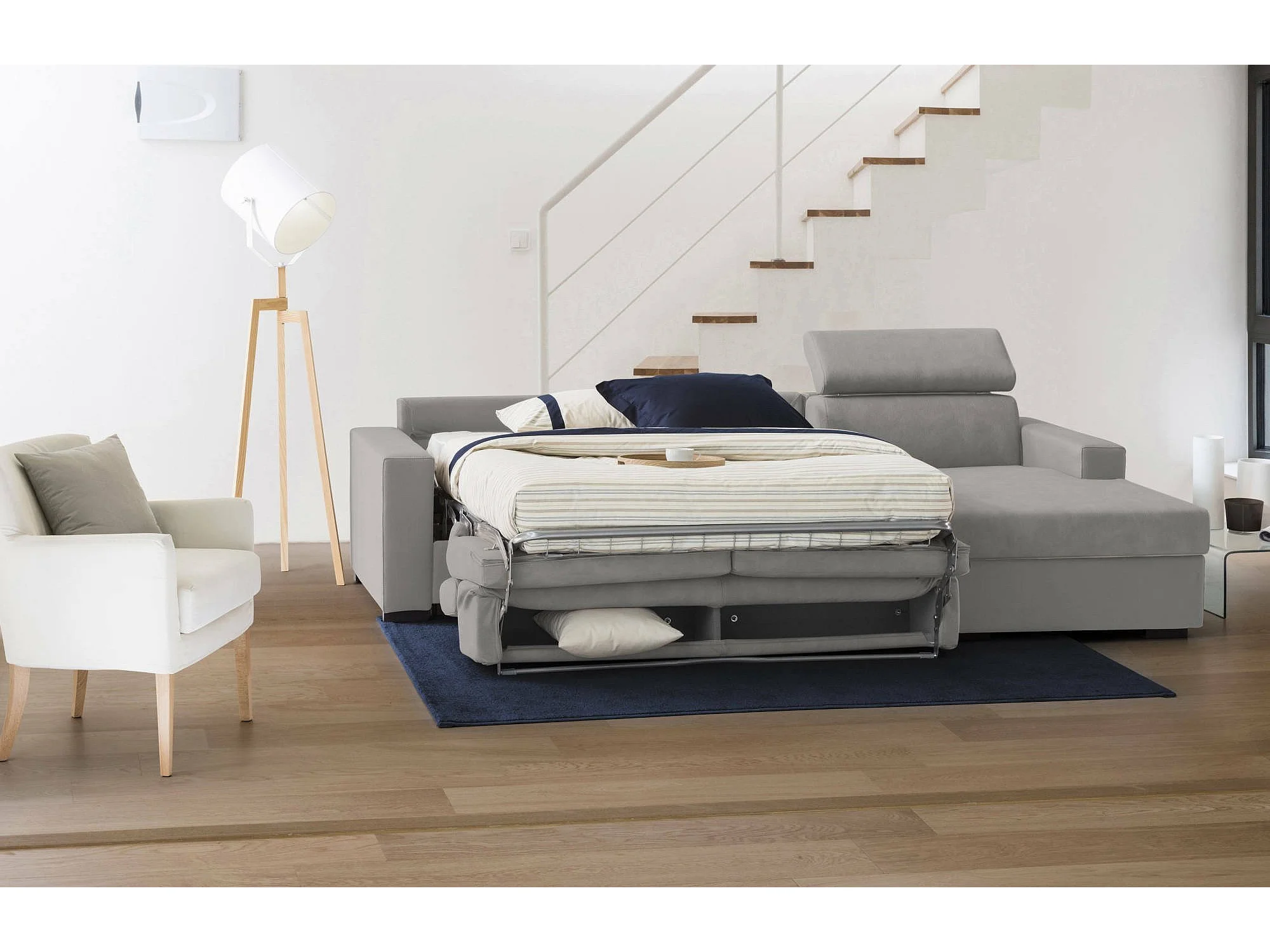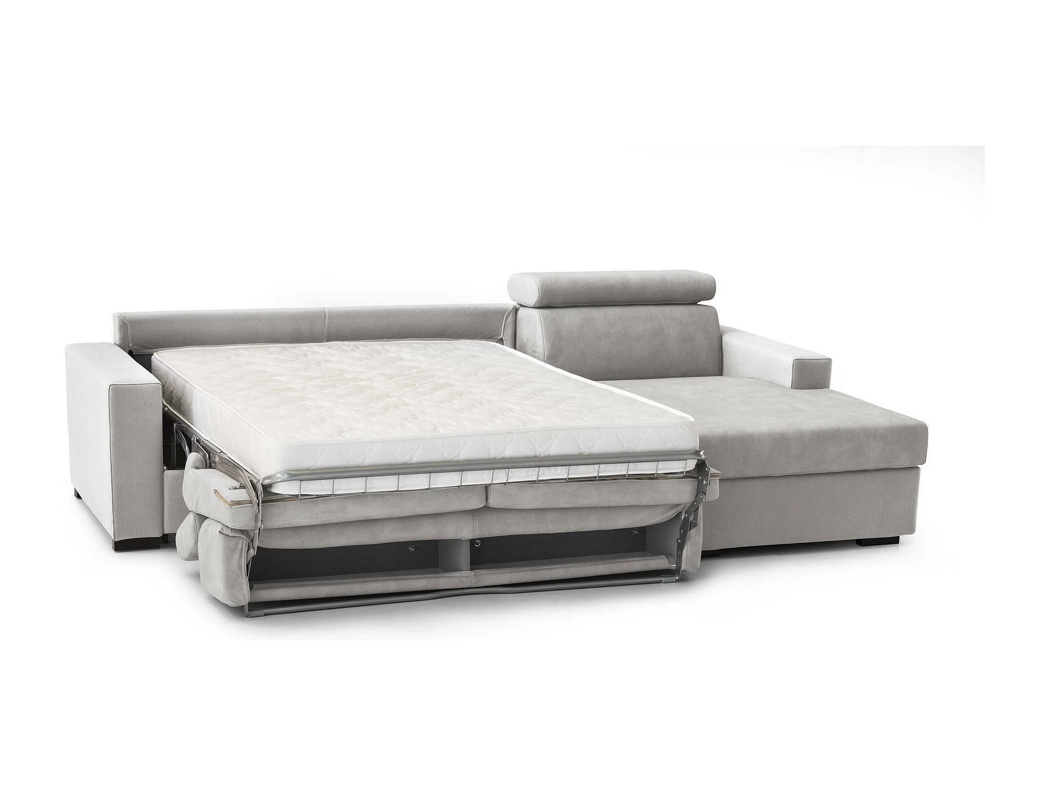 Schlafsofa Daart, Ecksofa, 100% Made in Italy, Sofa mit Drehöffnung, mit rechter Containerhalbinsel, mit Standard-Armlehnen, Cm 280x95h85, Grau