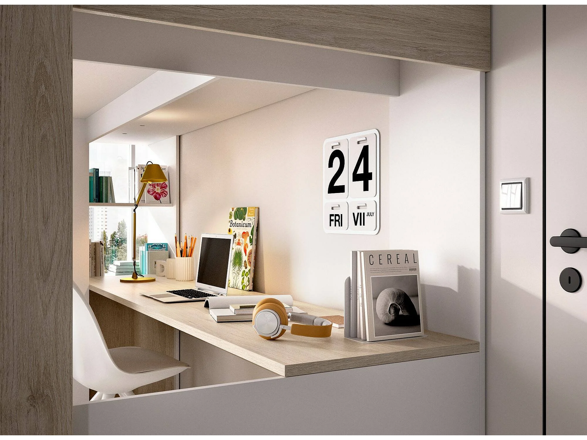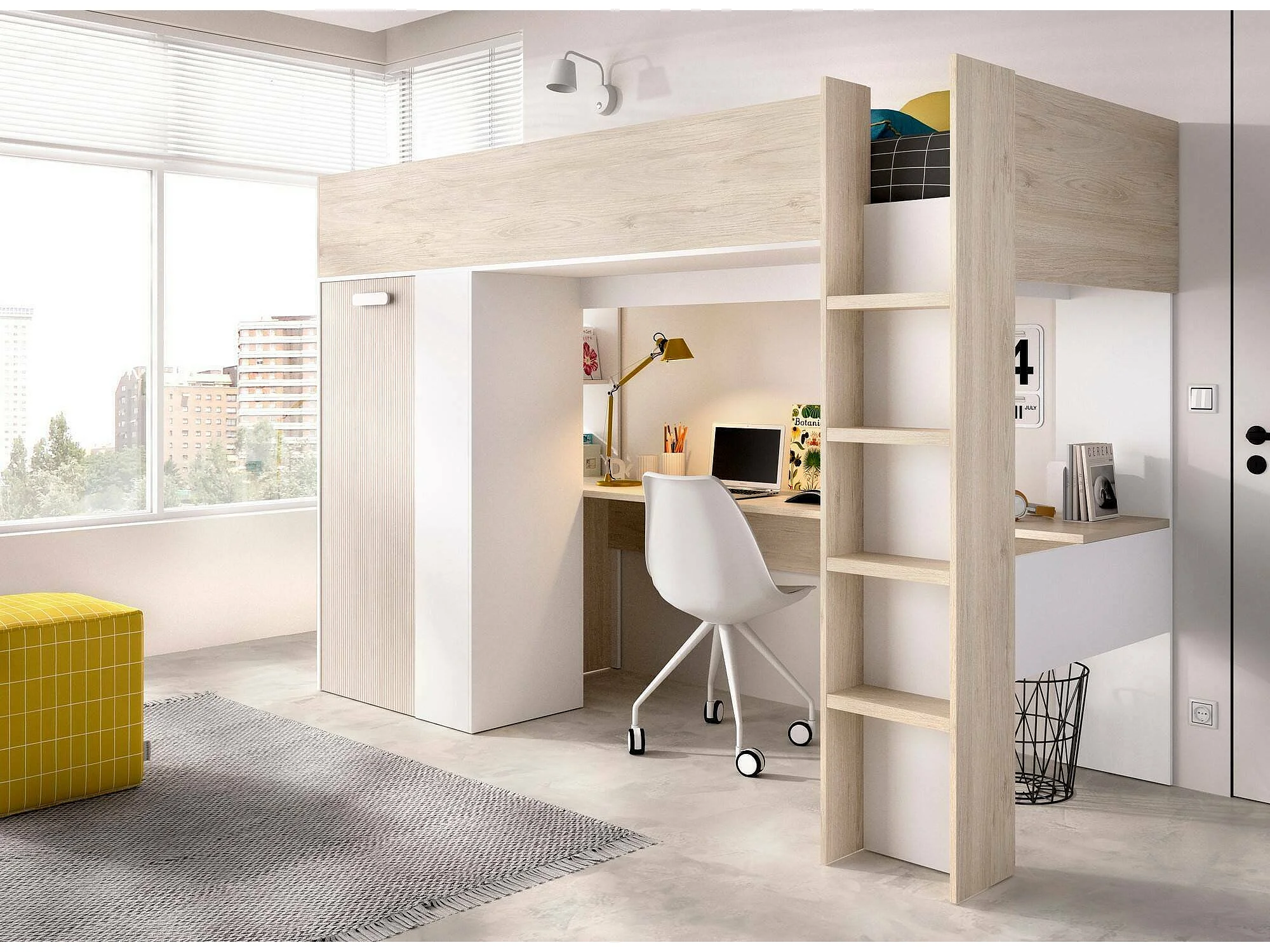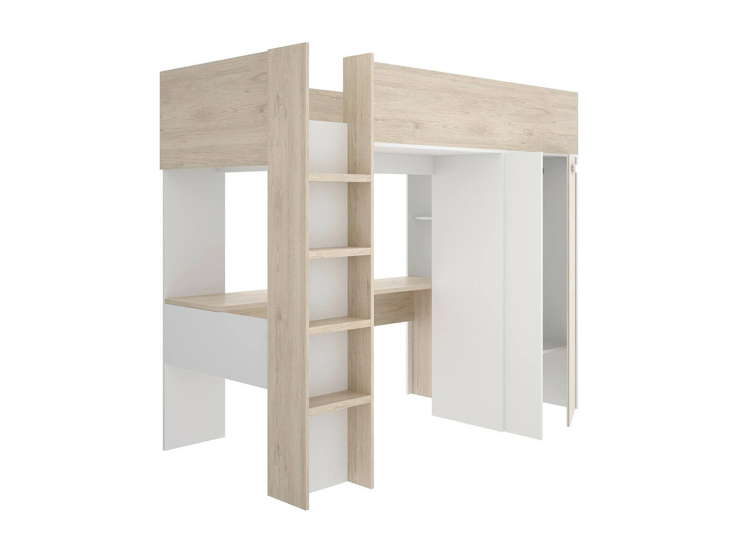 Schlafzimmer Dhovlan, Komplettes Schlafzimmer, Kinderzimmer, Loft-Bett Kit, 206x111 h178 cm, Weiß und Eiche