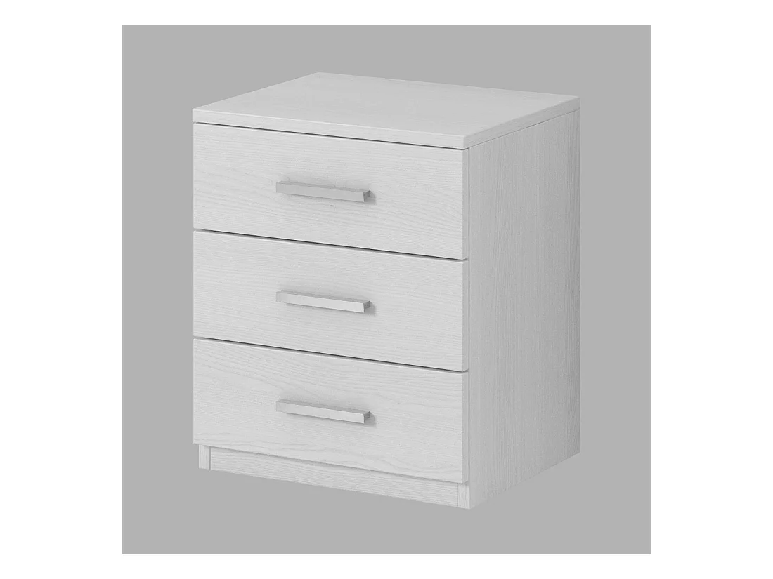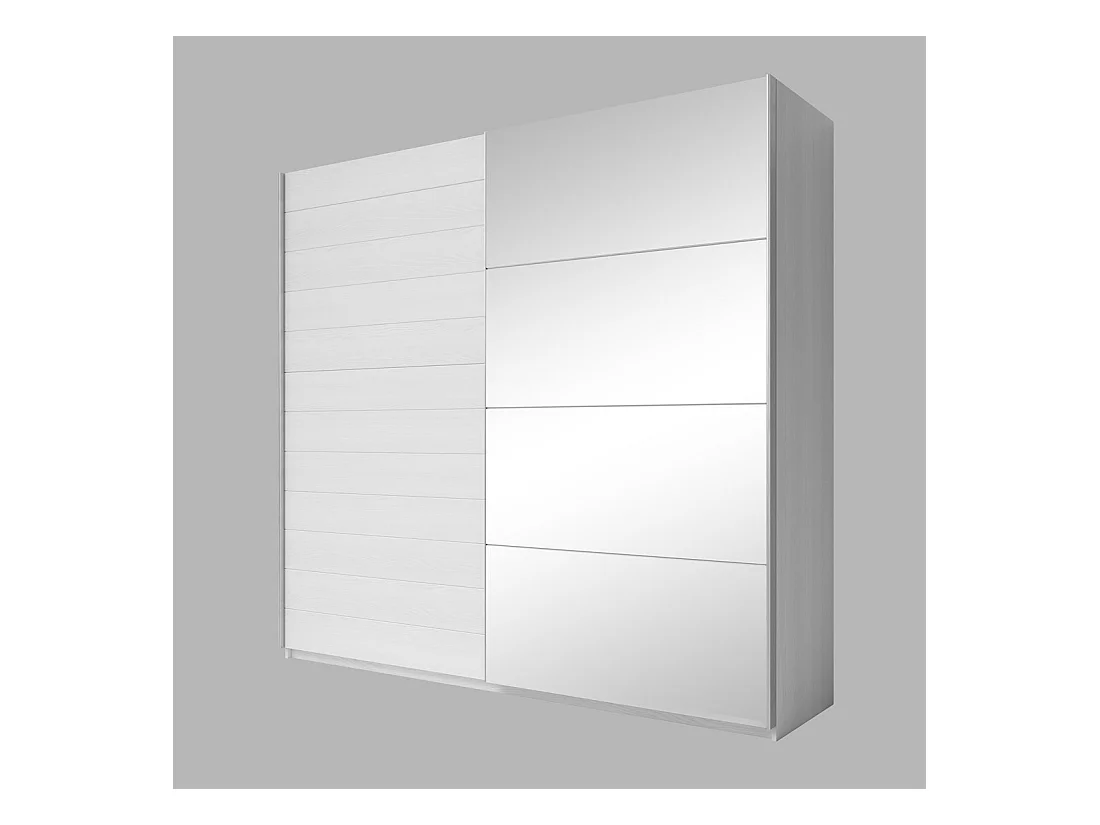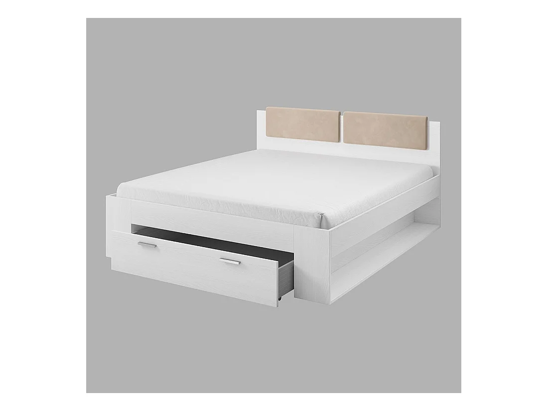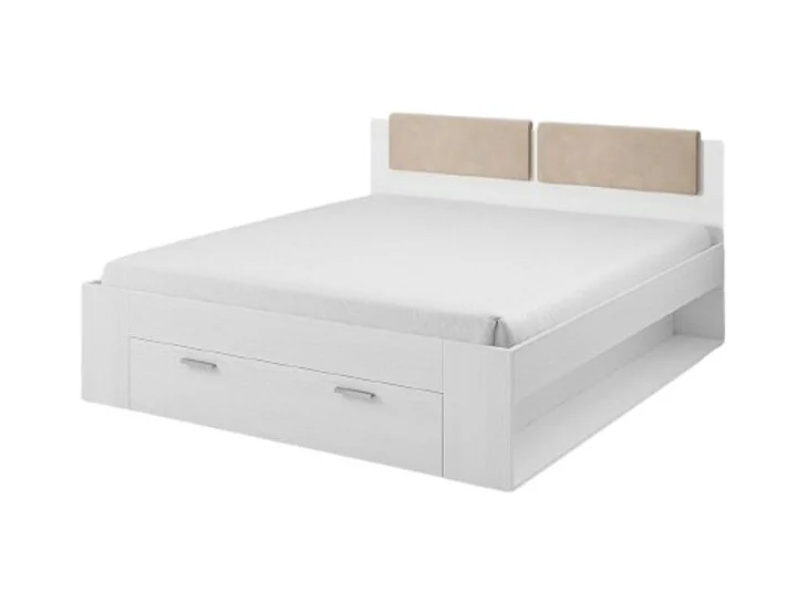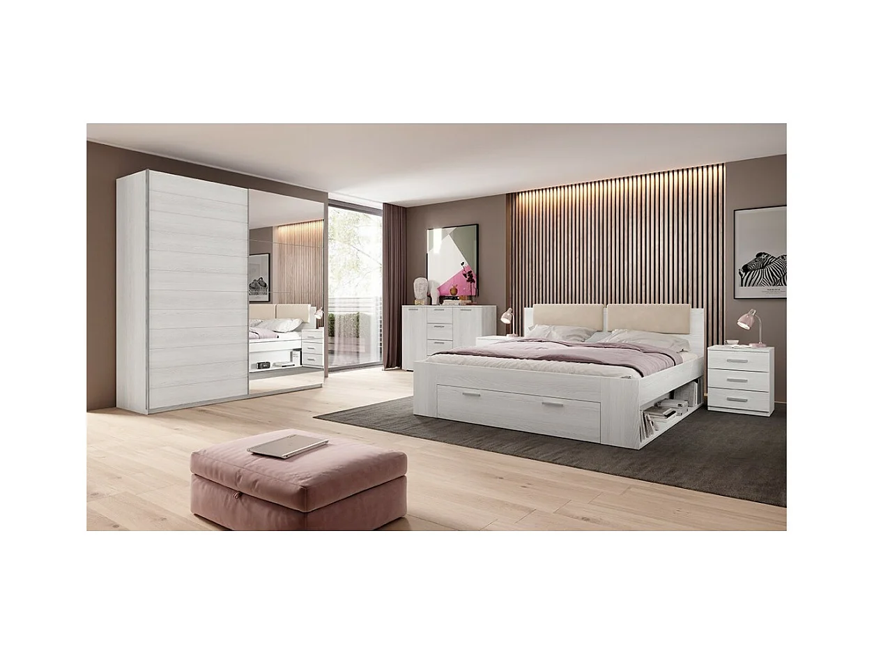 Schlafzimmer FLOYD: Kleiderschrank 220cm, Bett 140x200, Kommode, Nachttische. Farbe Weiß mit Holzeffekt.
