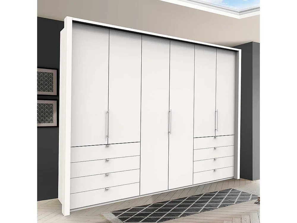 Schlafzimmerkleiderschrank in Weiß drei Falttüren und acht Schubladen
