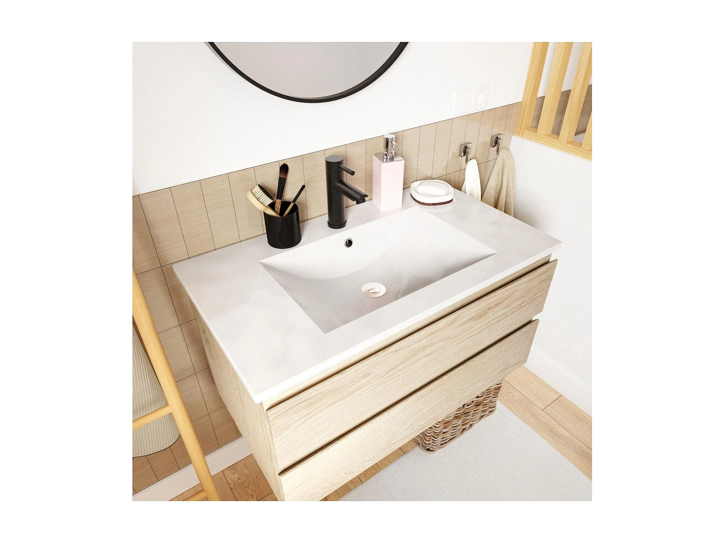 80 cm breiter Waschtisch mit Keramikplatte, Armatur, Spiegel und SORRENTO-Säule