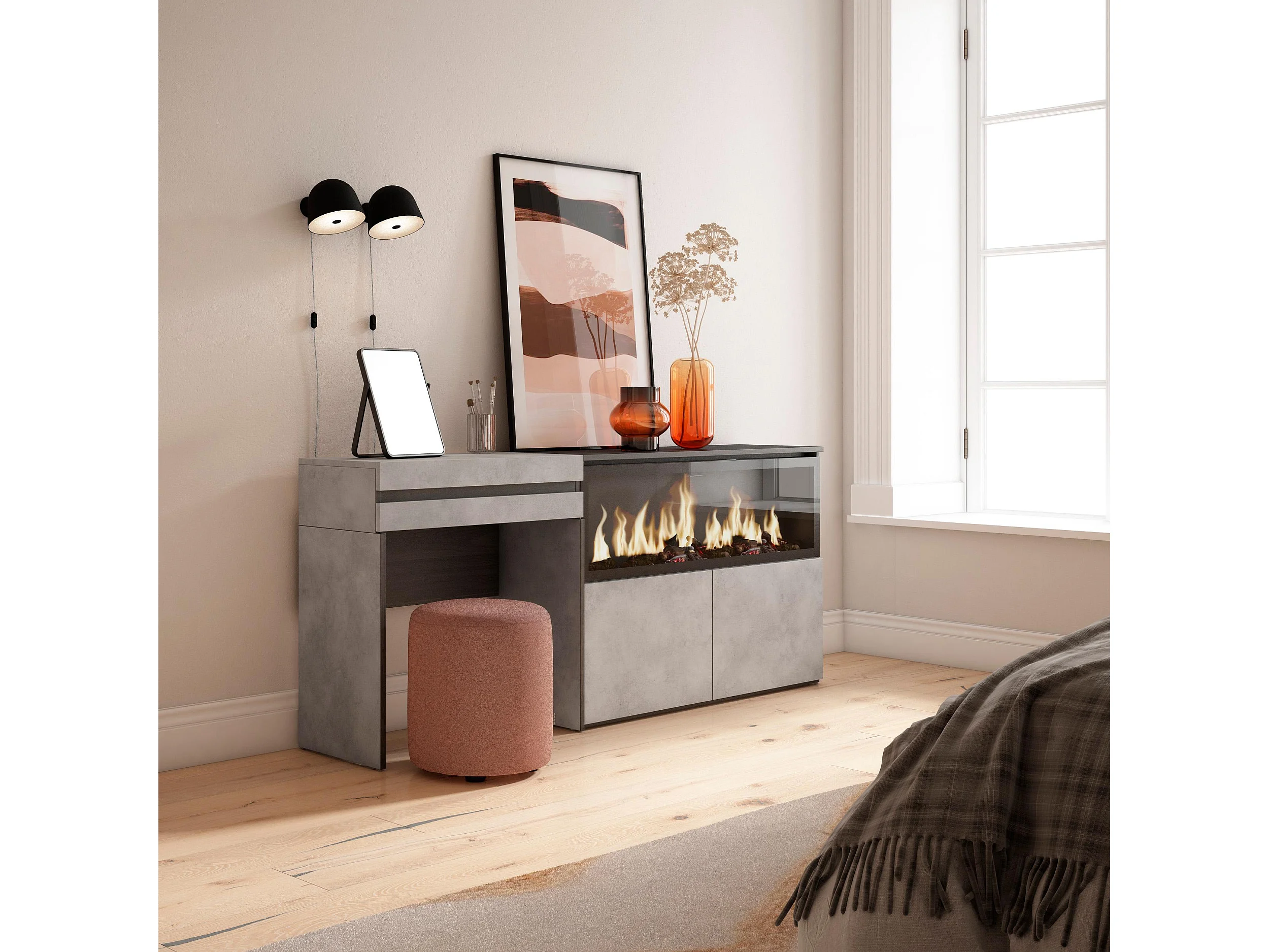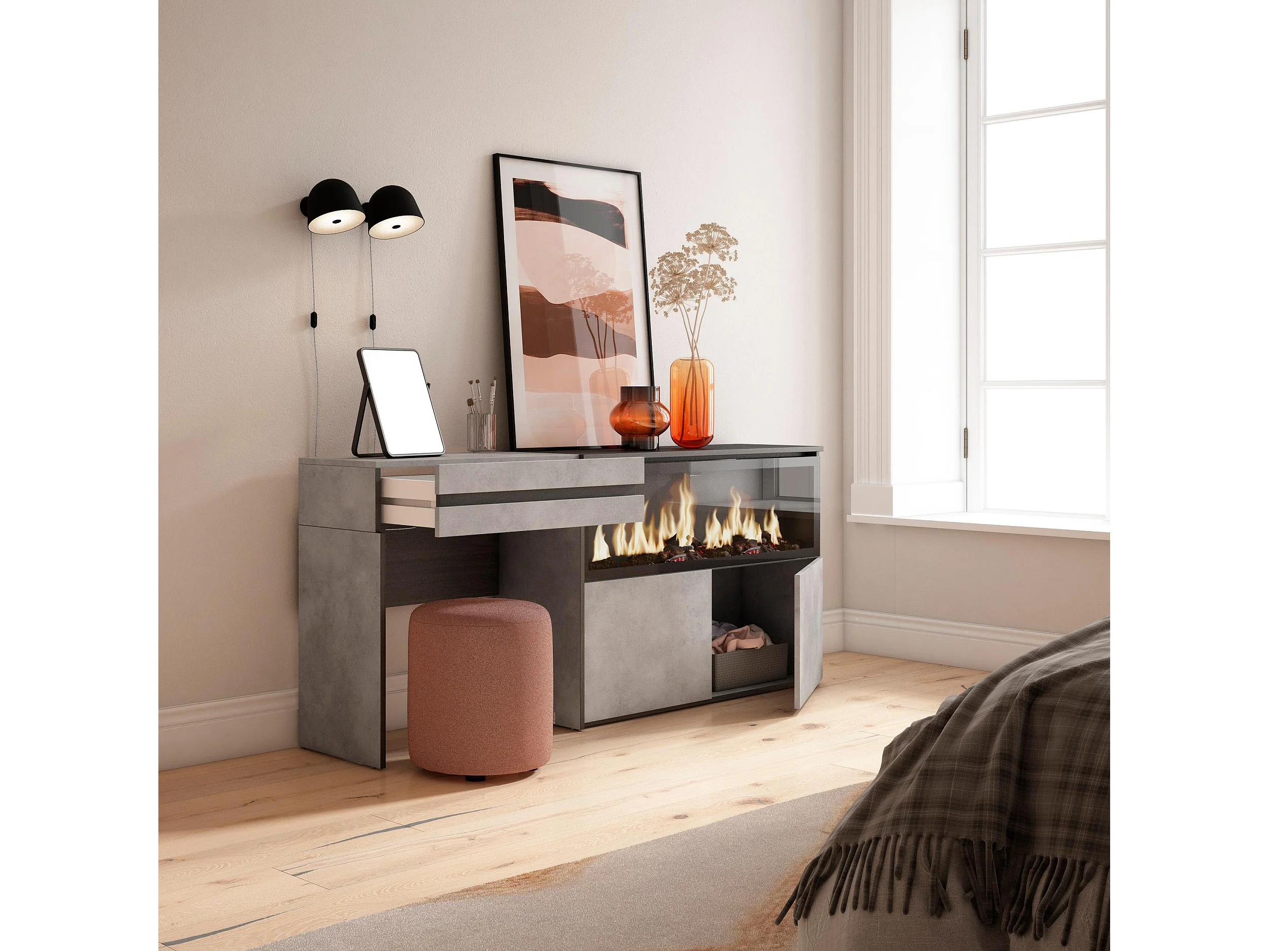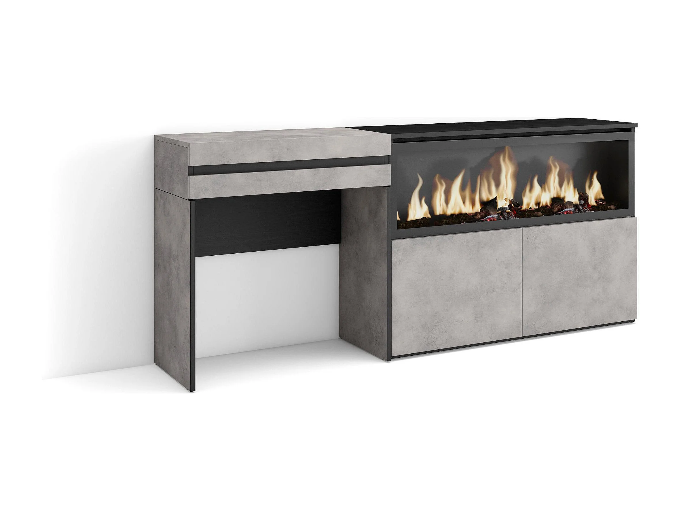Schminktisch, 177x35x75cm, mit Schublade, Elektrokamin XXL, Zement