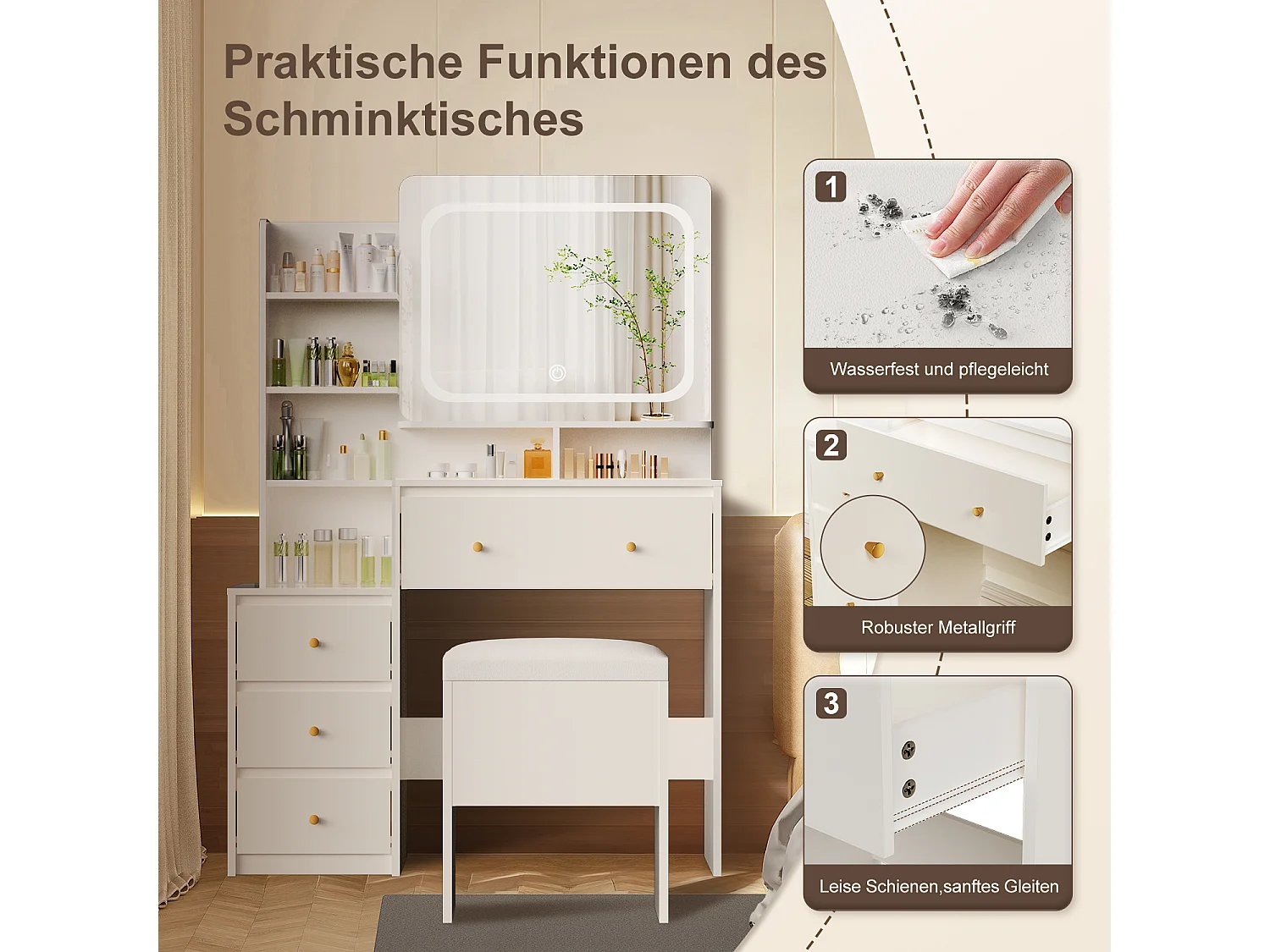 Coiffeuse avec éclairage LED - 92,6 x 132 x 36 cm - Blanc - avec 1 tabouret blanc