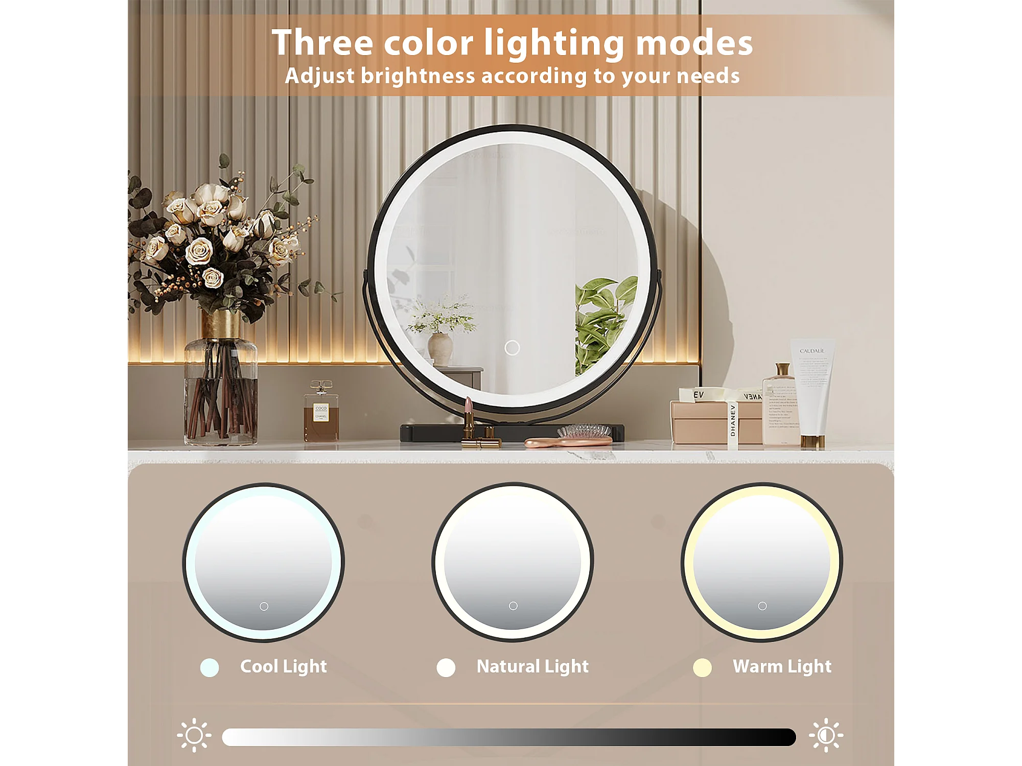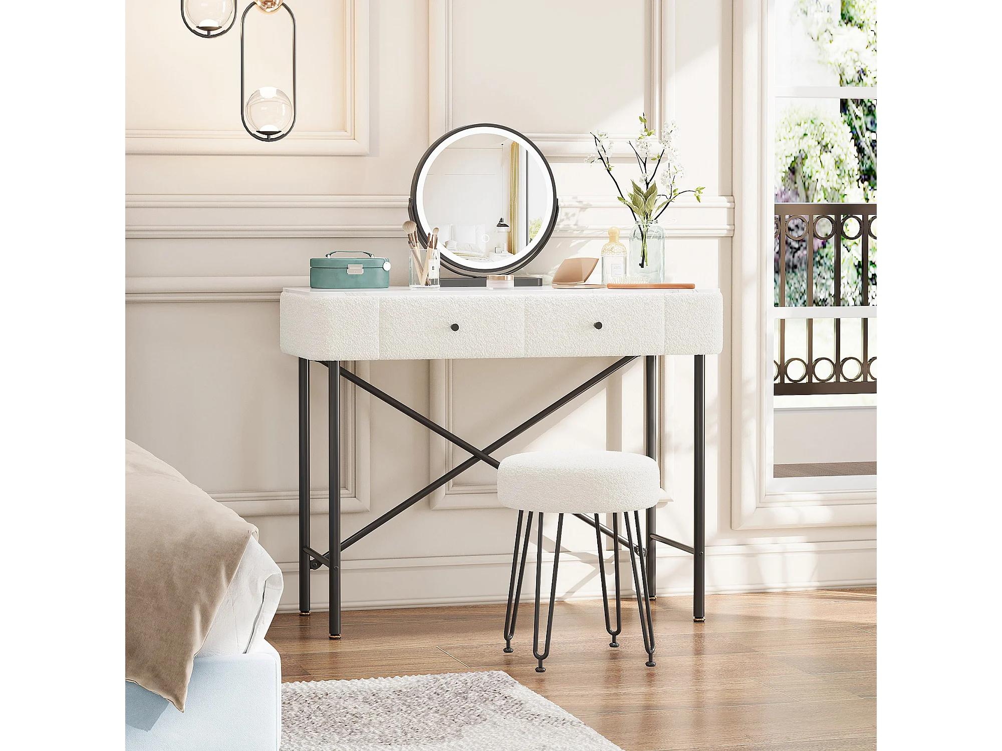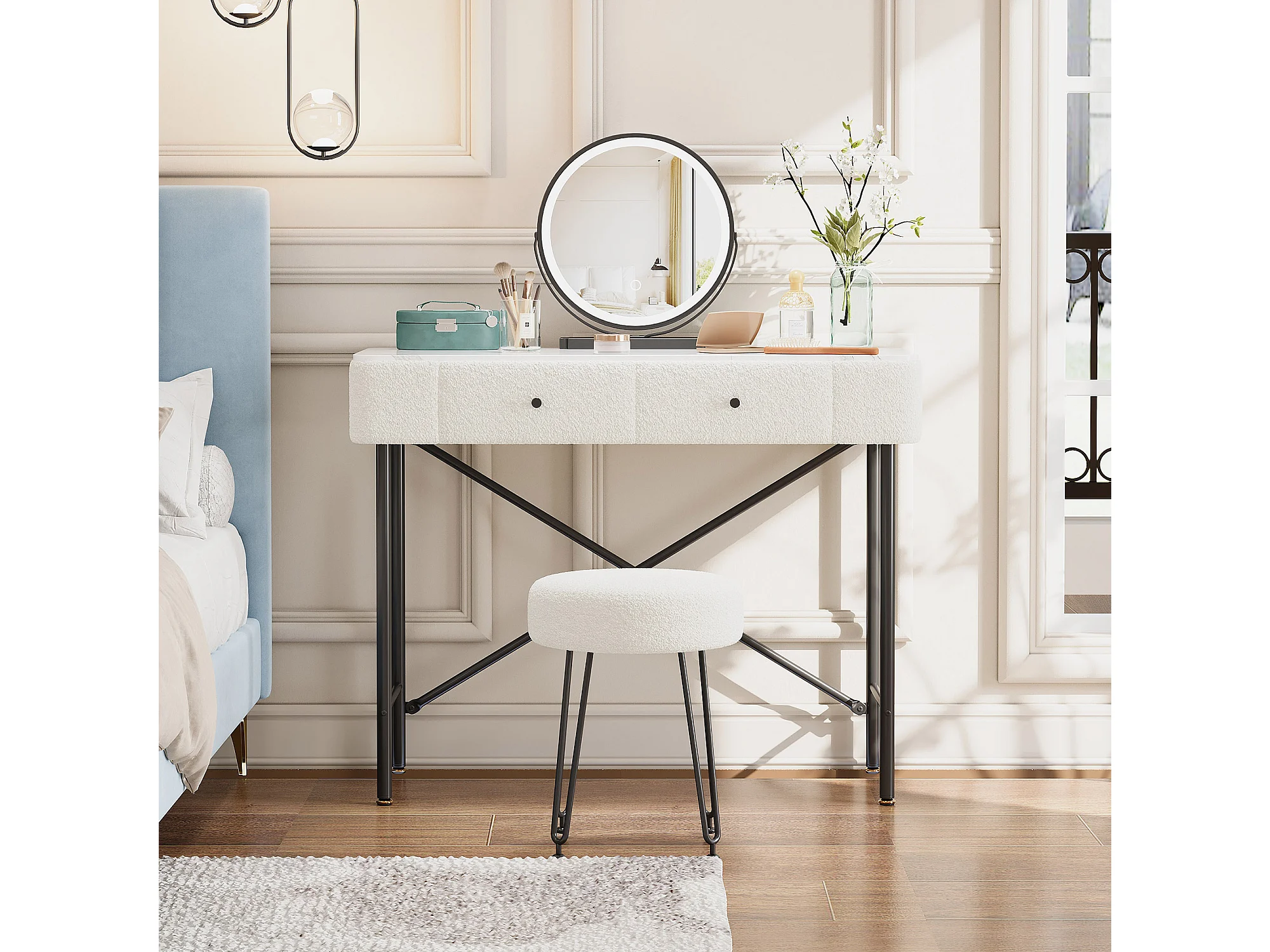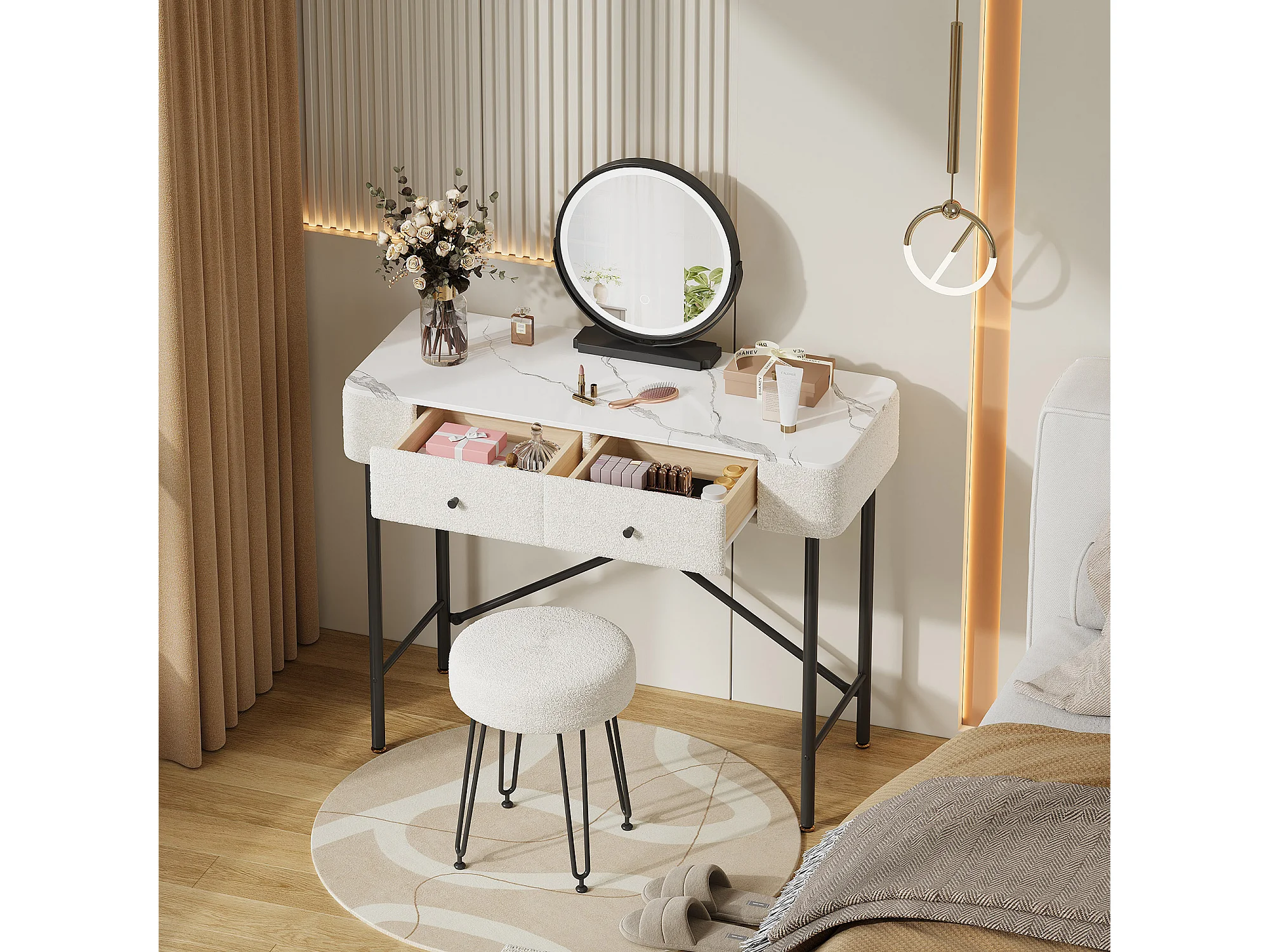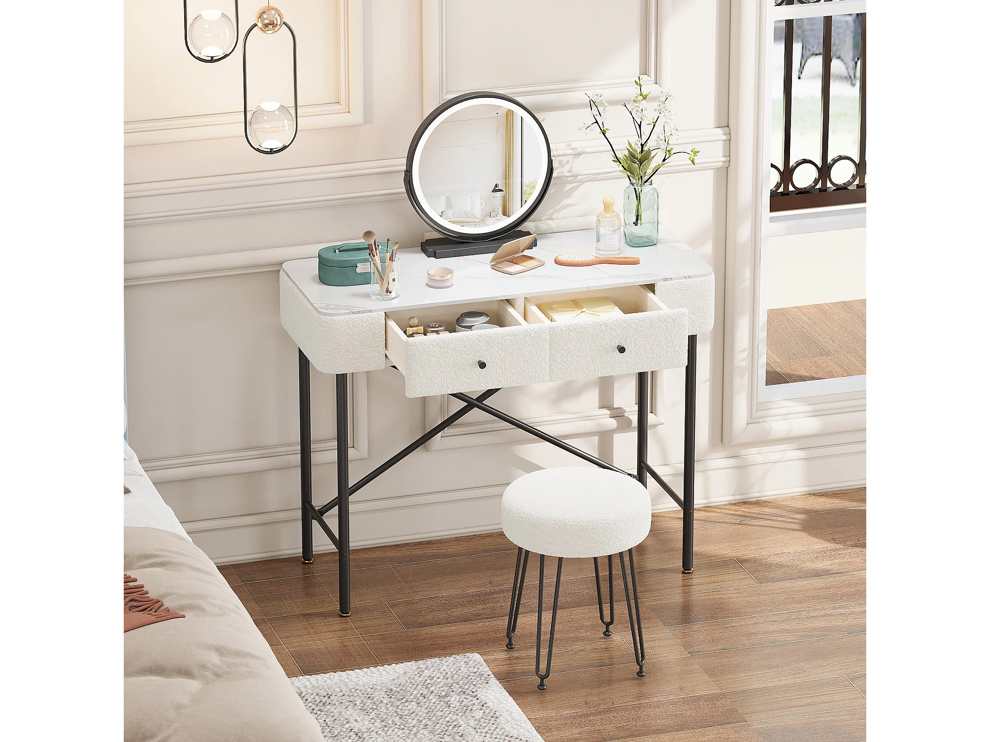 Schminktisch mit Marmoroptik-Platte – 100 x 40 x 120 cm – mit Hocker, LED-Spiegel und 2 Schubladen – Spanplatte – weiß