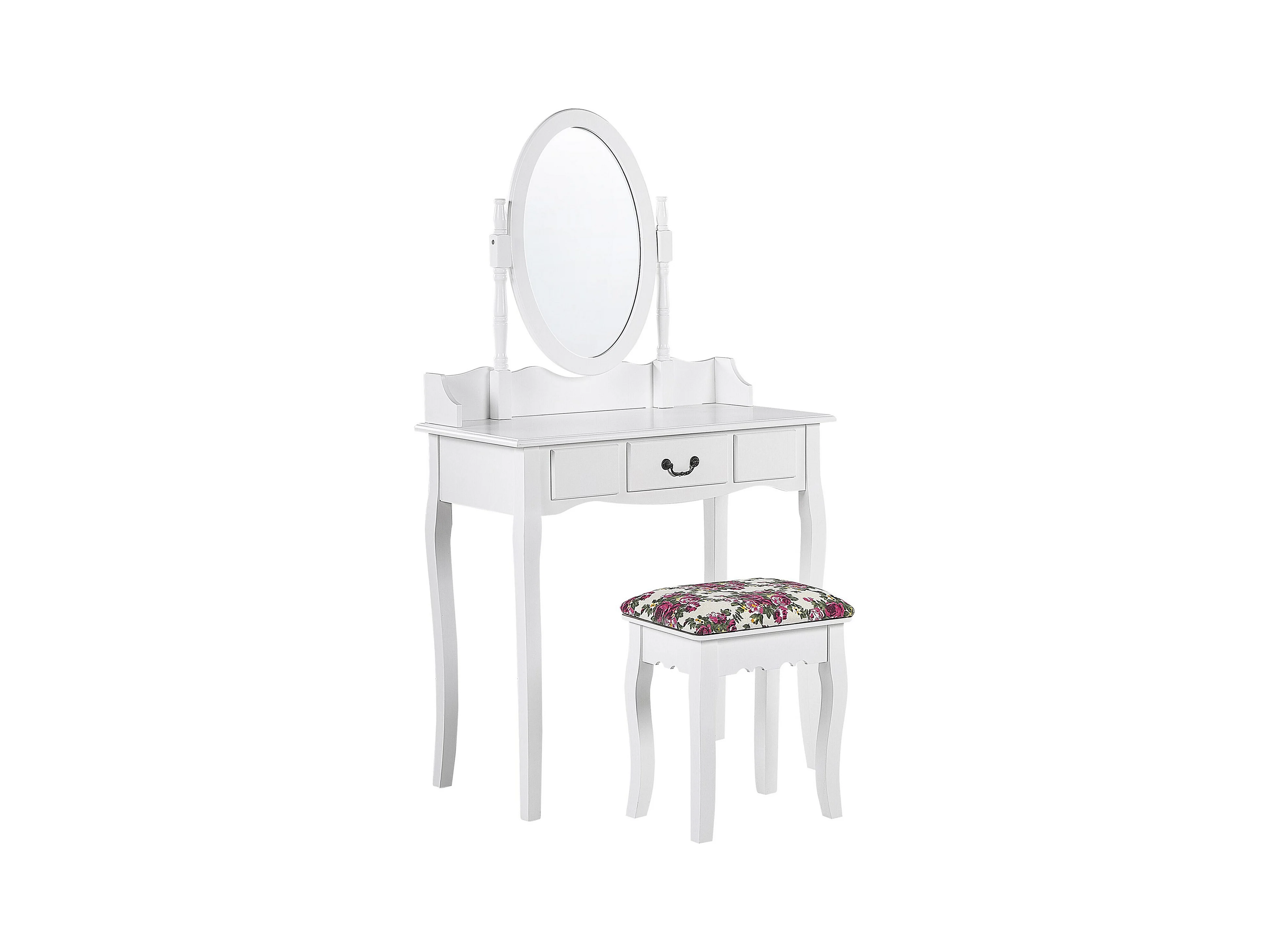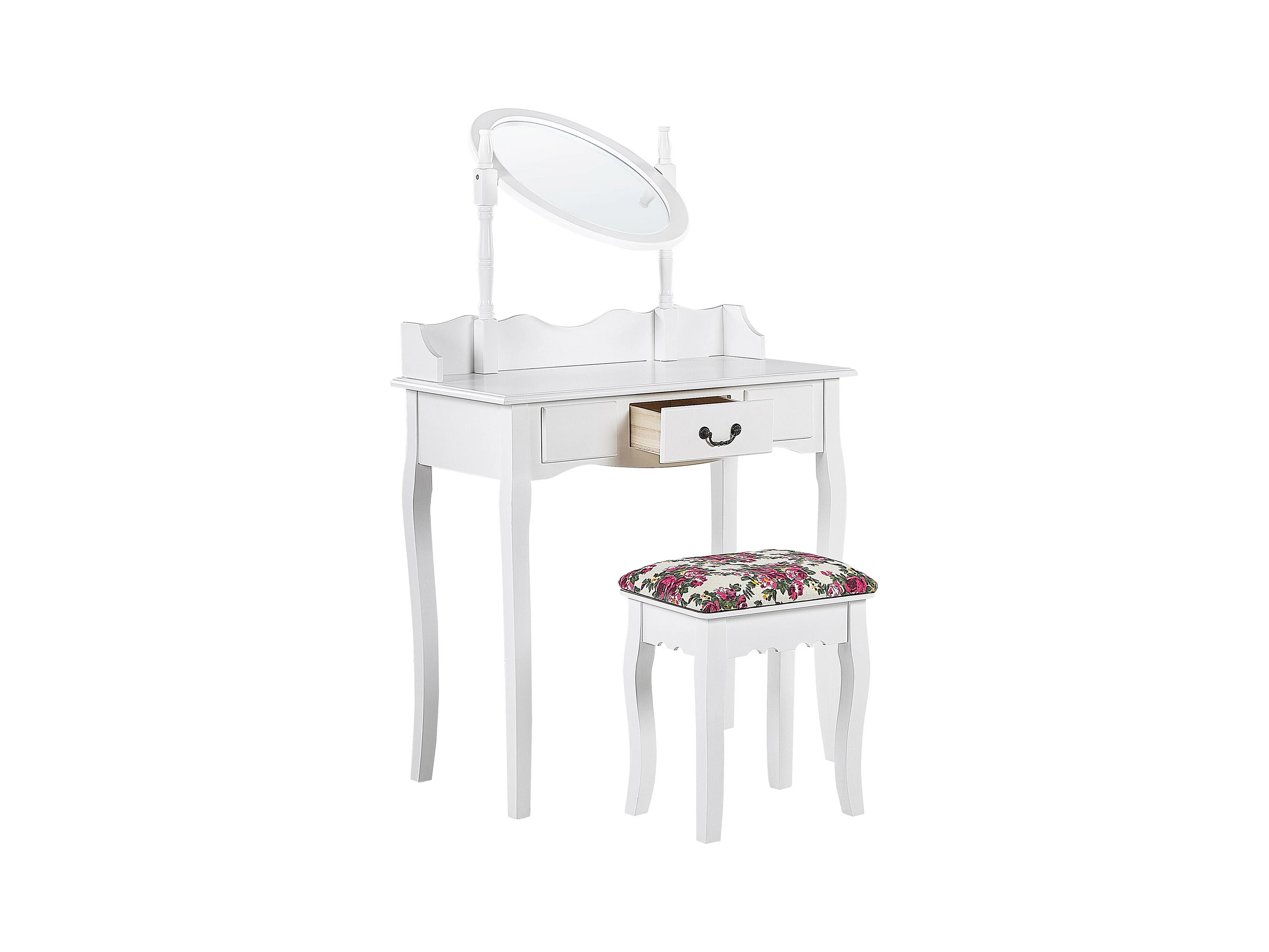 Weißer Schminktisch mit praktischem Hocker, ovalem Spiegel, 1 Schublade Soleil