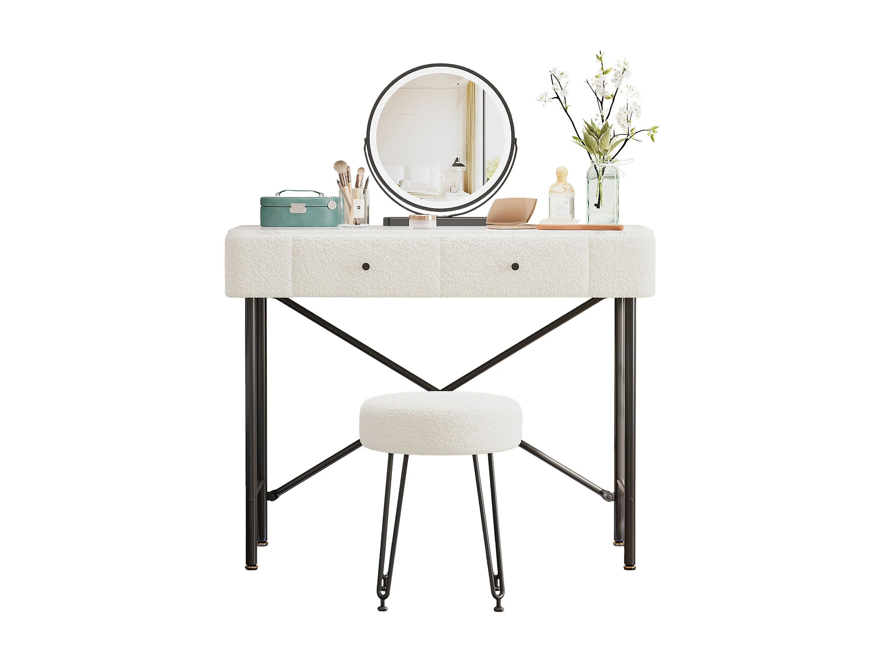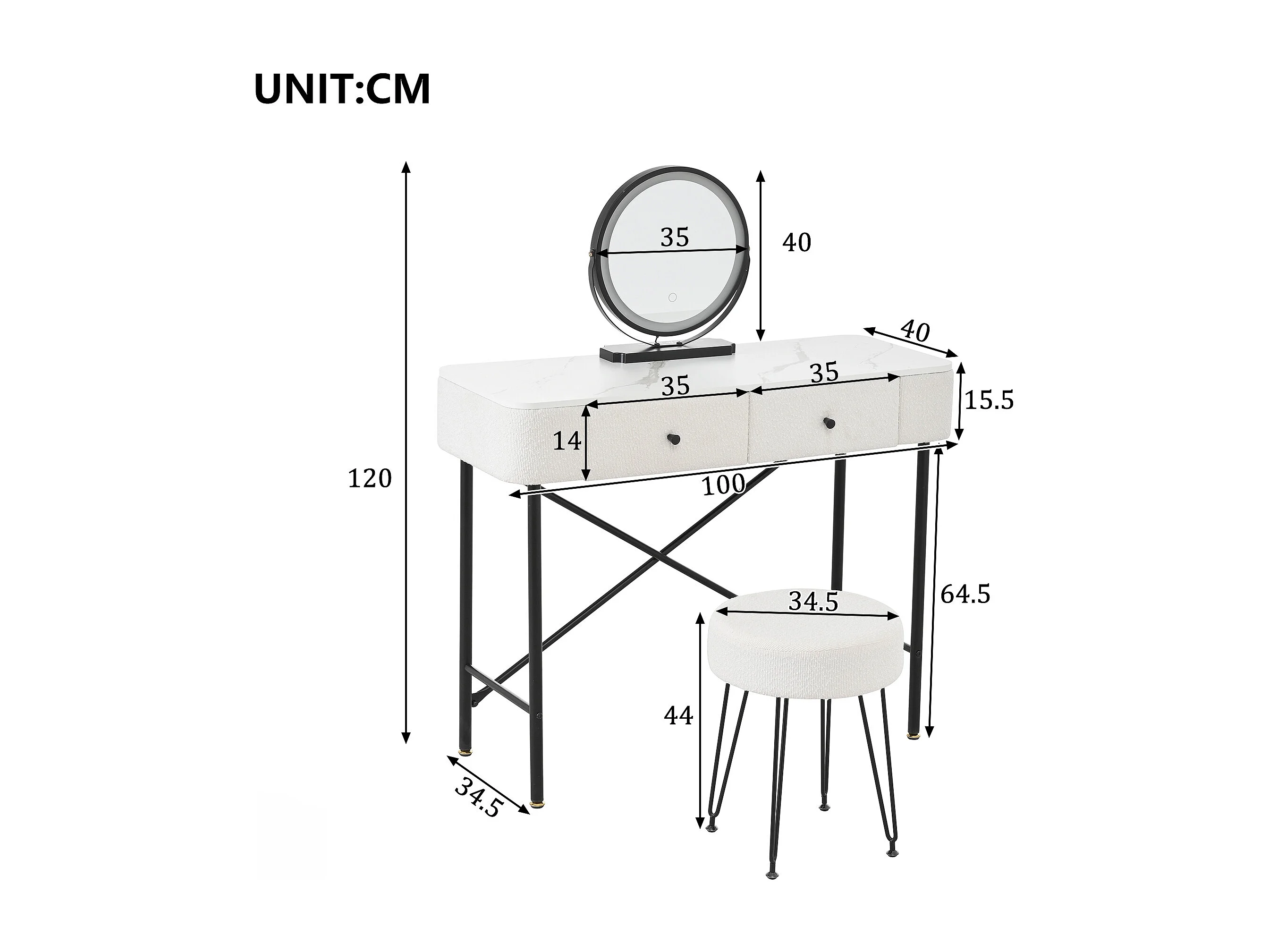 Schminktisch mit Spiegel 100x40x120cm - mit verstellbarer LED - mit 1 Hocker - mit 2 Schubladen - Marmoroptik - Weiß + Schwarz
