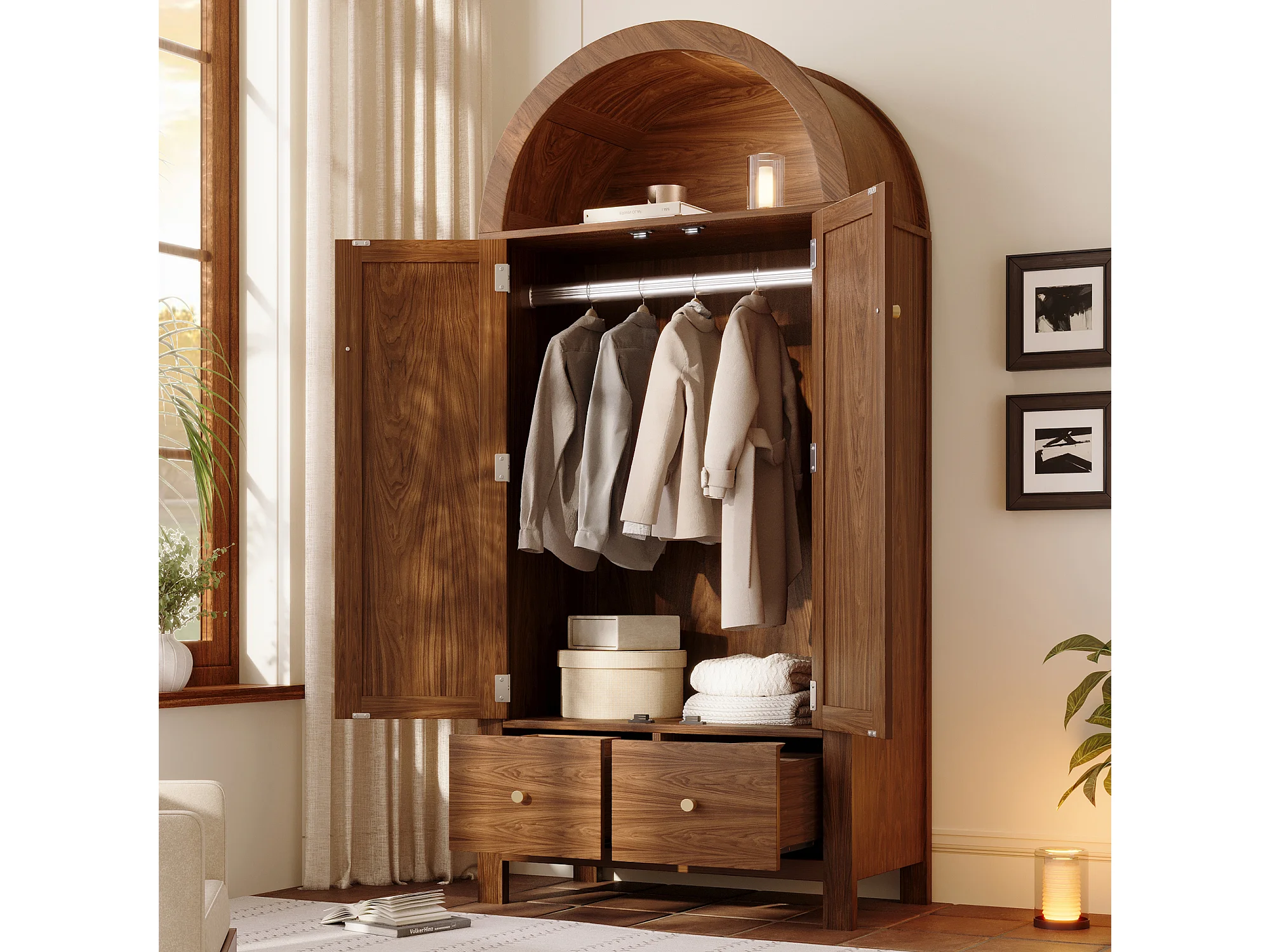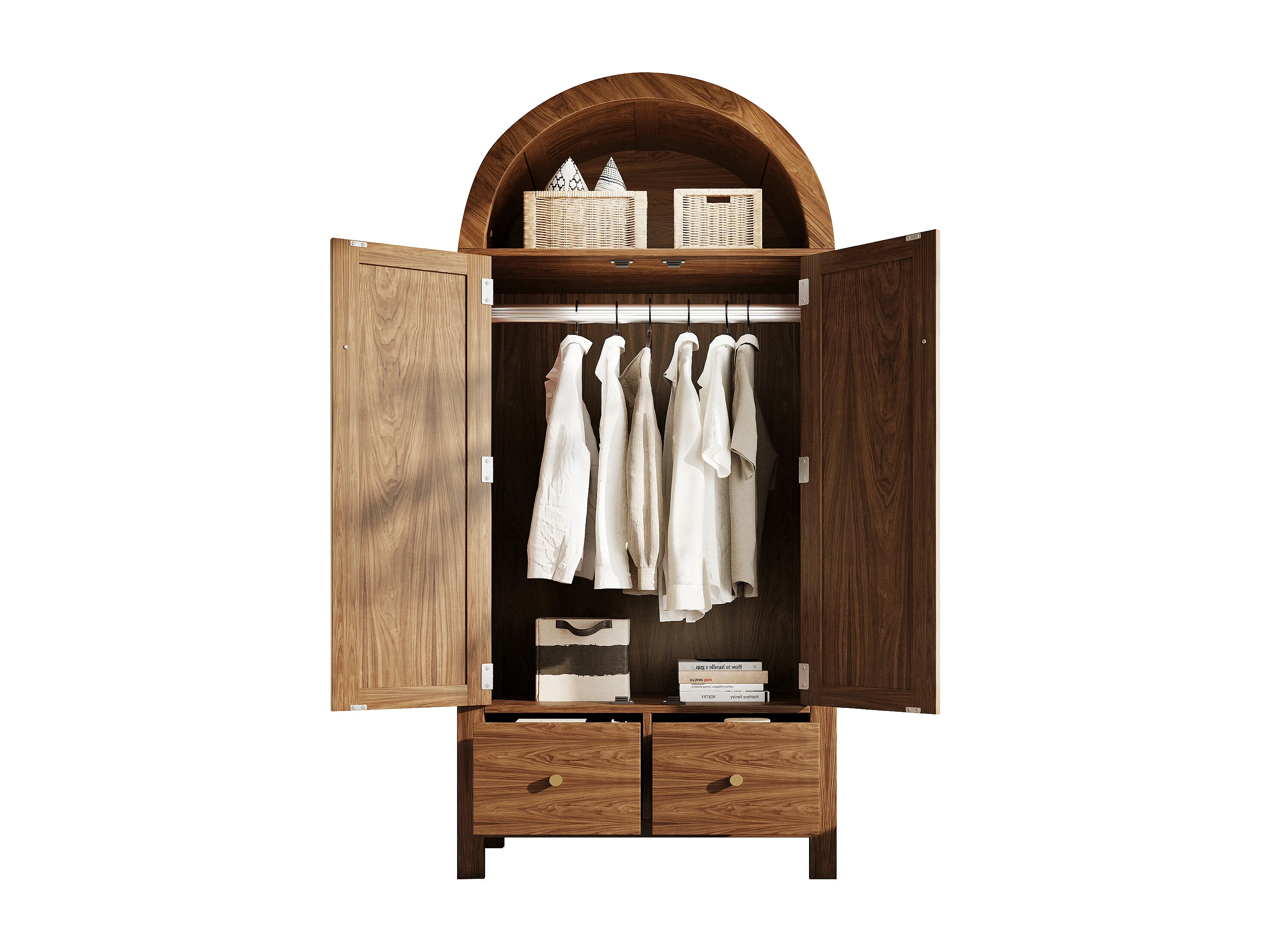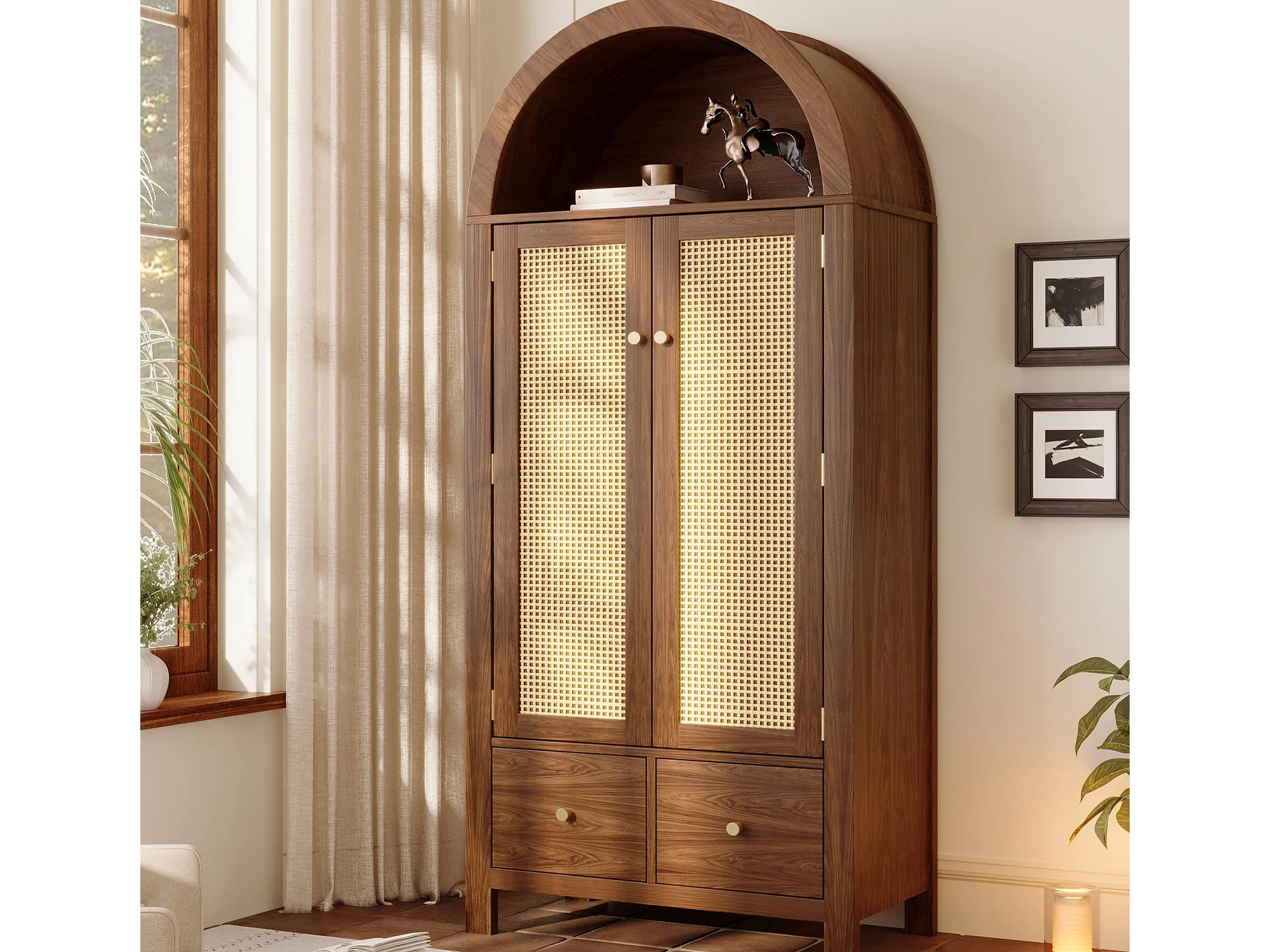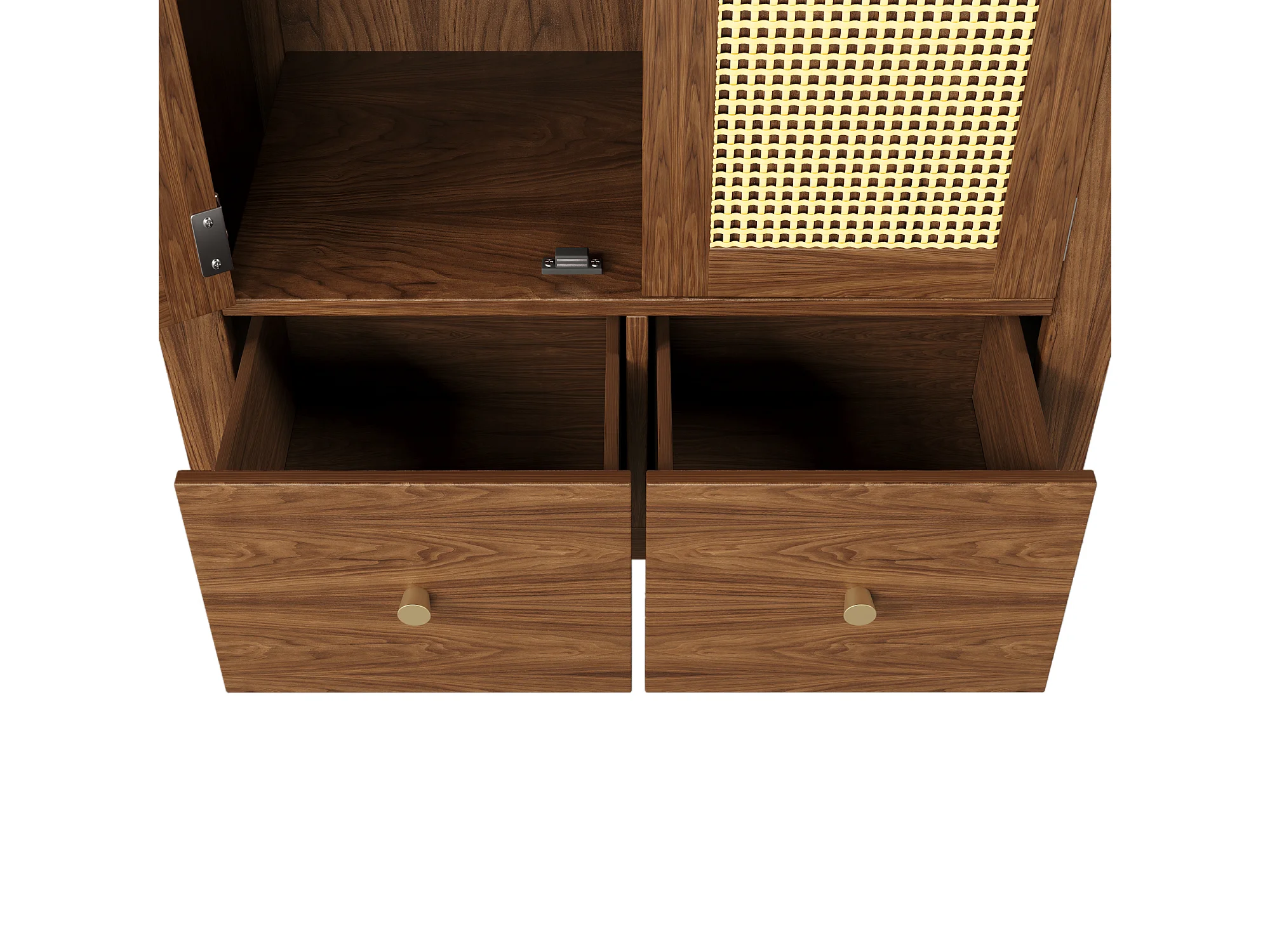 Schrank 78x45x181cm - Offene Regale und Kleiderstangen - mit 2 Rattantüren und 2 Schubladen - Landhausstil - Nussbaumholzfarbe