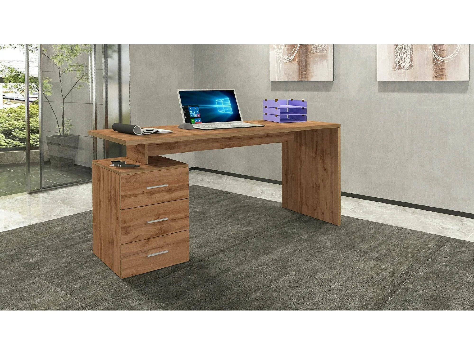 Schreibtisch Dchiellin, linearer Schreibtisch, Mehrzweck-Büroschreibtisch, platzsparender Schreibtisch mit mehreren Positionen, 160x60h75 cm, Eiche