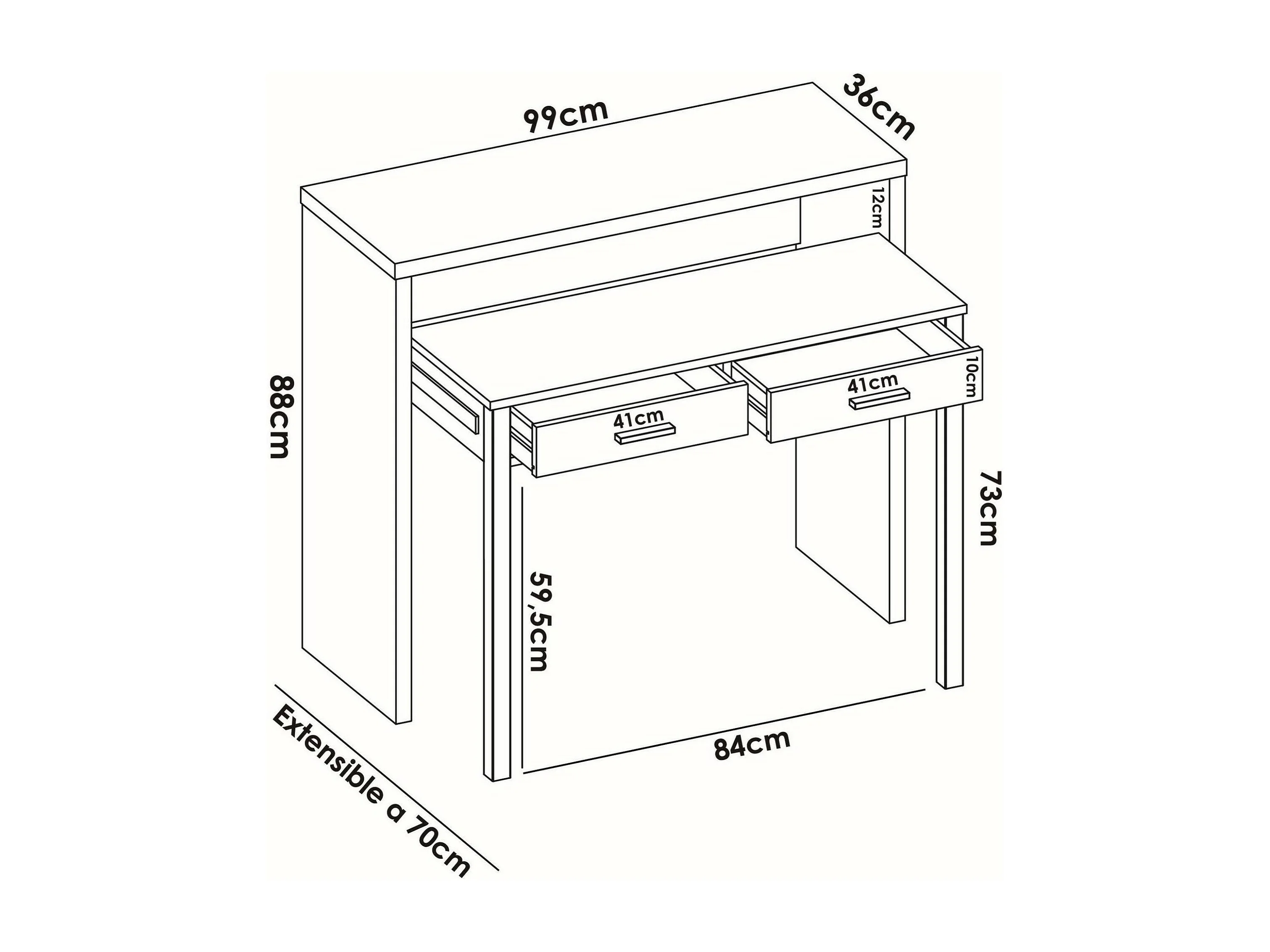 Schreibtisch Dghelle, Multipositionsschreibtisch mit ausziehbarer Platte, lineare Arbeitskonsole mit 2 Schubladen, 99 x 70 x 88 cm, Weiß