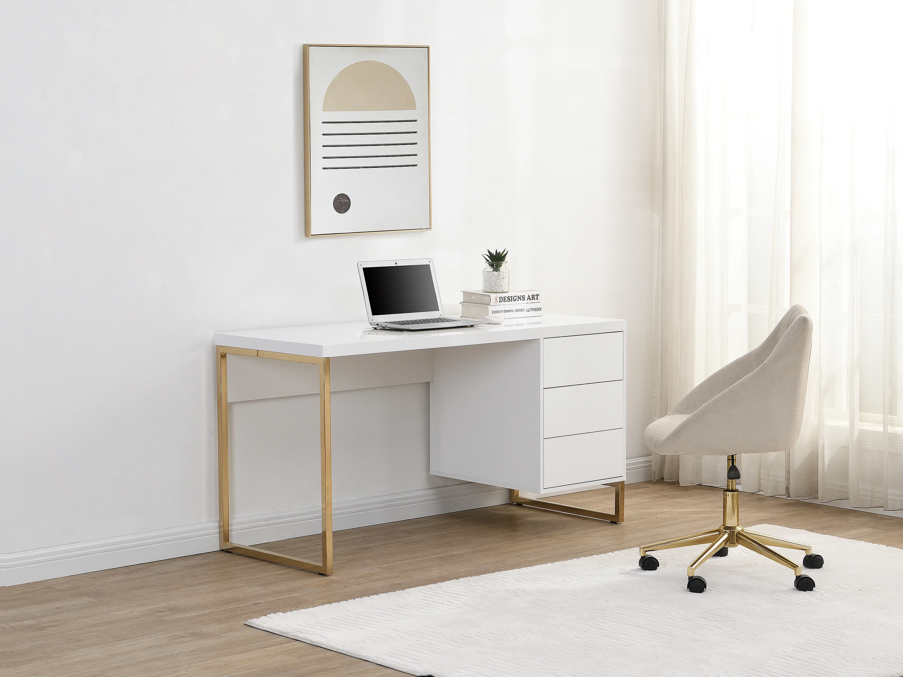 Schreibtisch mit 3 Schubladen - MDF lackiert & Metall - Weiß & Goldfarben - TIMFIA von Pascal Morabito