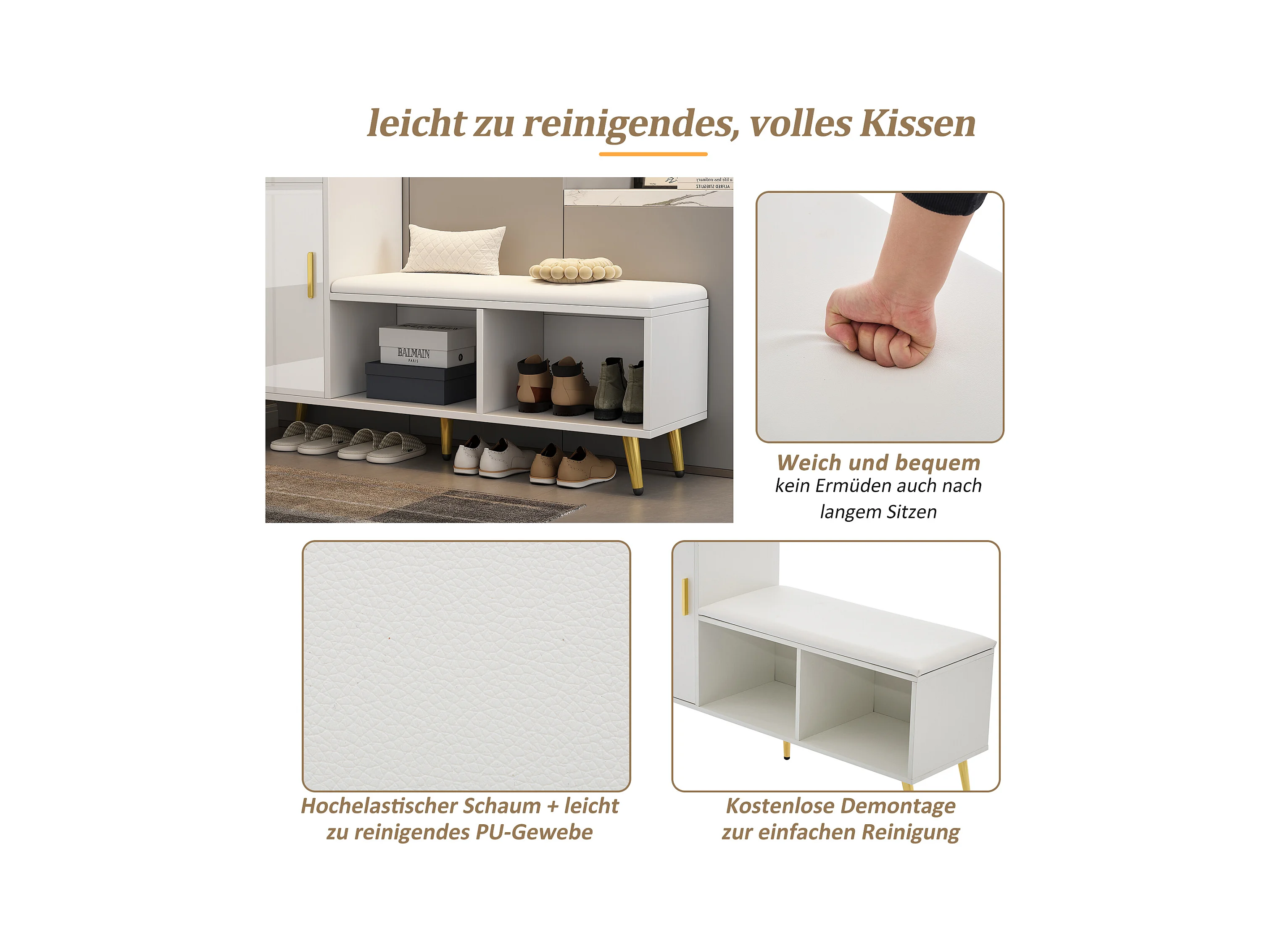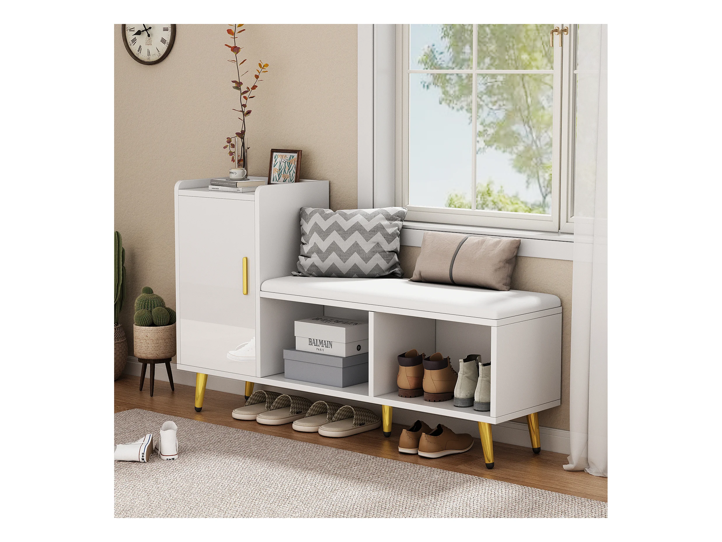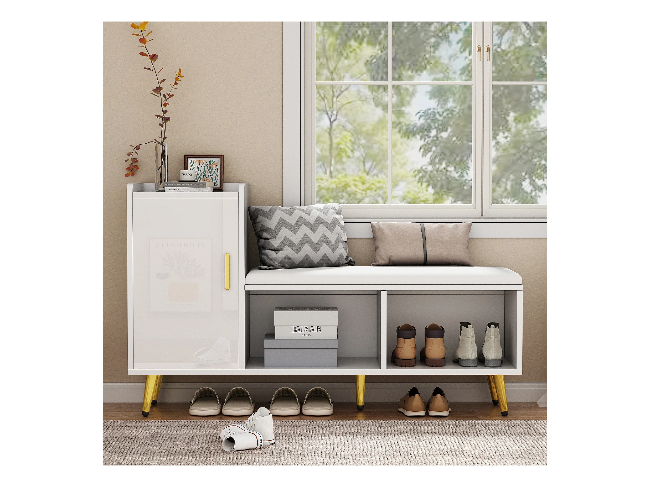 Schuhbank mit 1 Tür, 2 Nischen und Kissen - goldene Metallbeine und Griffe - Weiß - 120 x 35 x 68,5 cm