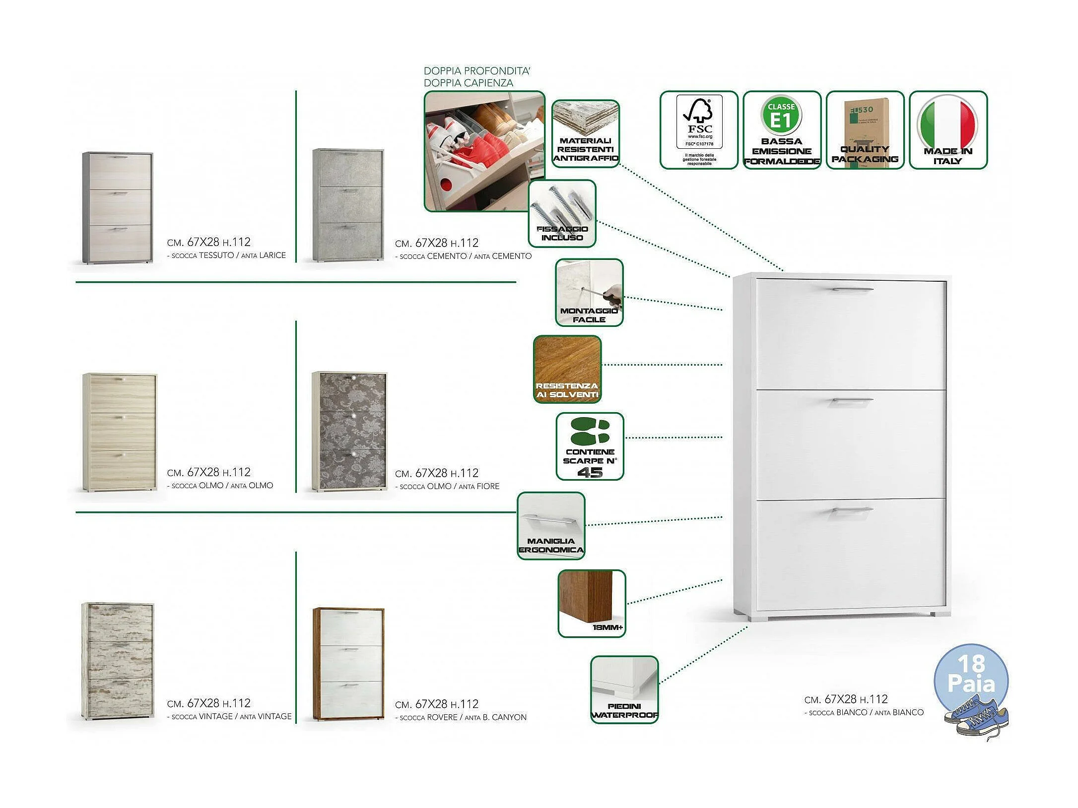 Schuhregal Dlos, Mehrzweck - Eingangsmöbel mit 3 Klapptüren, Schuhschrank mit doppelter Tiefe, 100% Made in Italy, 67x28h112 cm, Weiß