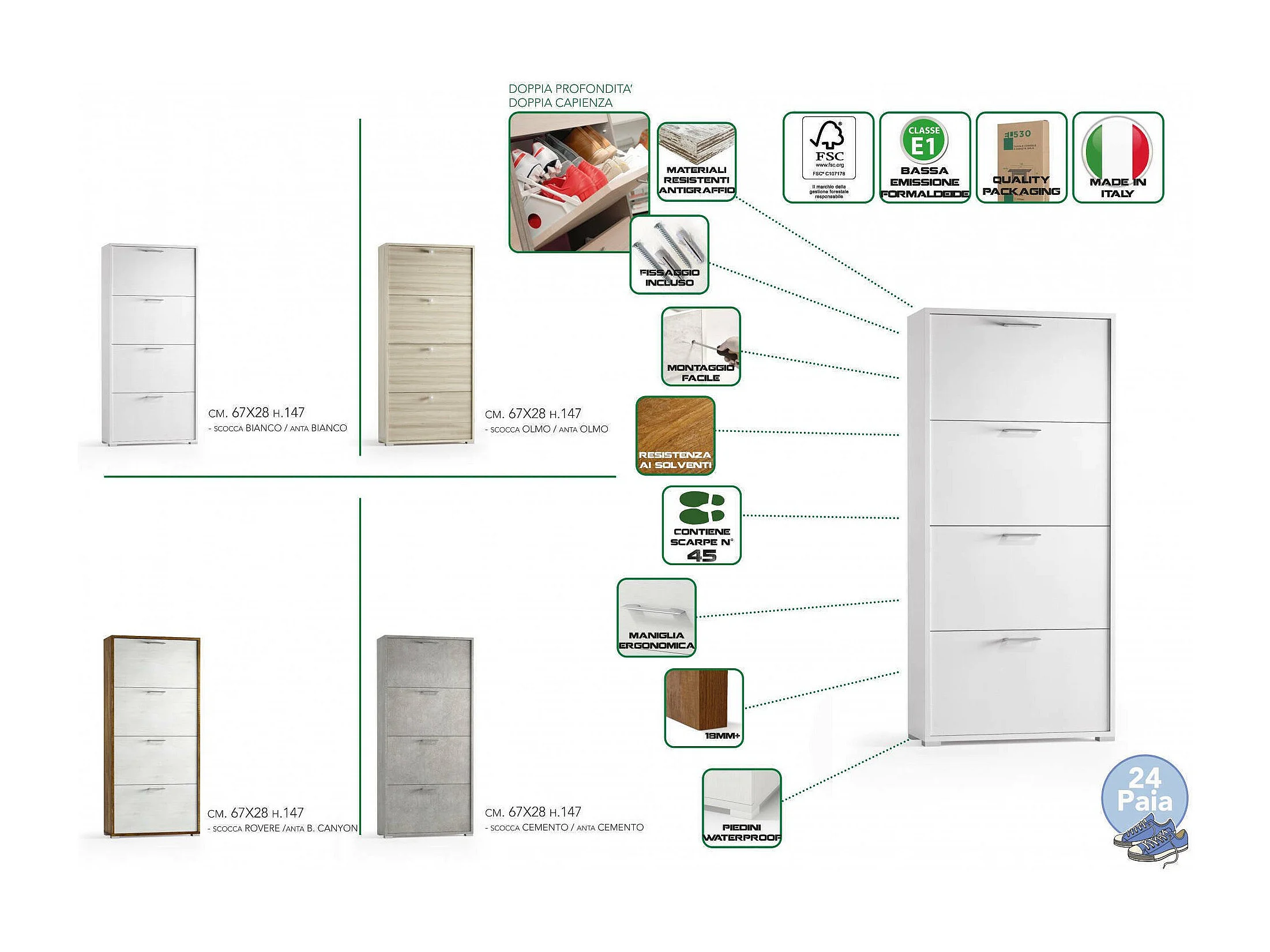 Schuhregal Rosa, Mehrzweck-Eingangsmöbel mit 4 Falttüren, Schuhschrank mit doppelter Tiefe, 100 % Made in Italy, 67 x 28 x 147 cm, Weiß,