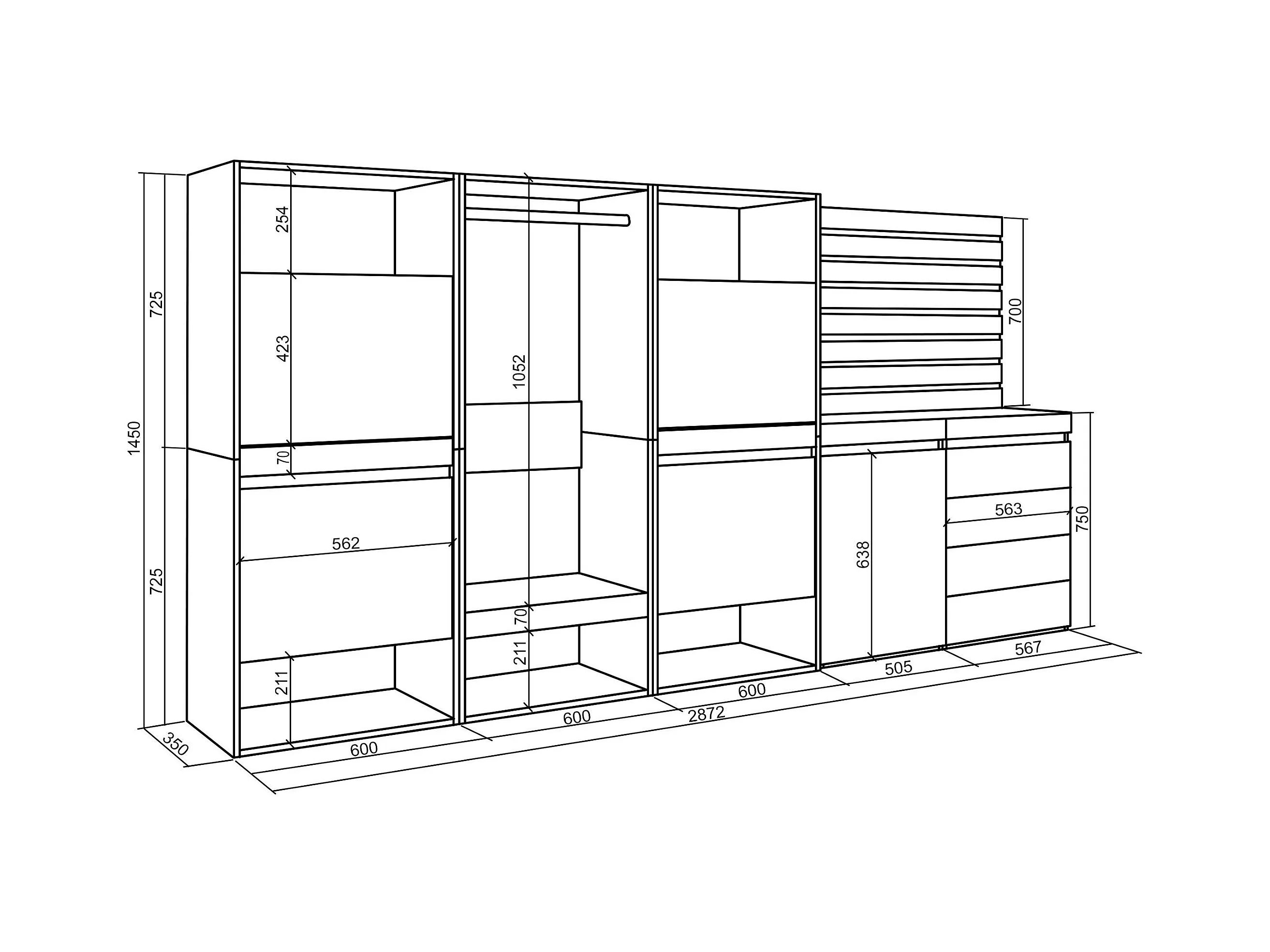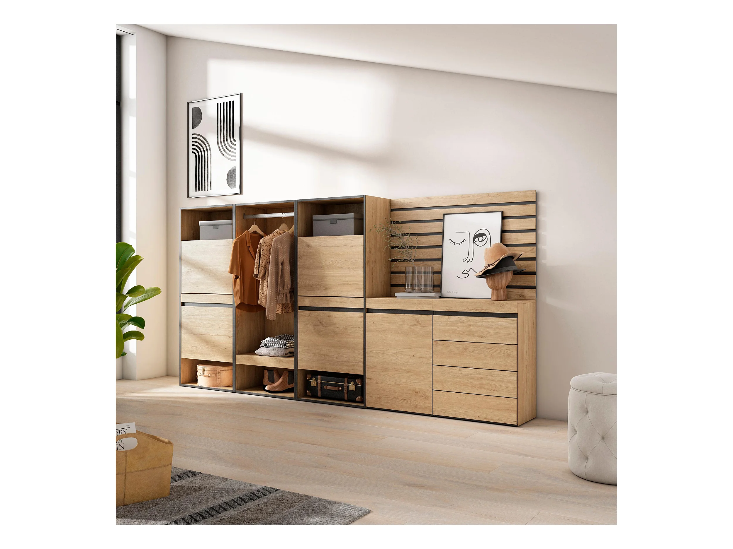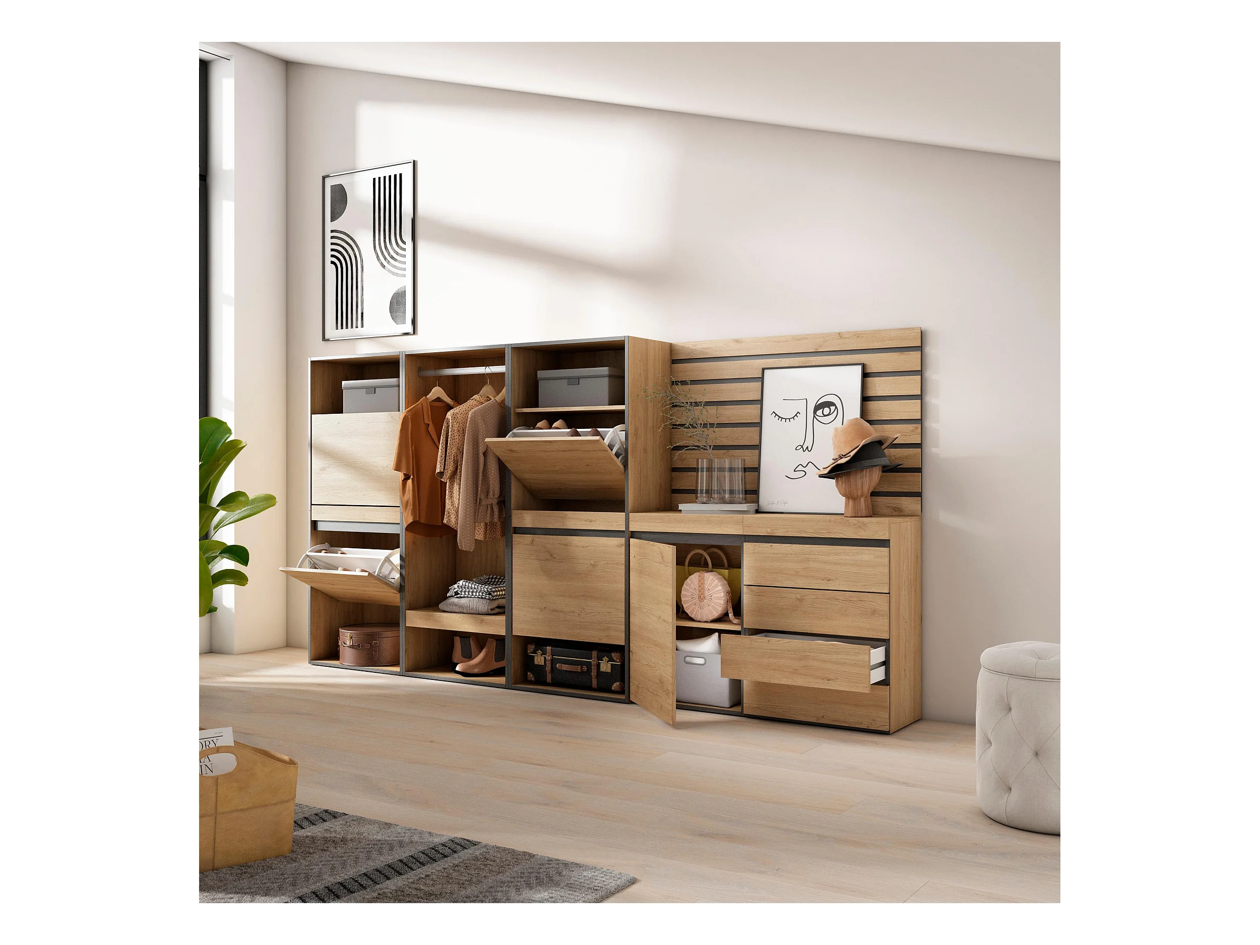 Schuhregal, Schuhschrank, 287x35x145cm, Für Schlafzimmer, Offener Kleiderschrank, Kommode mit Schubladen, Lamellenwand Holz, Eiche