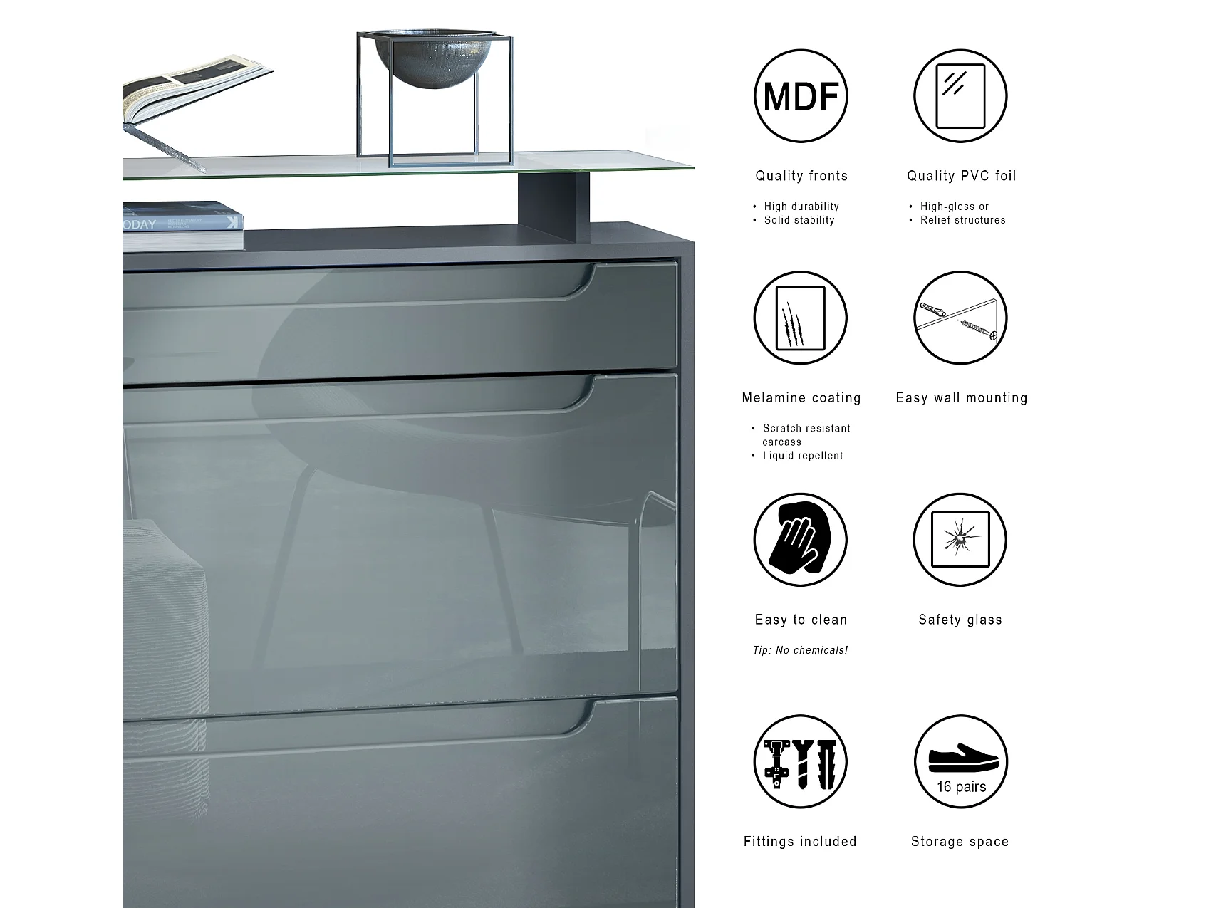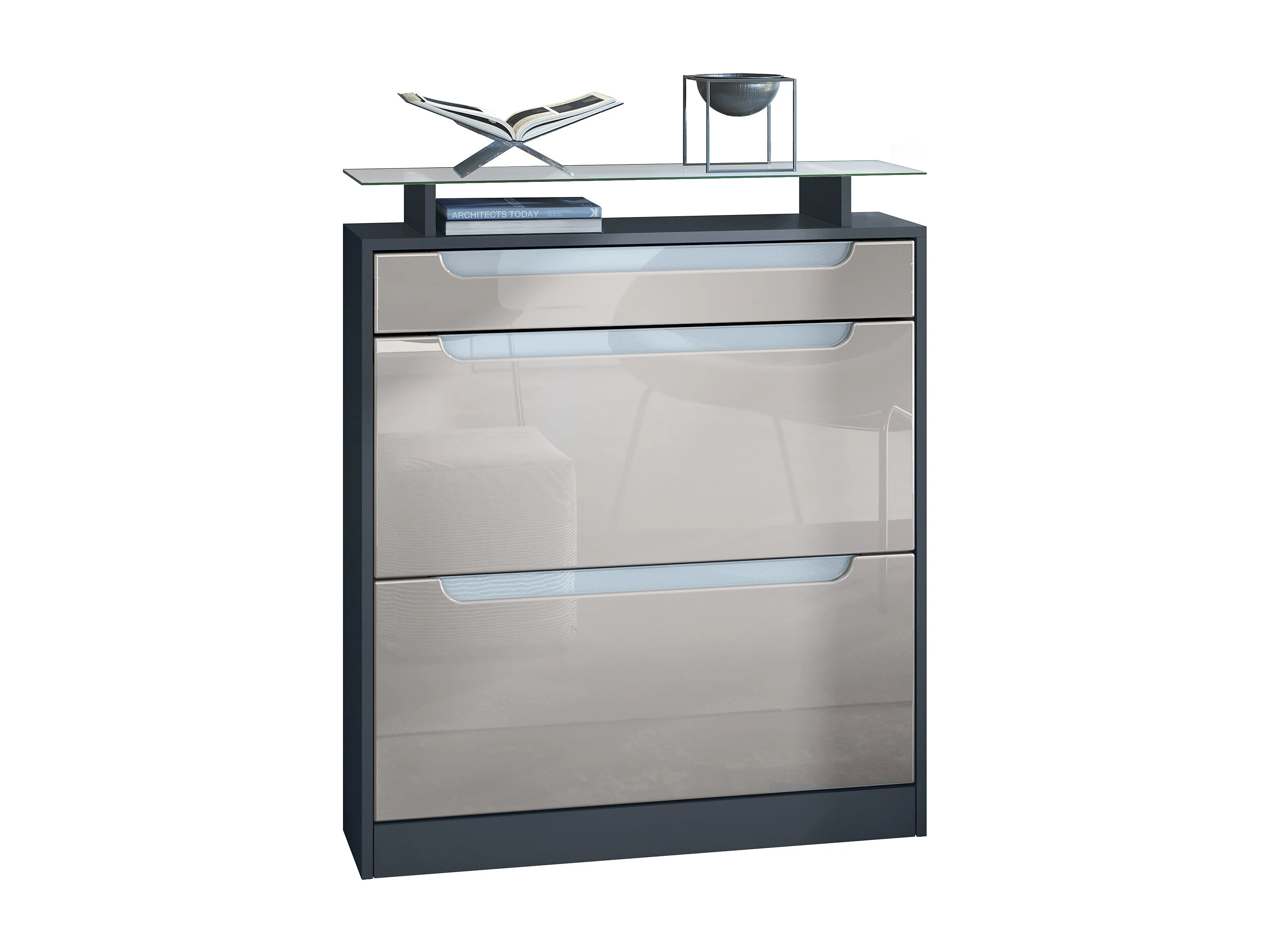 SCHUHSCHRANK Fiesta Fronten in Sandgrau Hochglanz, Griffmulden in Weiß Hochglanz