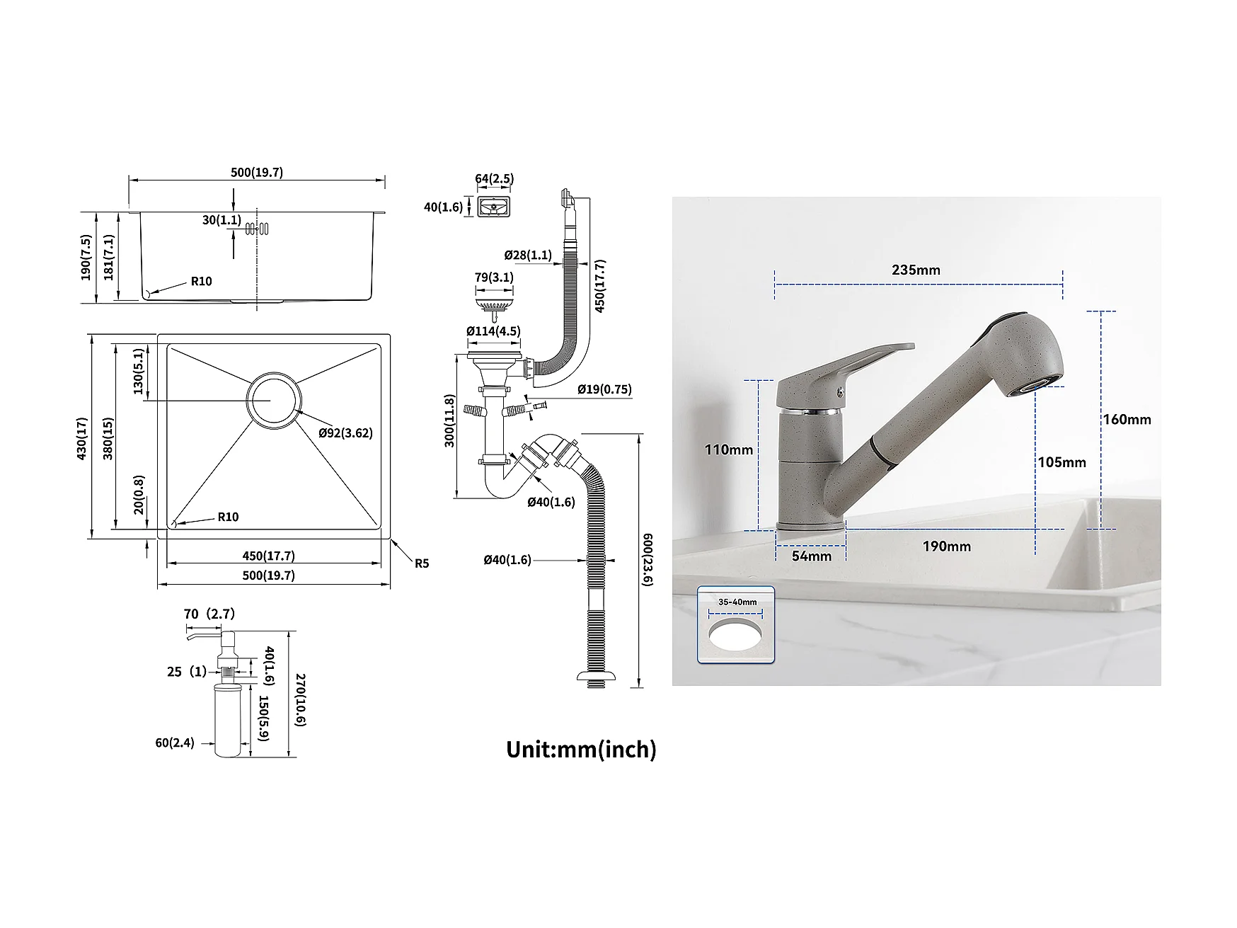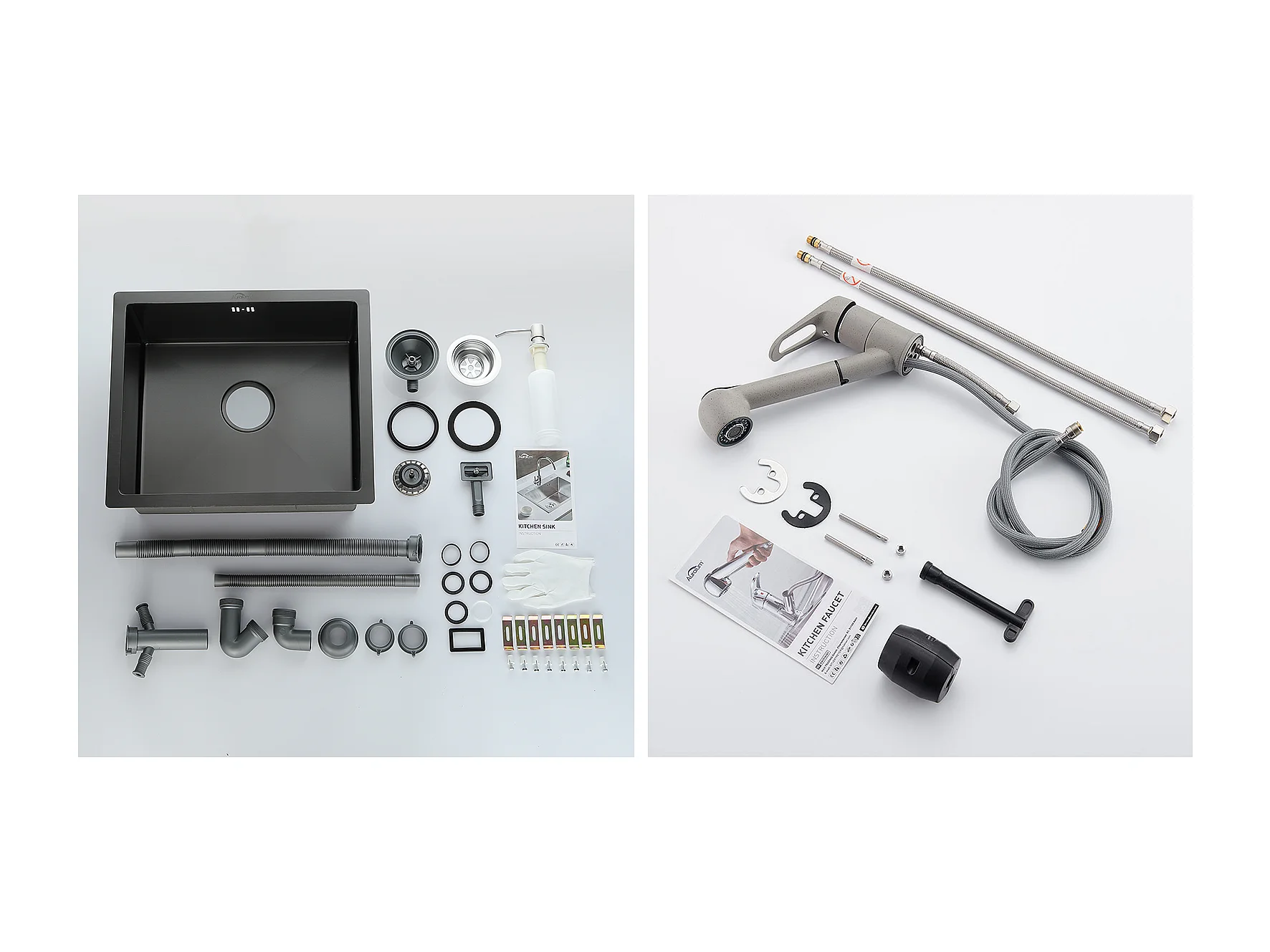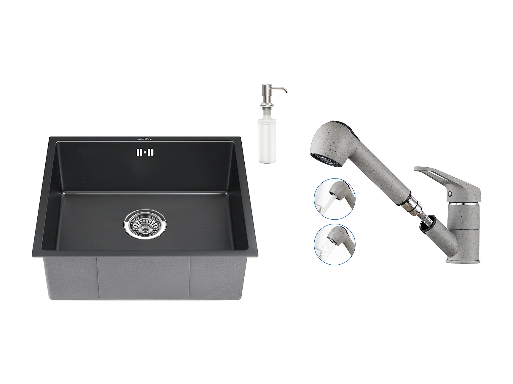 Schwarze Spüle 1 Becken 50x43x18,5 cm, Edelstahl, mit Seifenspender + Küchenarmatur mit ausziehbarer Brause 2 Düsen, Kalt-/Warmwasser, grau