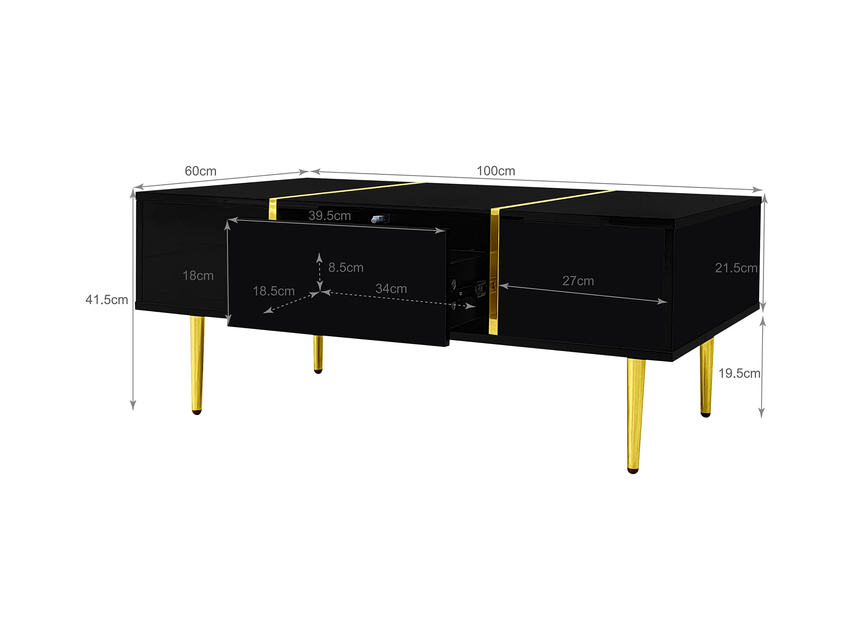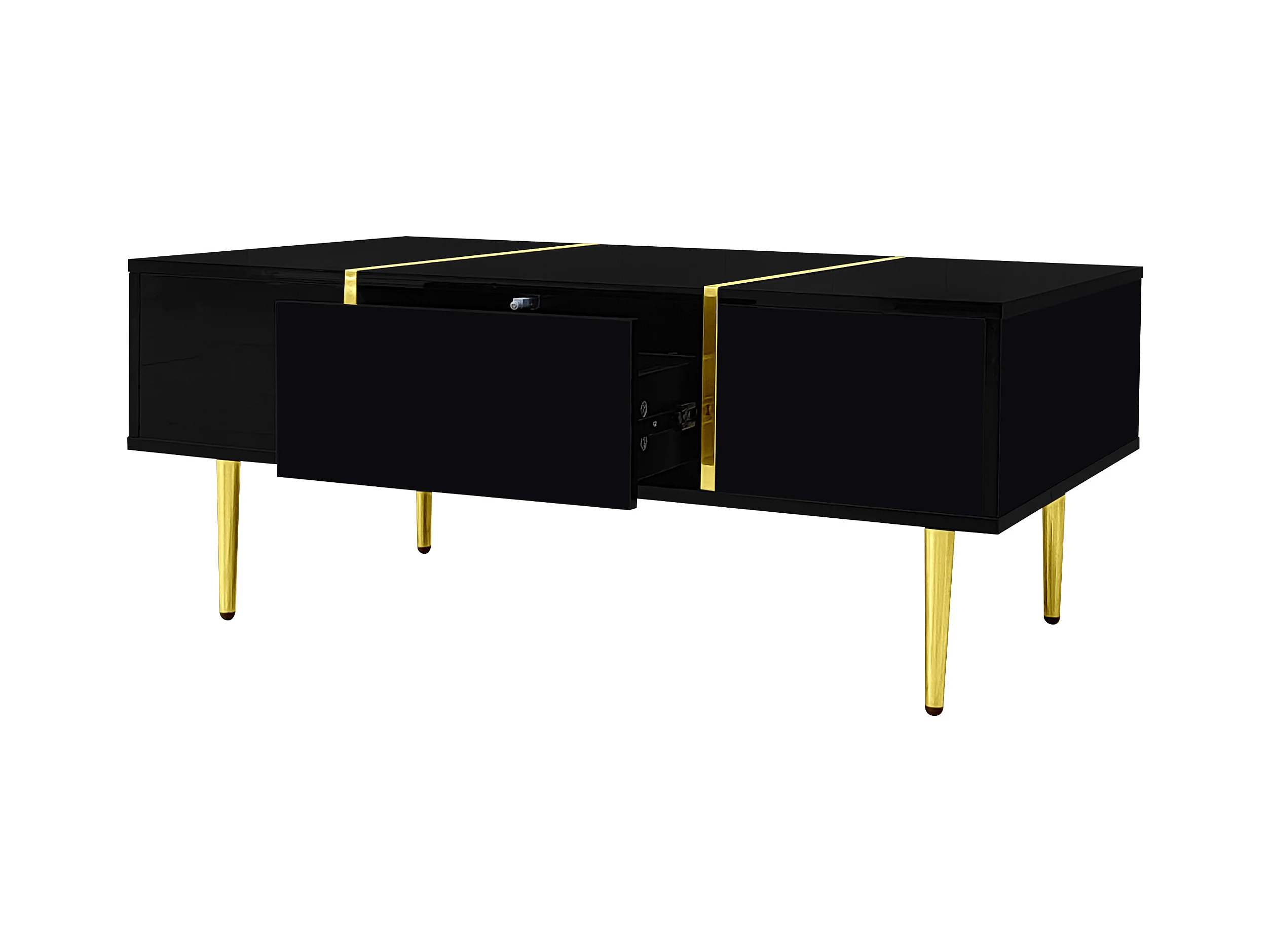 Schwarzer Couchtisch mit 2 Aufbewahrungsschubladen und goldenen Beinen - für Wohnzimmer und Büro
