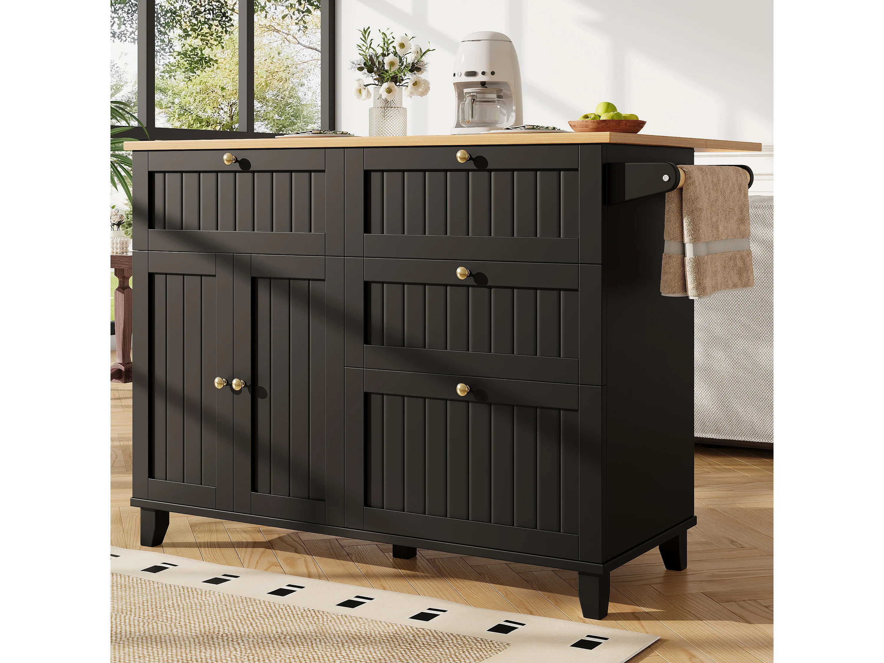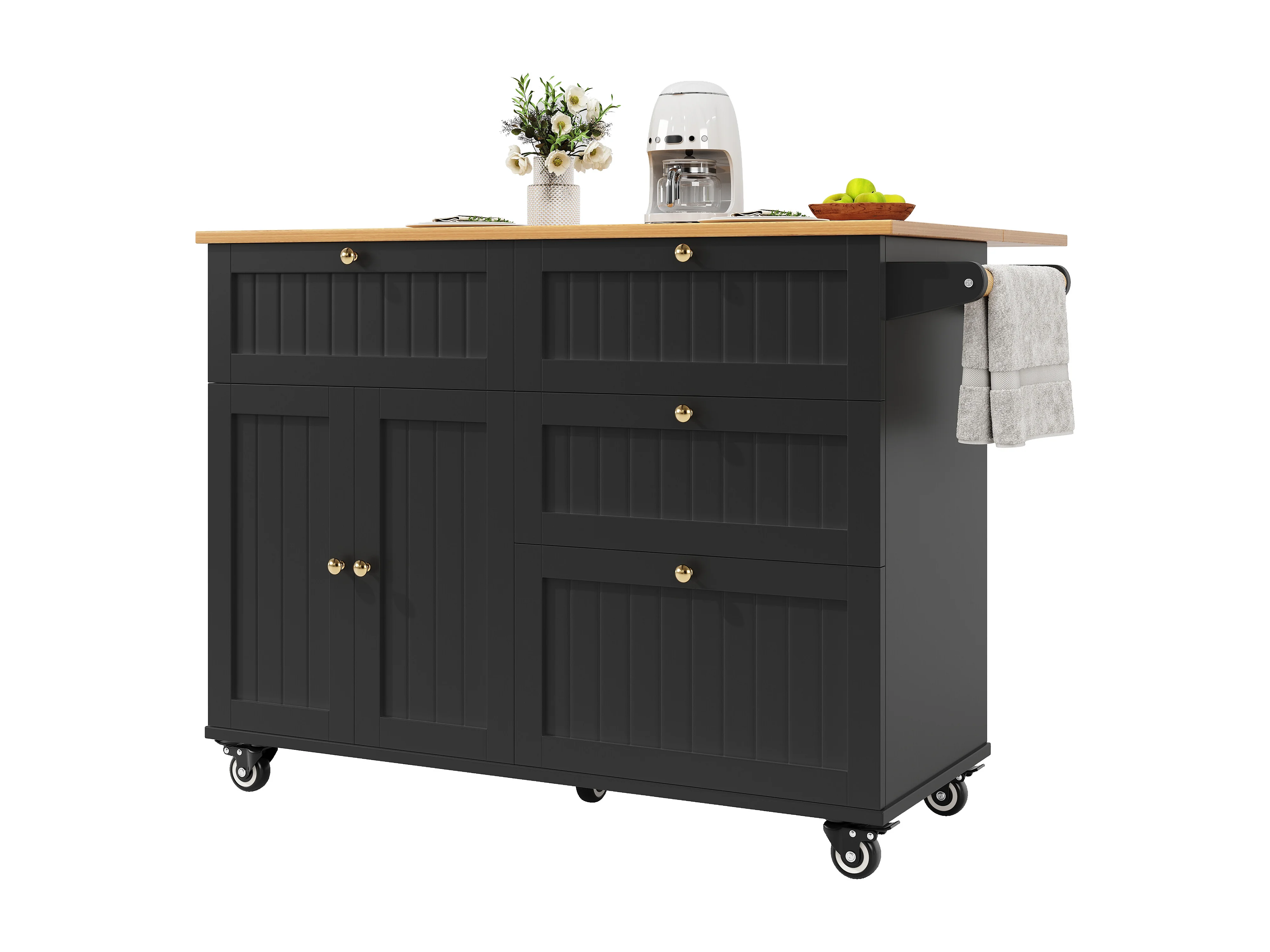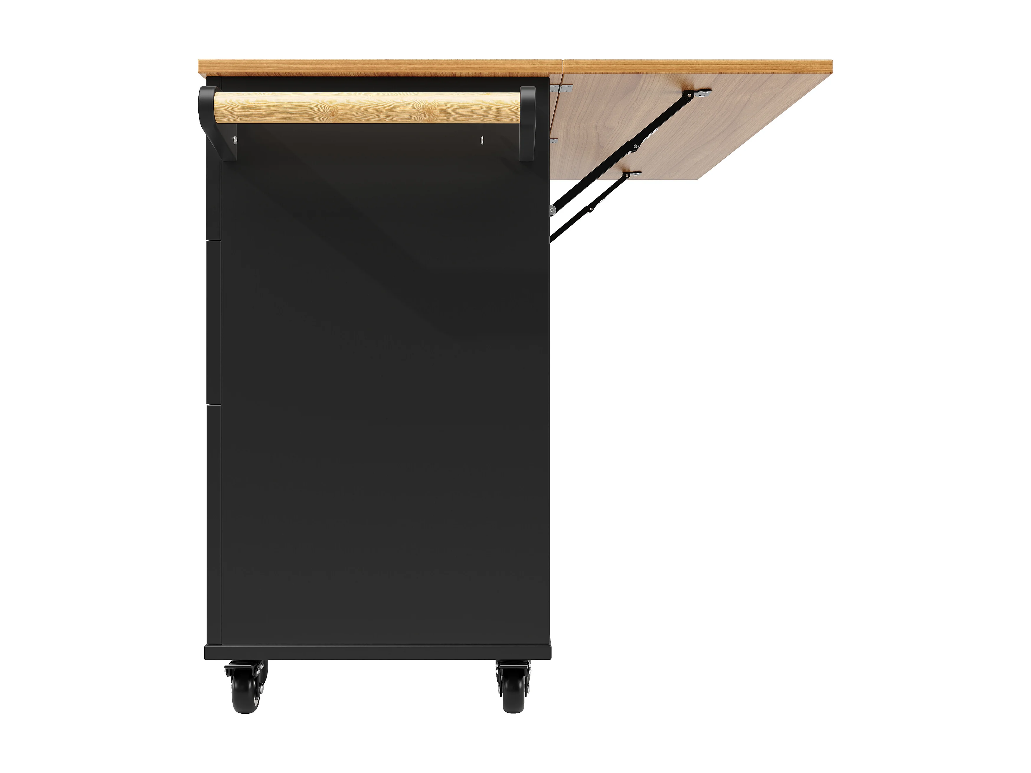 Schwarzer Küchenwagen mit klappbarer Arbeitsplatte in Holzoptik und Stauraum – ideal für Wohnzimmer und Küchen