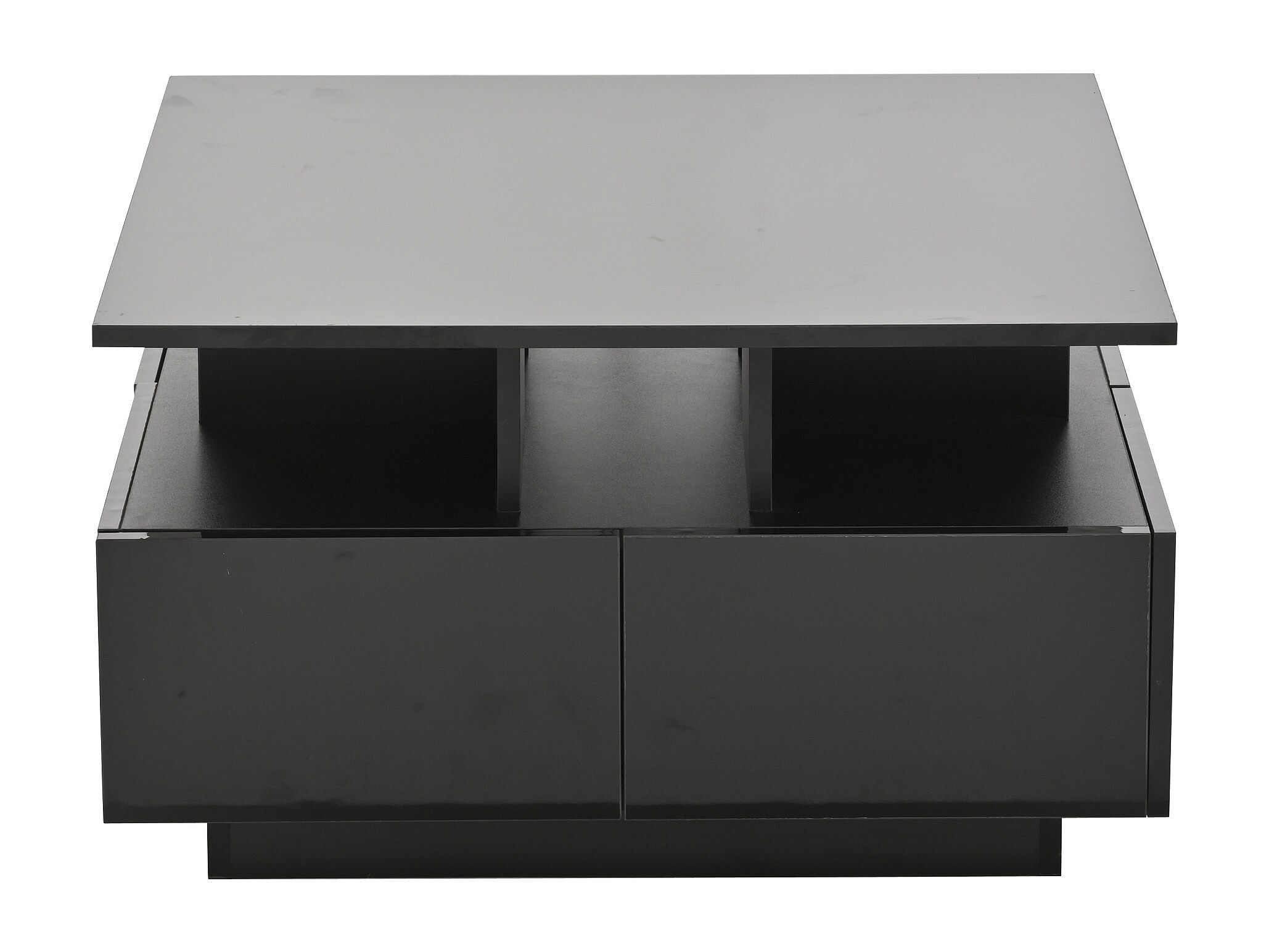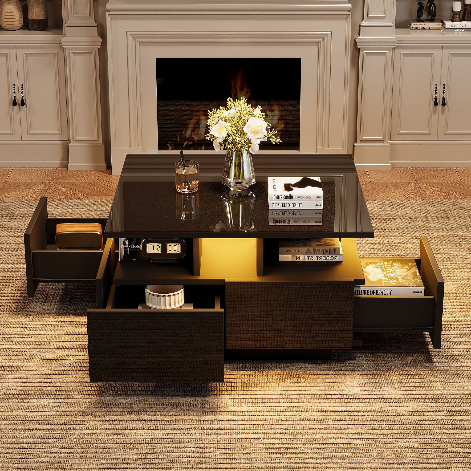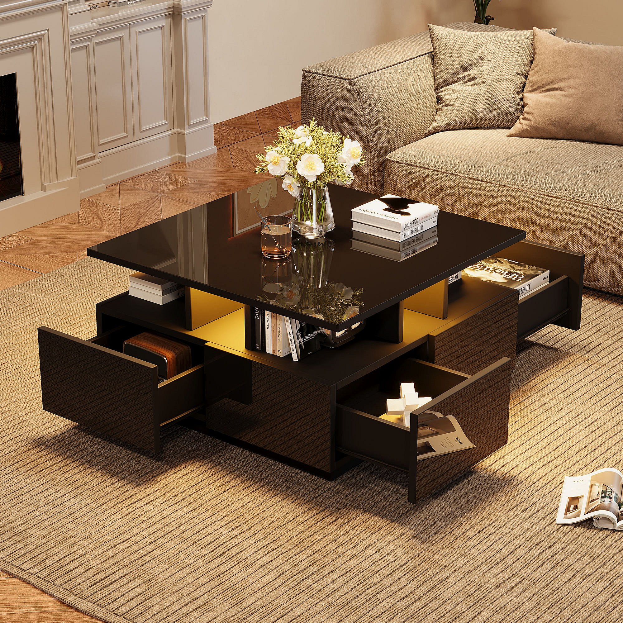 Schwarzer quadratischer Couchtisch – Couchtisch mit LED-Beleuchtung und 4 Schubladen – Offener Stauraum