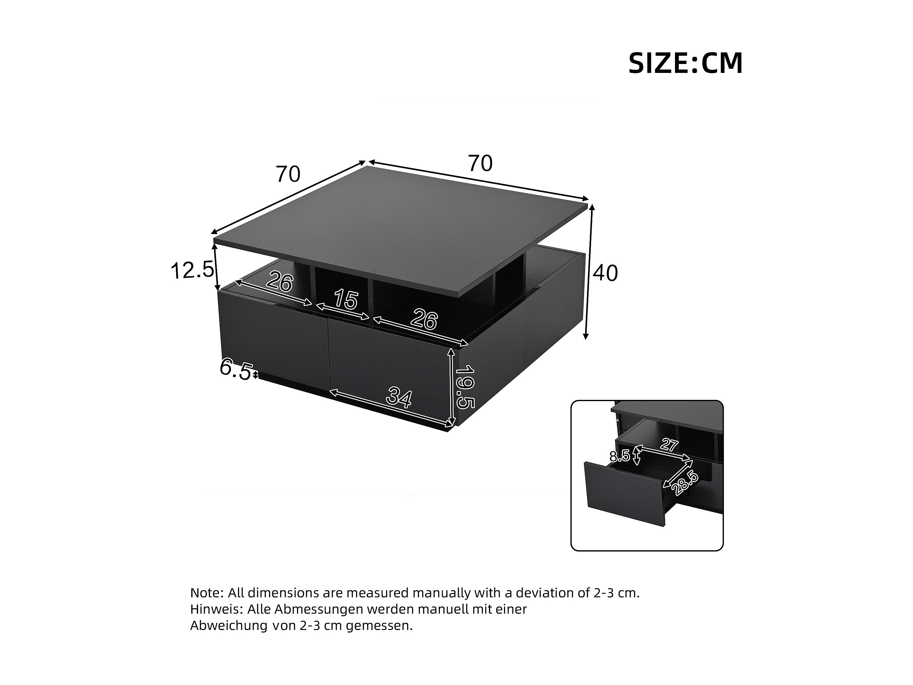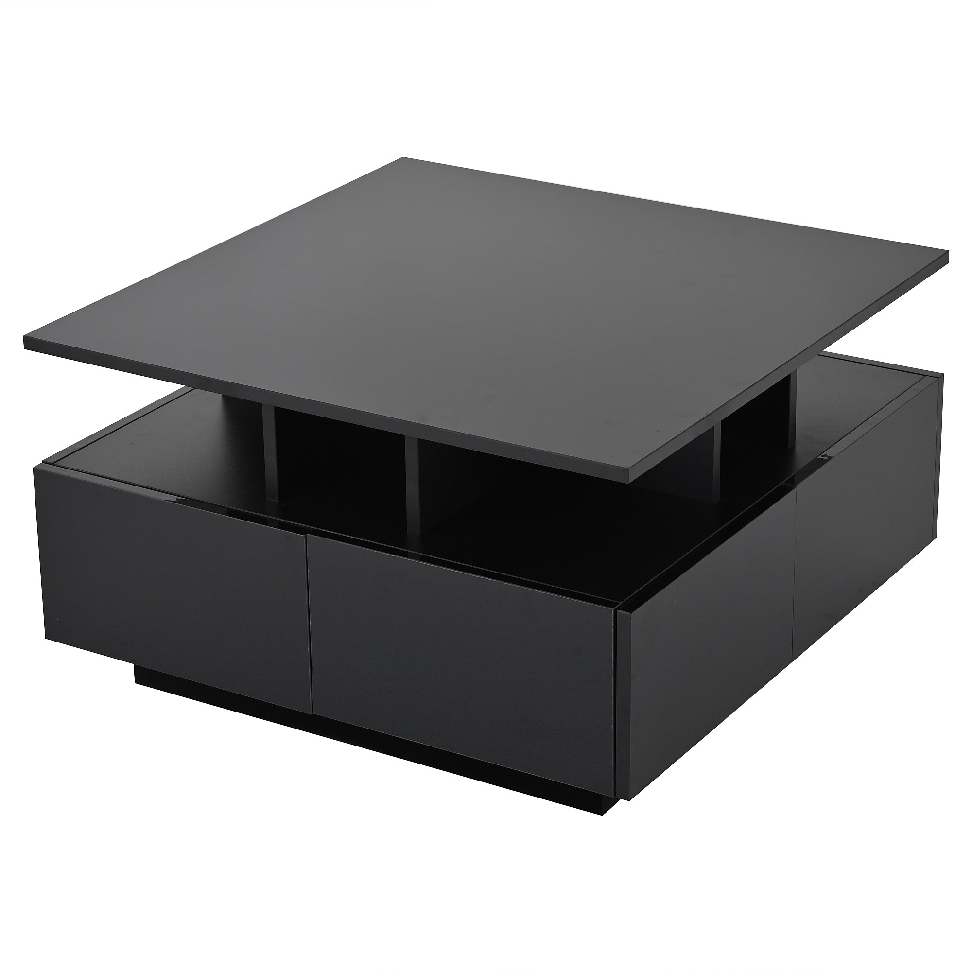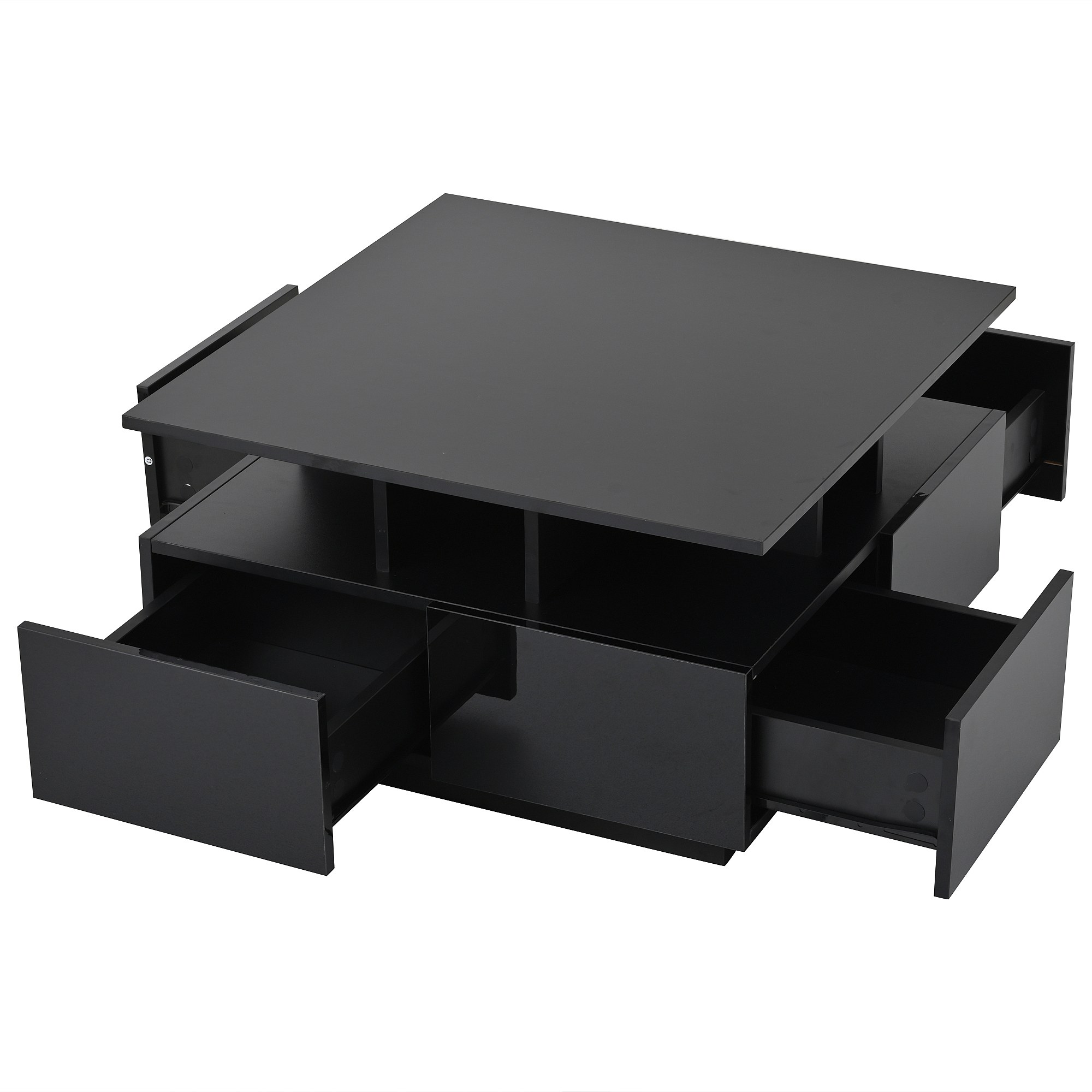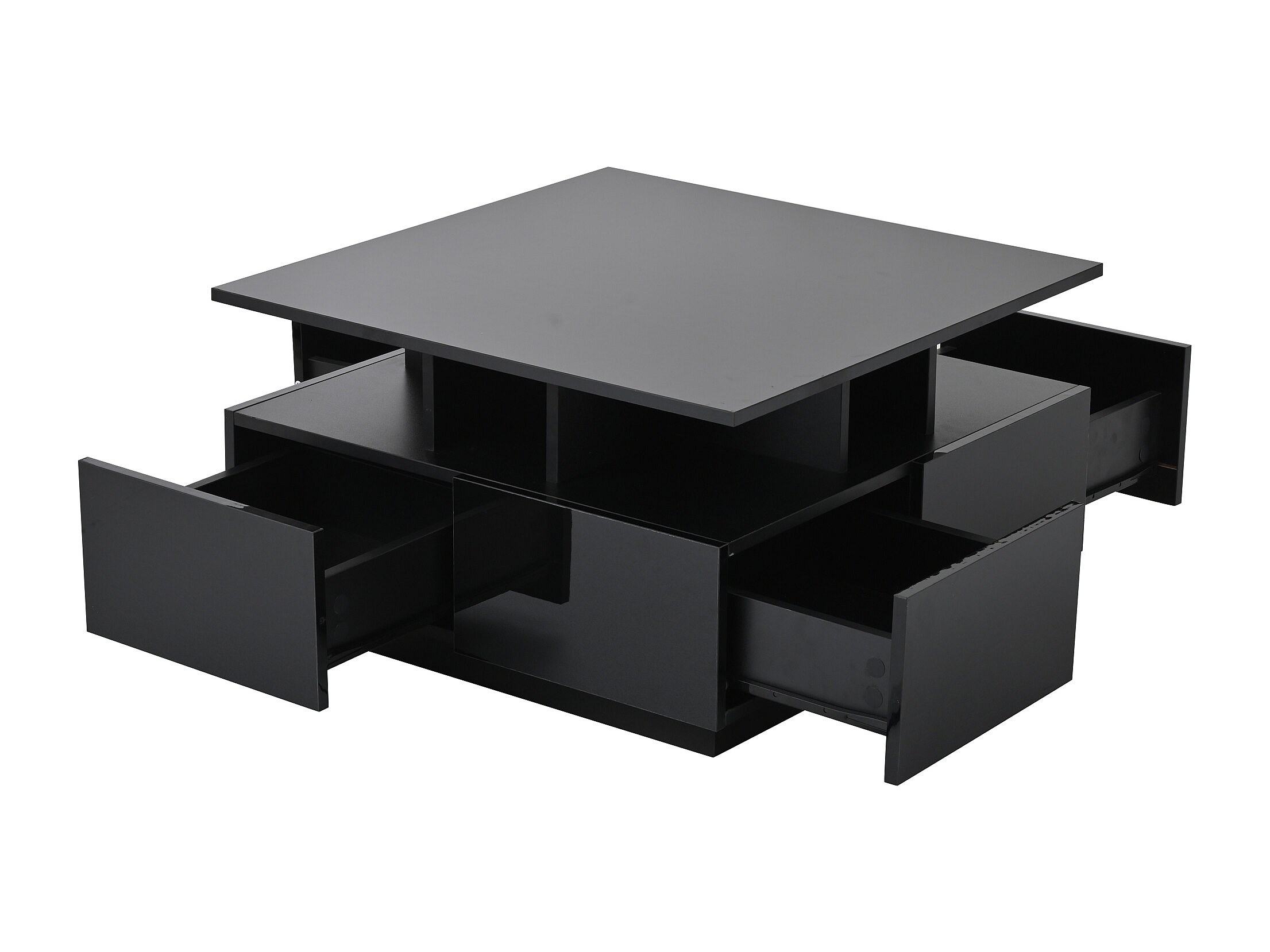 Schwarzer quadratischer Couchtisch – Couchtisch mit LED-Beleuchtung und 4 Schubladen – Offener Stauraum
