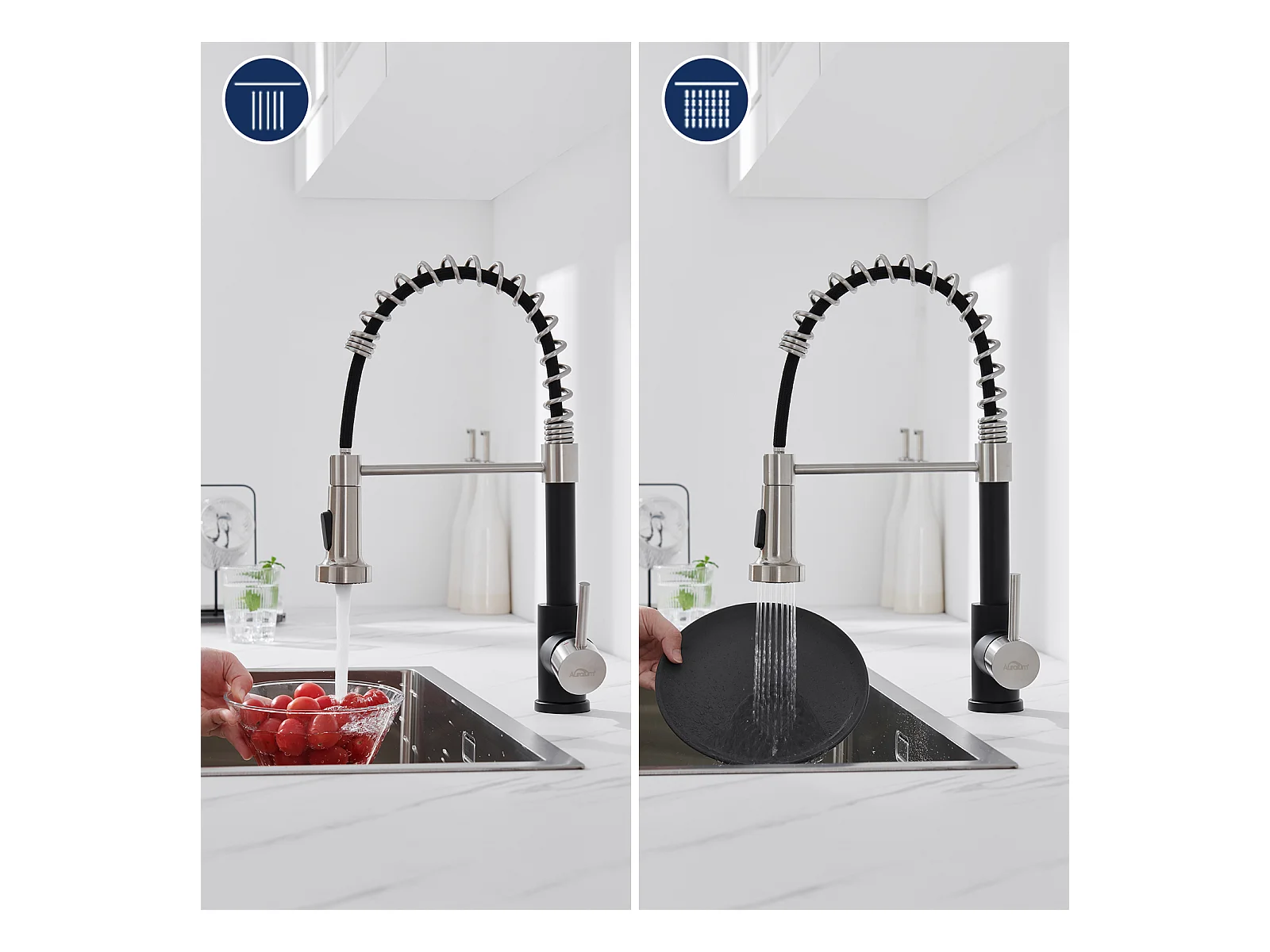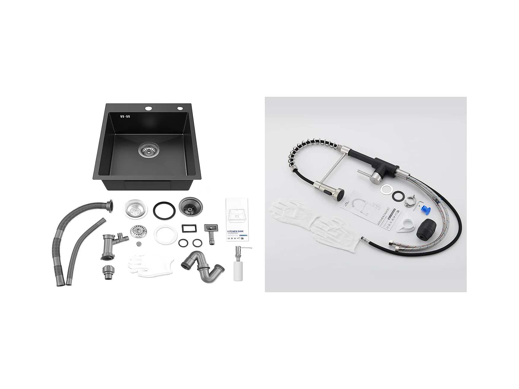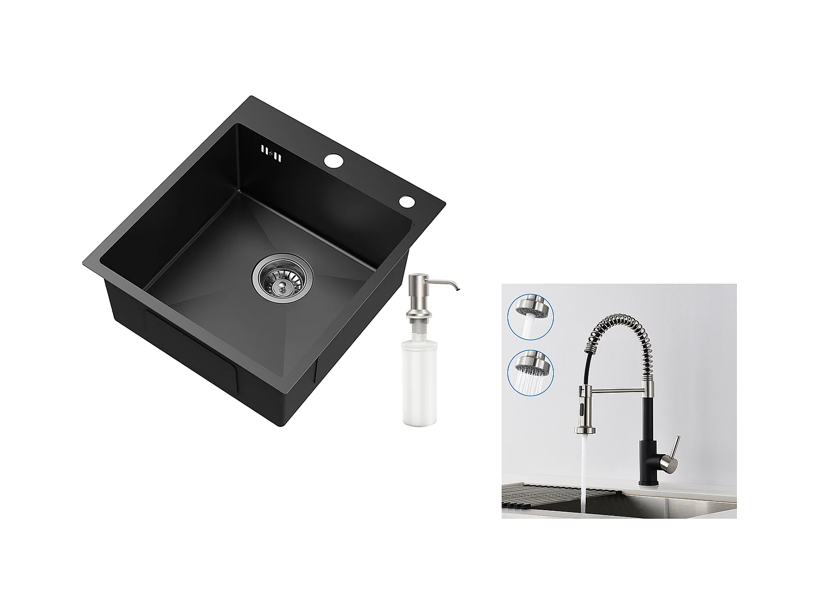 Schwarzes 1-Becken-Spülbecken, Edelstahl, 44 x 49 x 20 cm, mit Seifenspender, + Feder-Küchenarmatur mit ausziehbarem Sprüher, 2 Modi, Schwarz