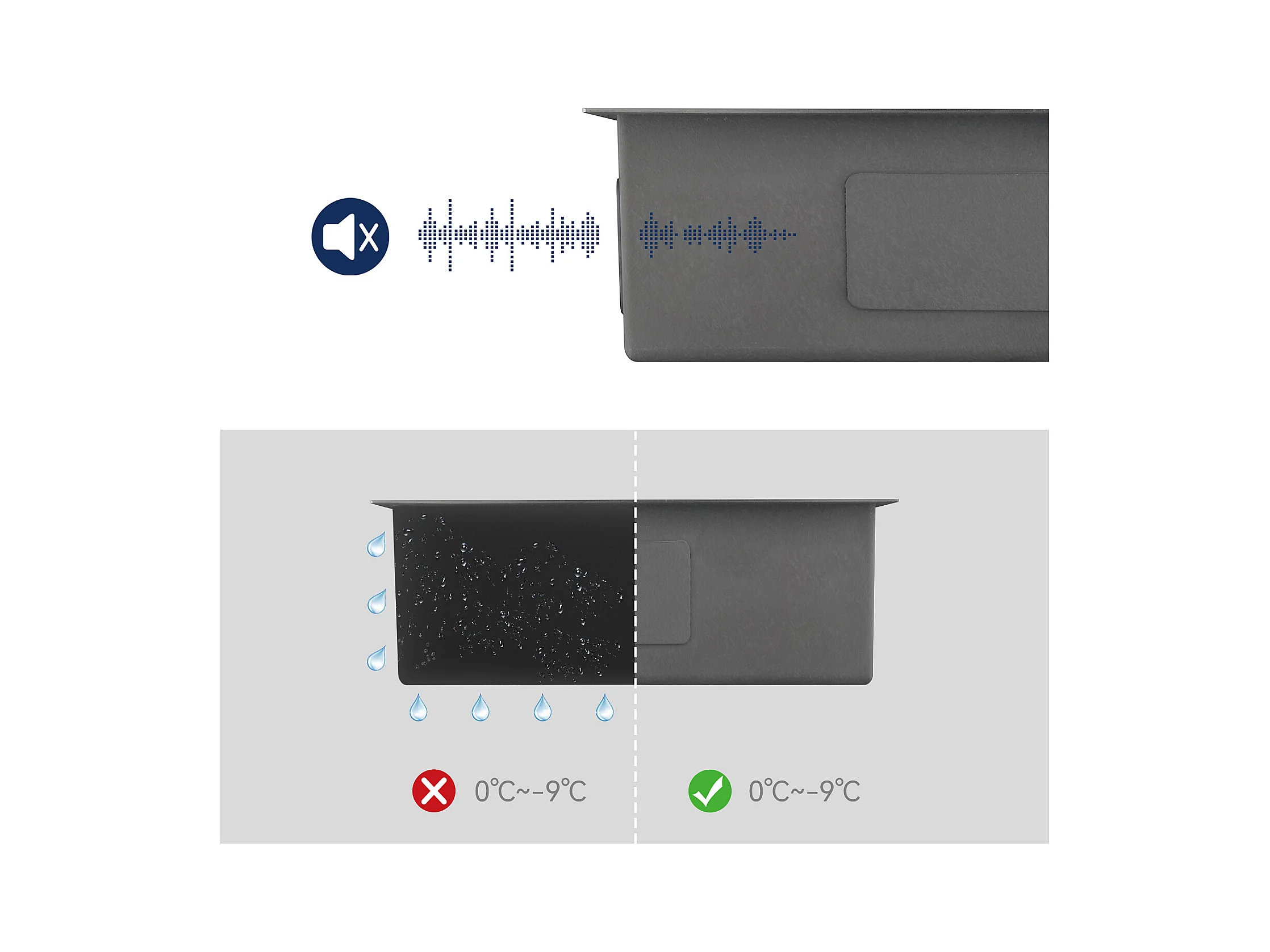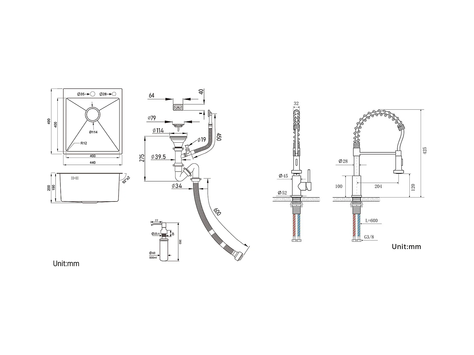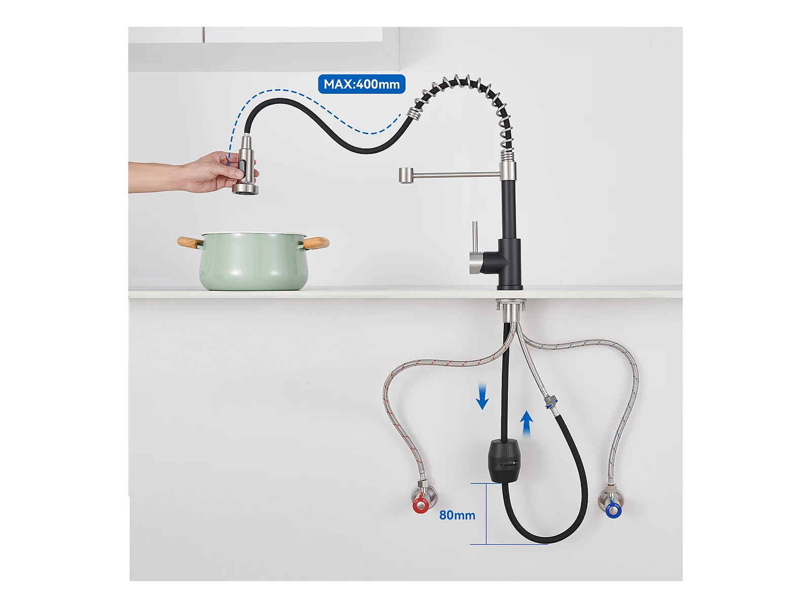 Schwarzes 1-Becken-Spülbecken, Edelstahl, 44 x 49 x 20 cm, mit Seifenspender, + Feder-Küchenarmatur mit ausziehbarem Sprüher, 2 Modi, Schwarz