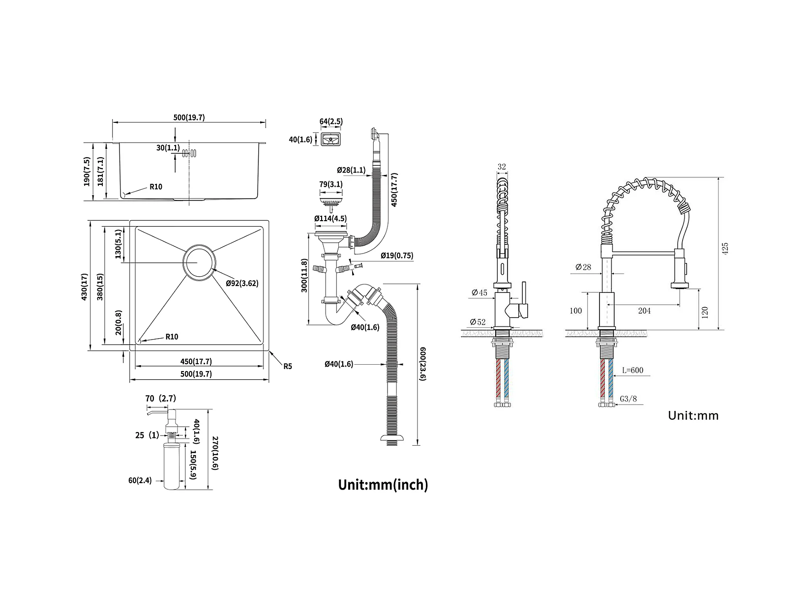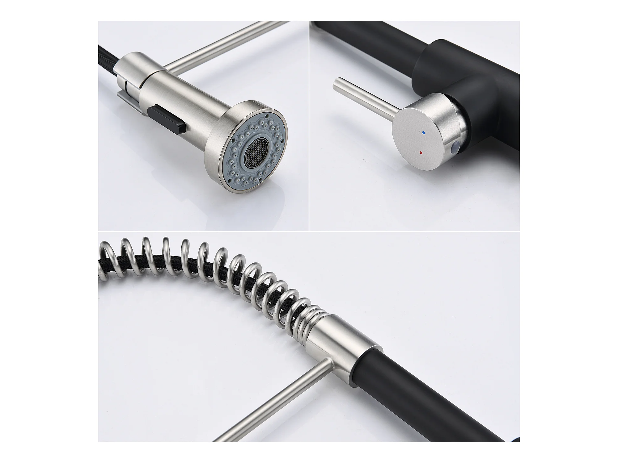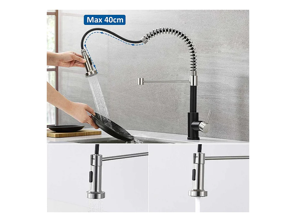 Schwarzes 1-Behälter-Spülbecken 50 x 43 x 18,5 cm, Edelstahl, mit Seifenspender + Feder-Küchenarmatur mit ausziehbarer Brause