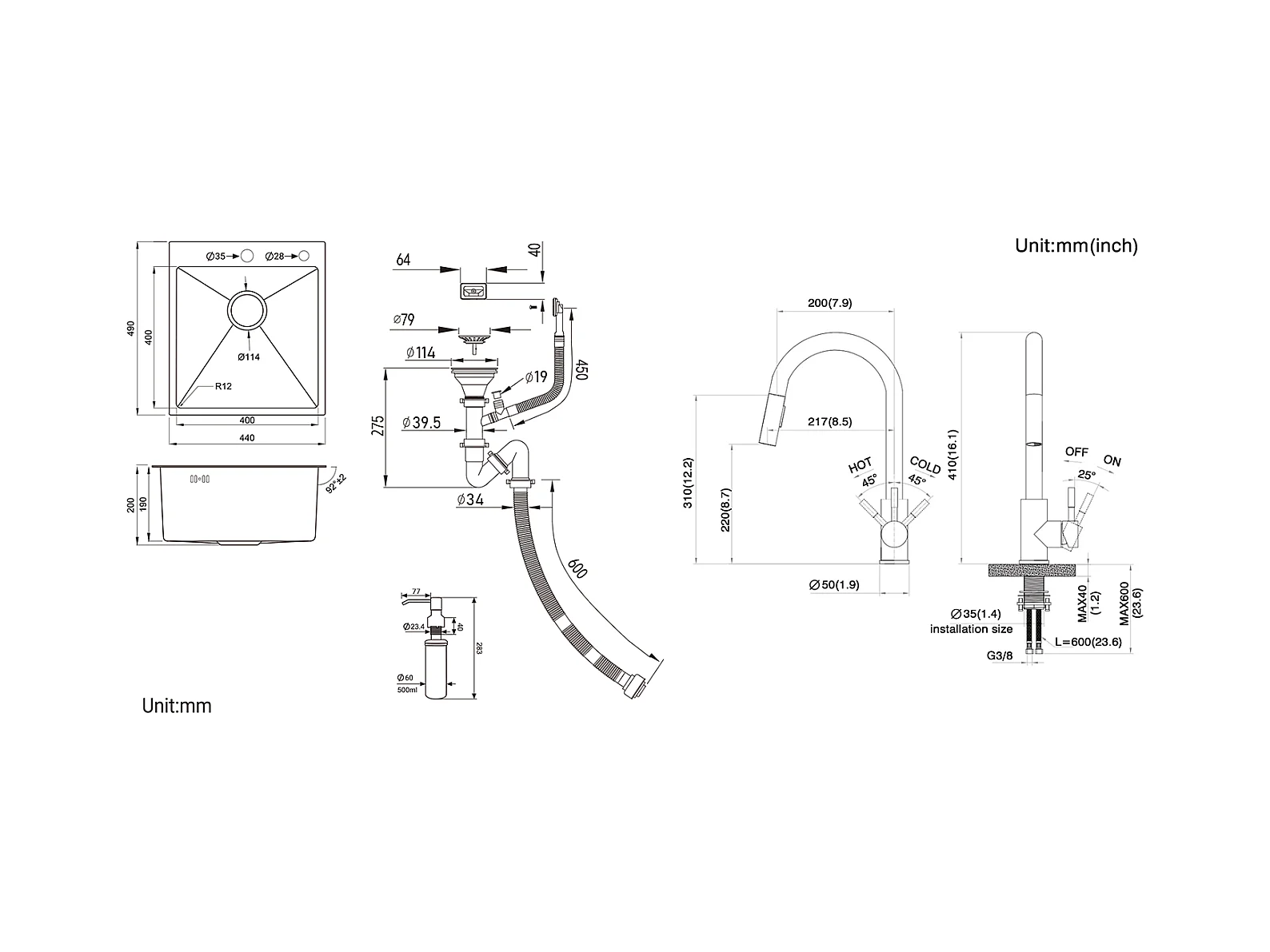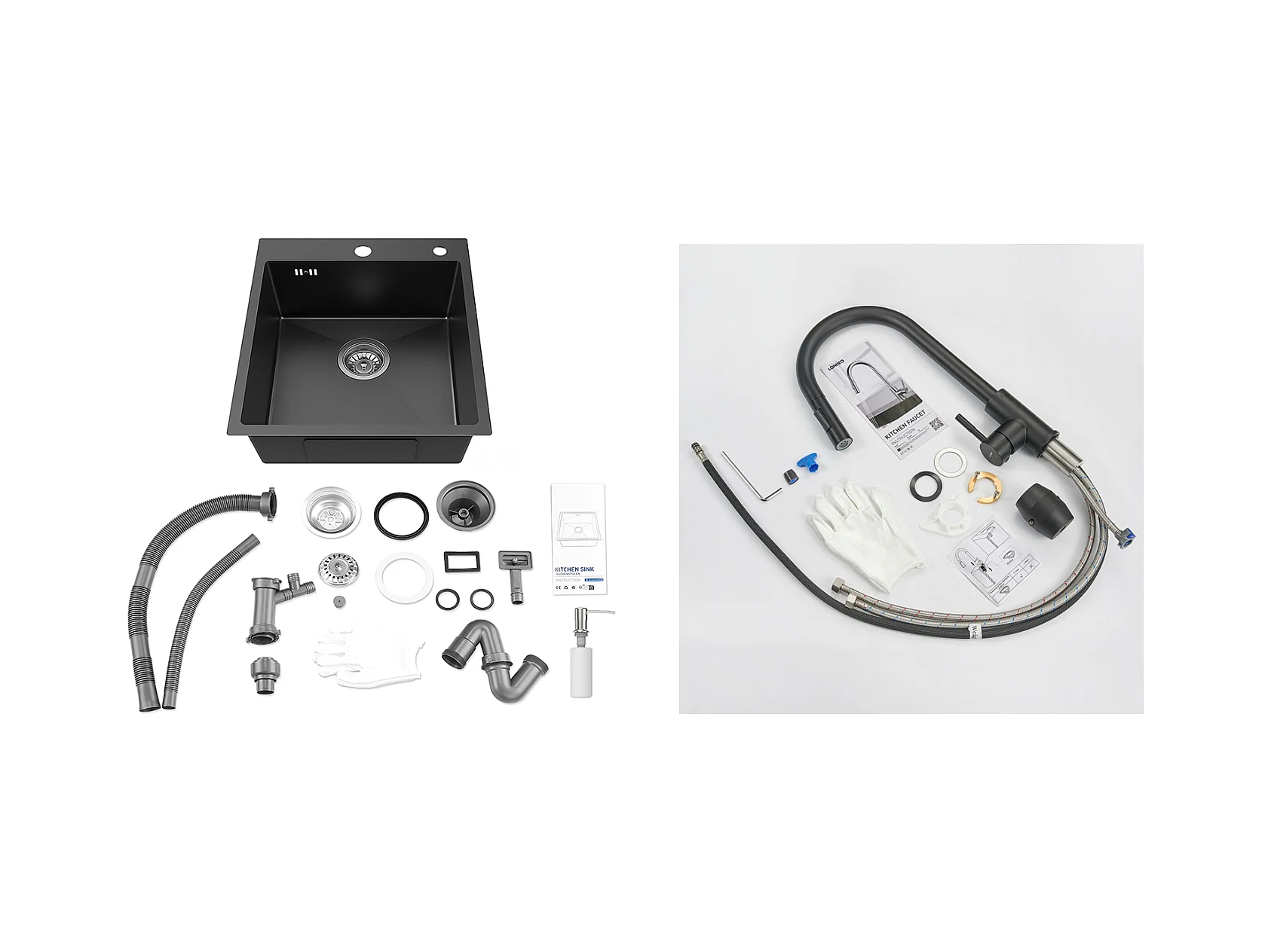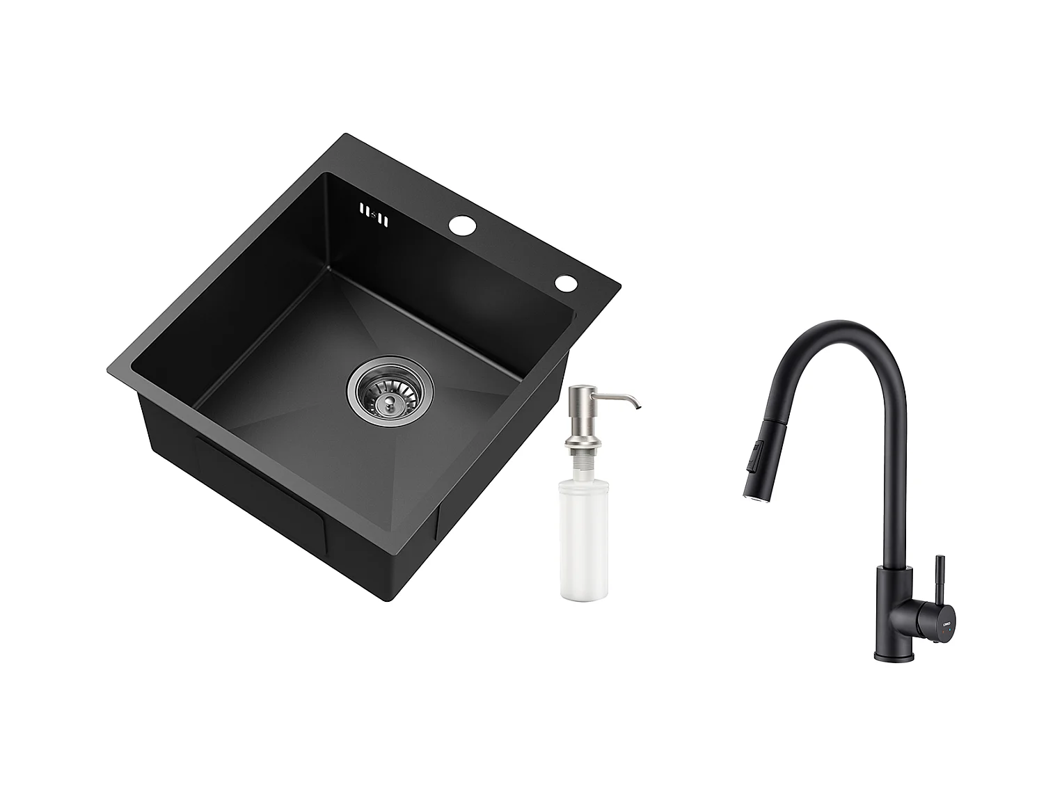 Schwarzes Einzelbecken-Spülbecken aus Edelstahl, 44 x 49 x 20 cm, mit Seifenspender + schwarzer Küchenarmatur, 360° drehbar, ausziehbar, Edelstahl, 2 Funktionen