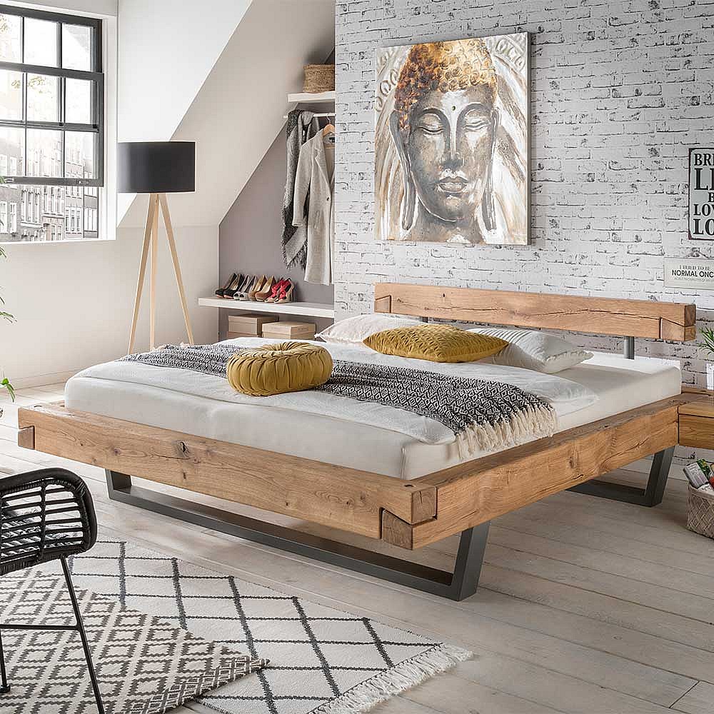 Schwebendes Balkenbett aus Wildeiche Massivholz modern