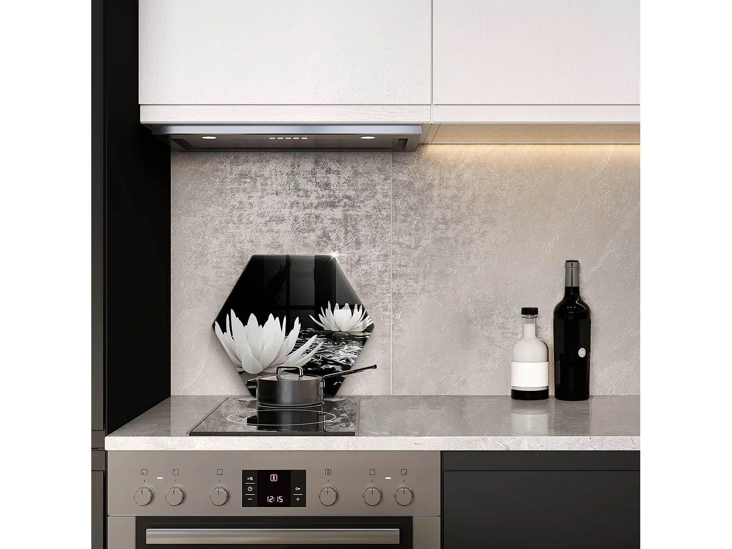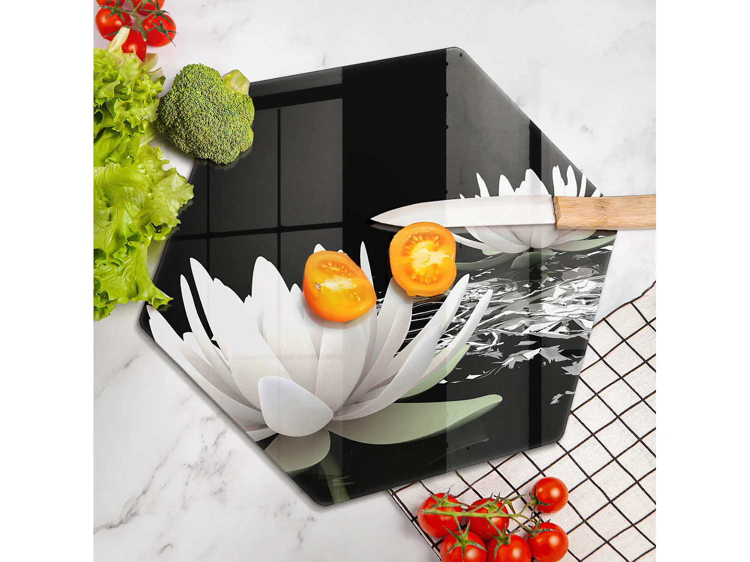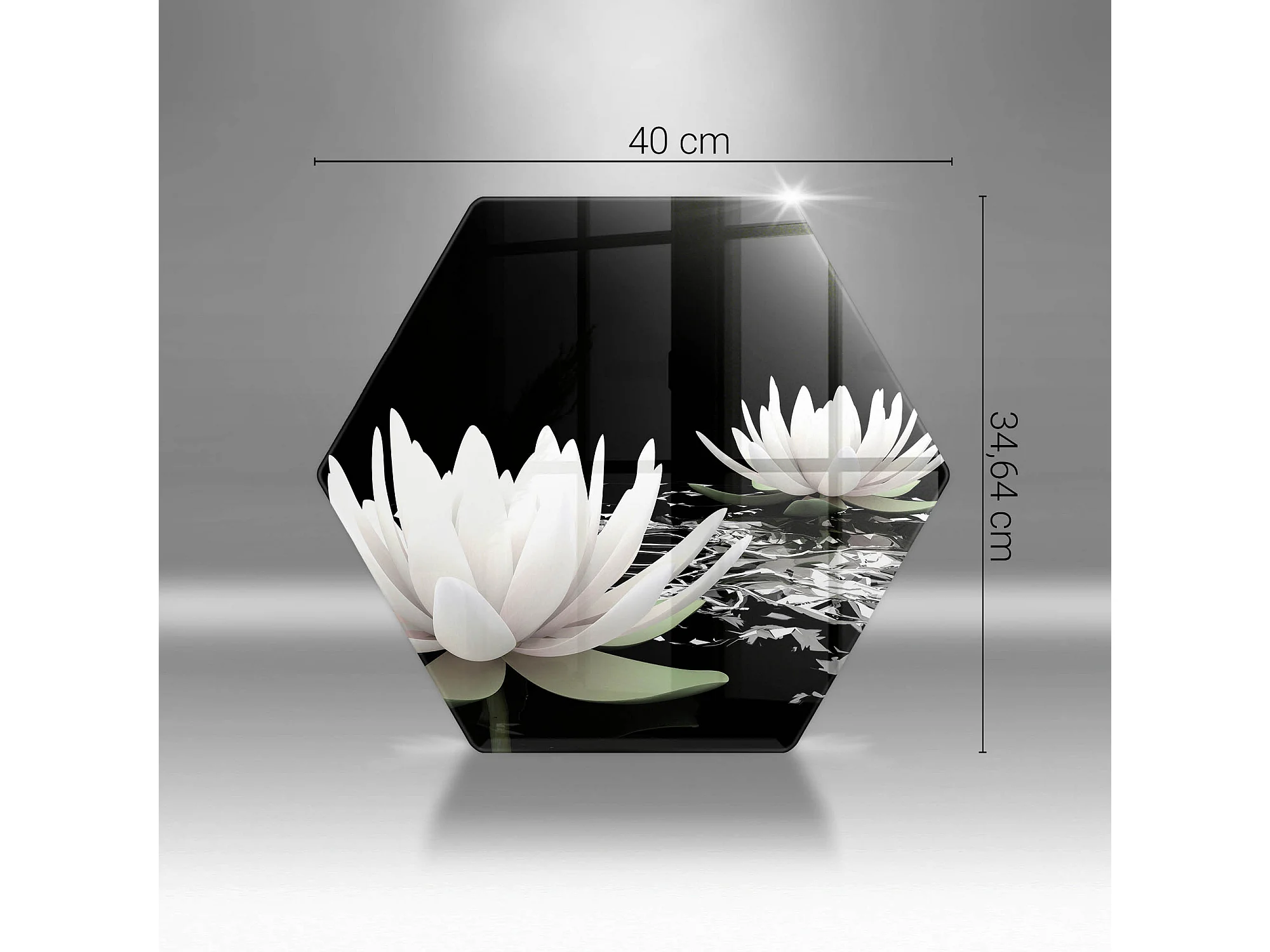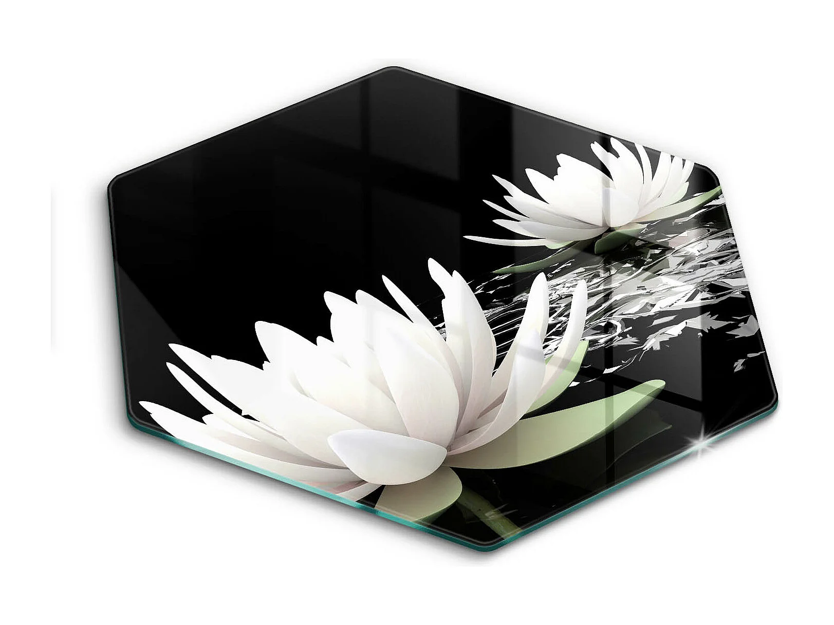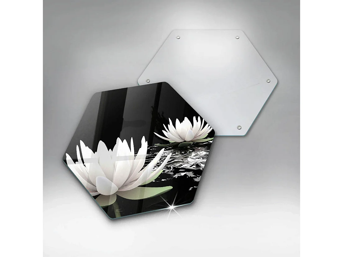 Sechseckiges Küchenbrett aus Glas, 40 cm. Weiße Lilien auf dem Wasser