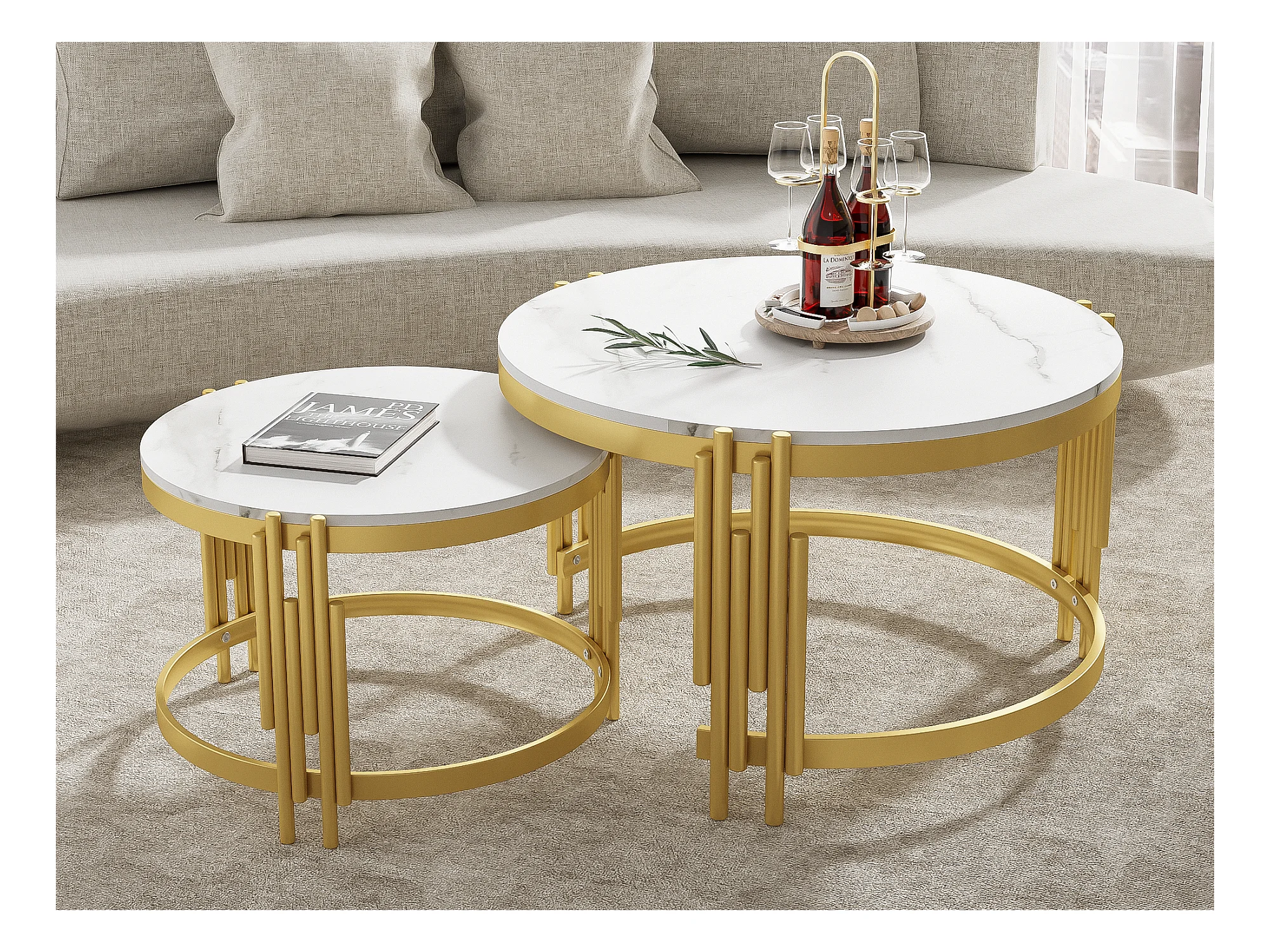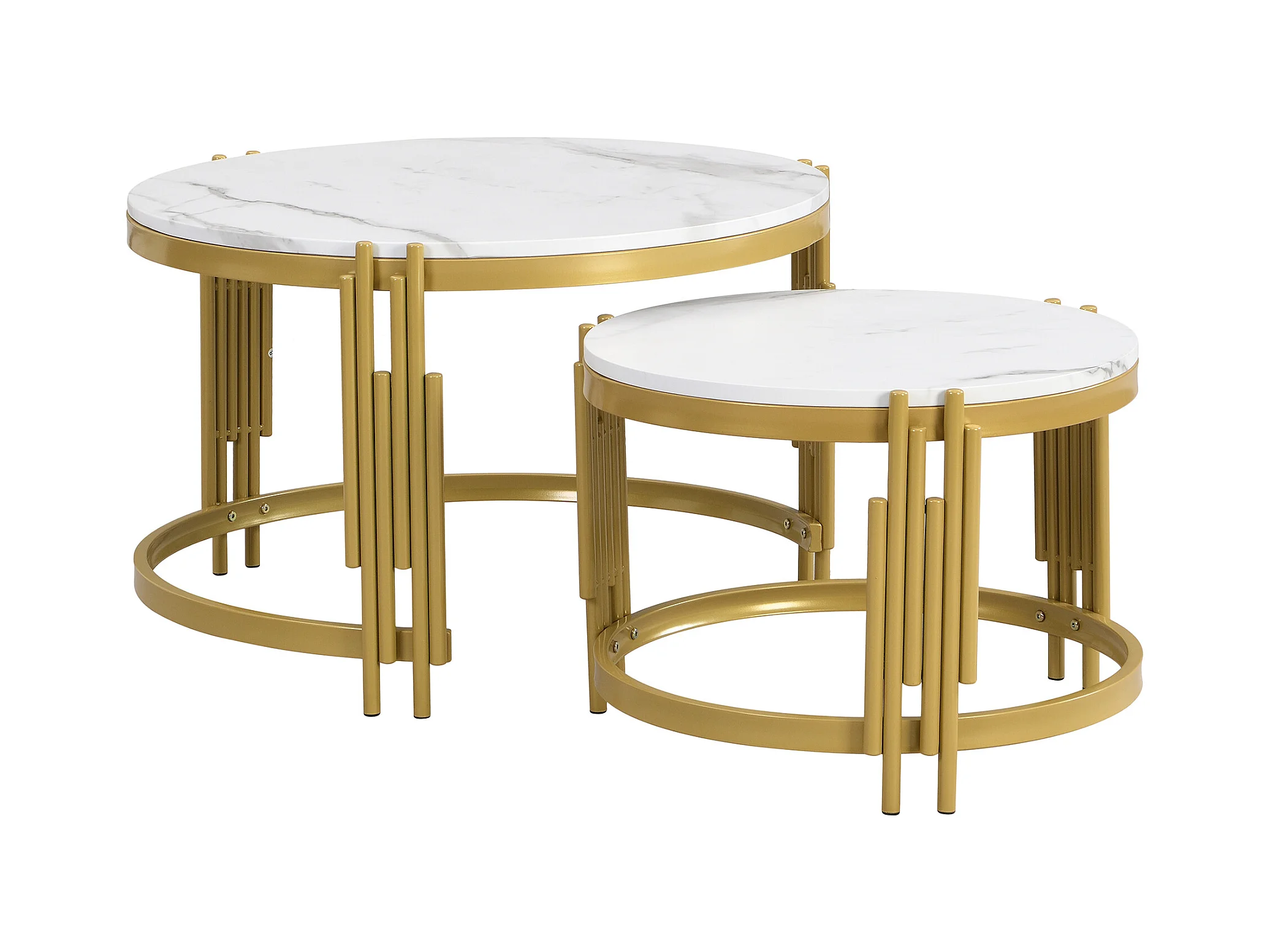 Set aus 2 ineinander steckbaren Couchtischen – Marmoreffekt – Metallstruktur – Weiß und Gold