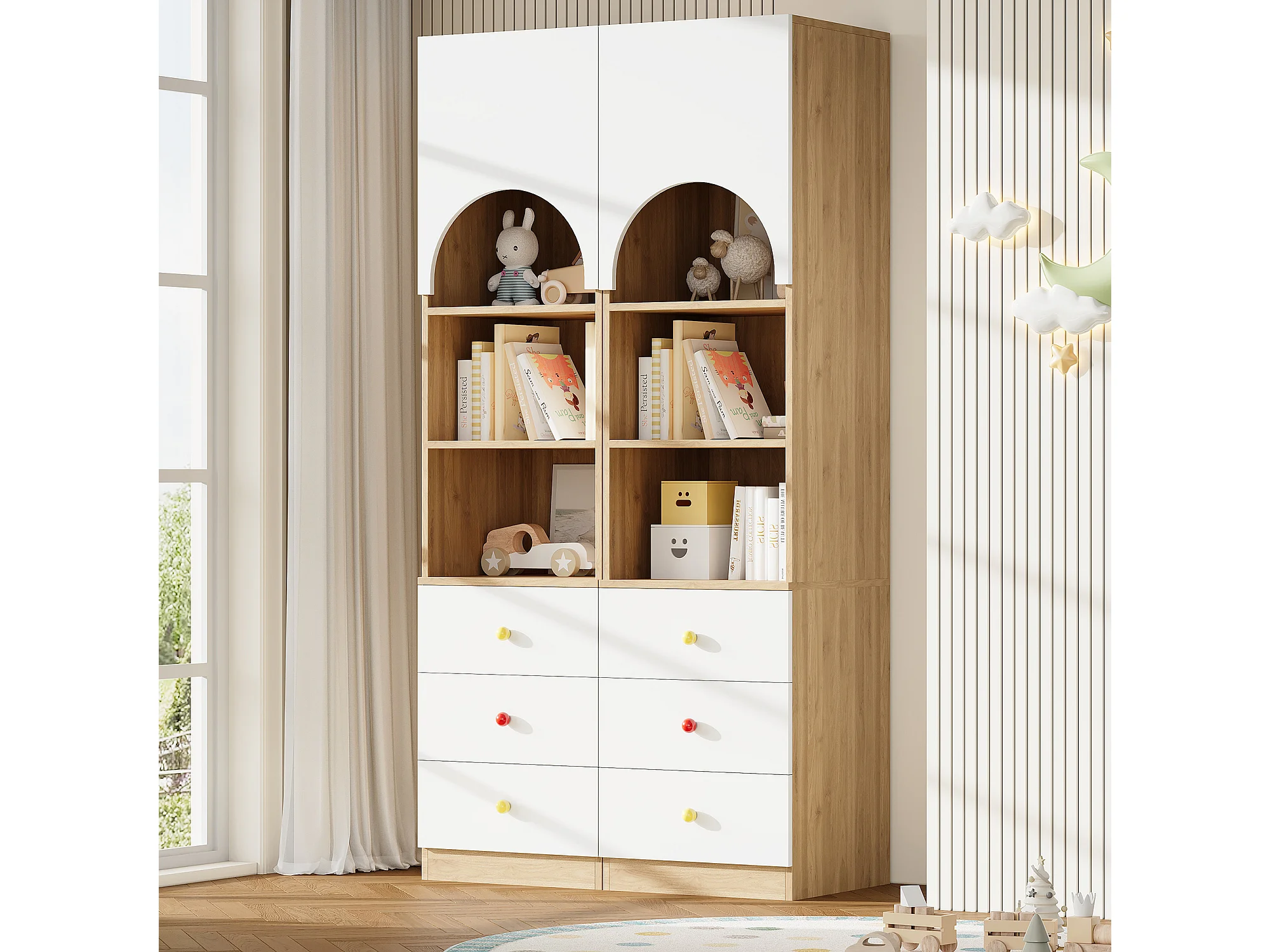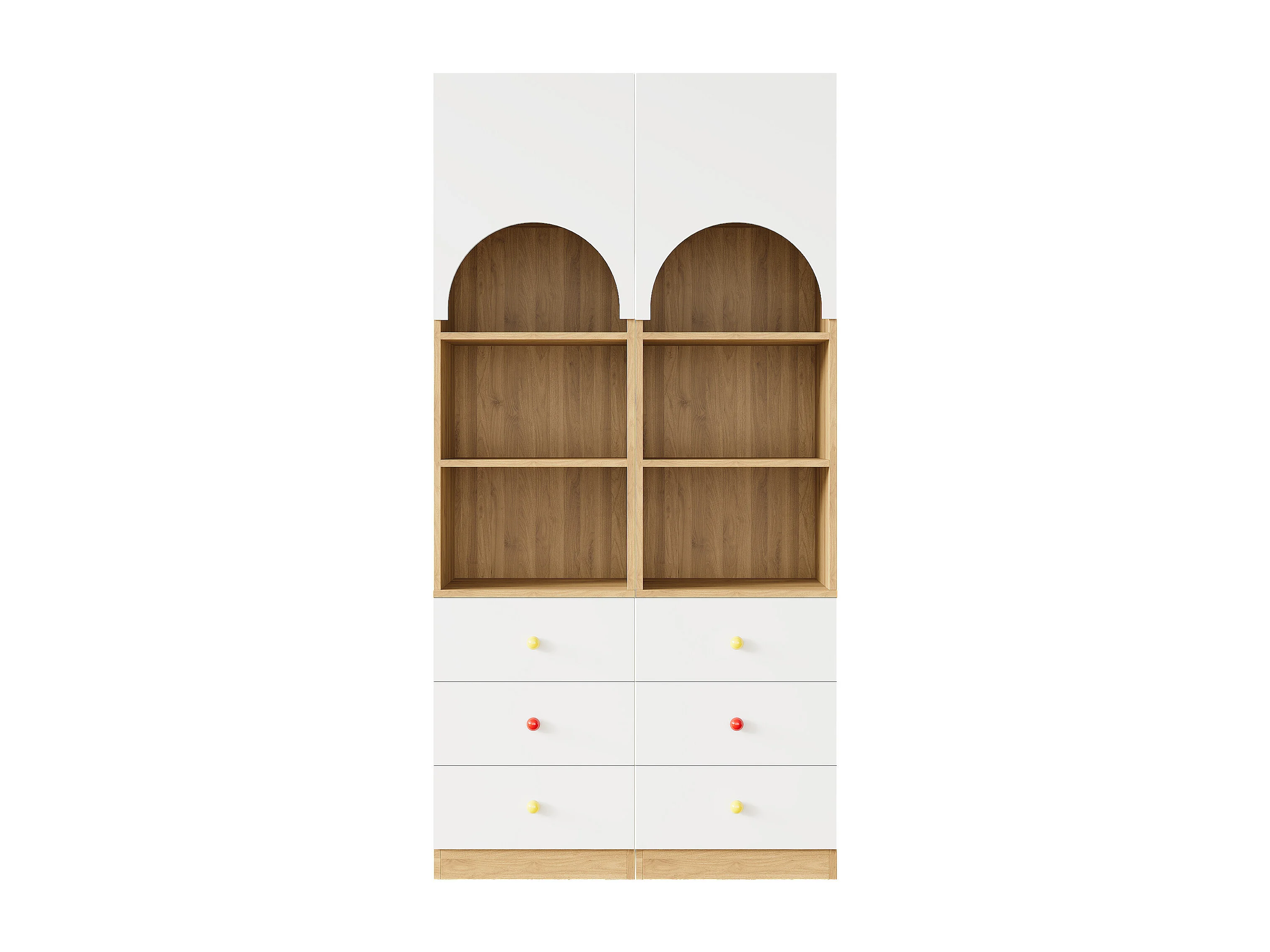 Set aus 2 mehrstufigen Bücherregalen – 2 x 50 x 50 x 200 cm – mit 6 Schubladen + Regalböden + 2 Türen – Holzoptik – MDF – weiß