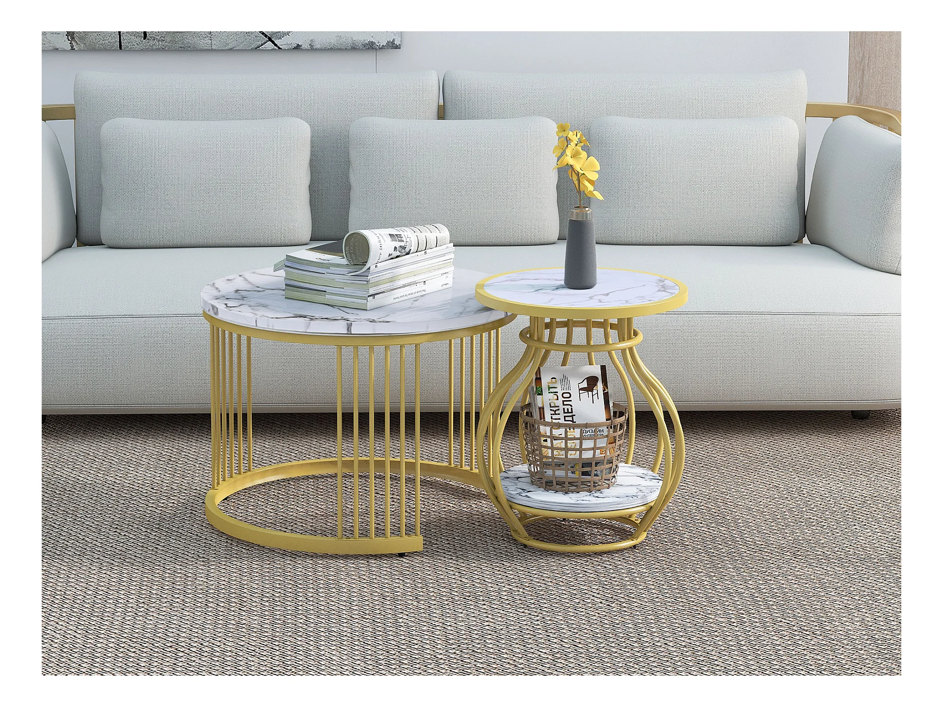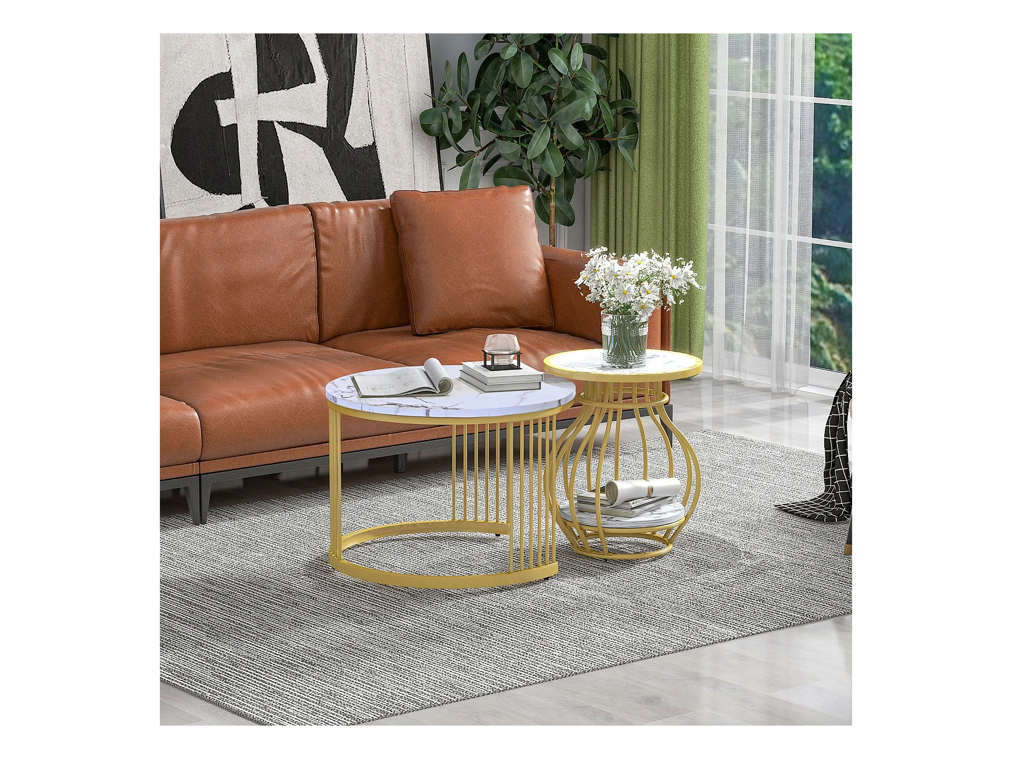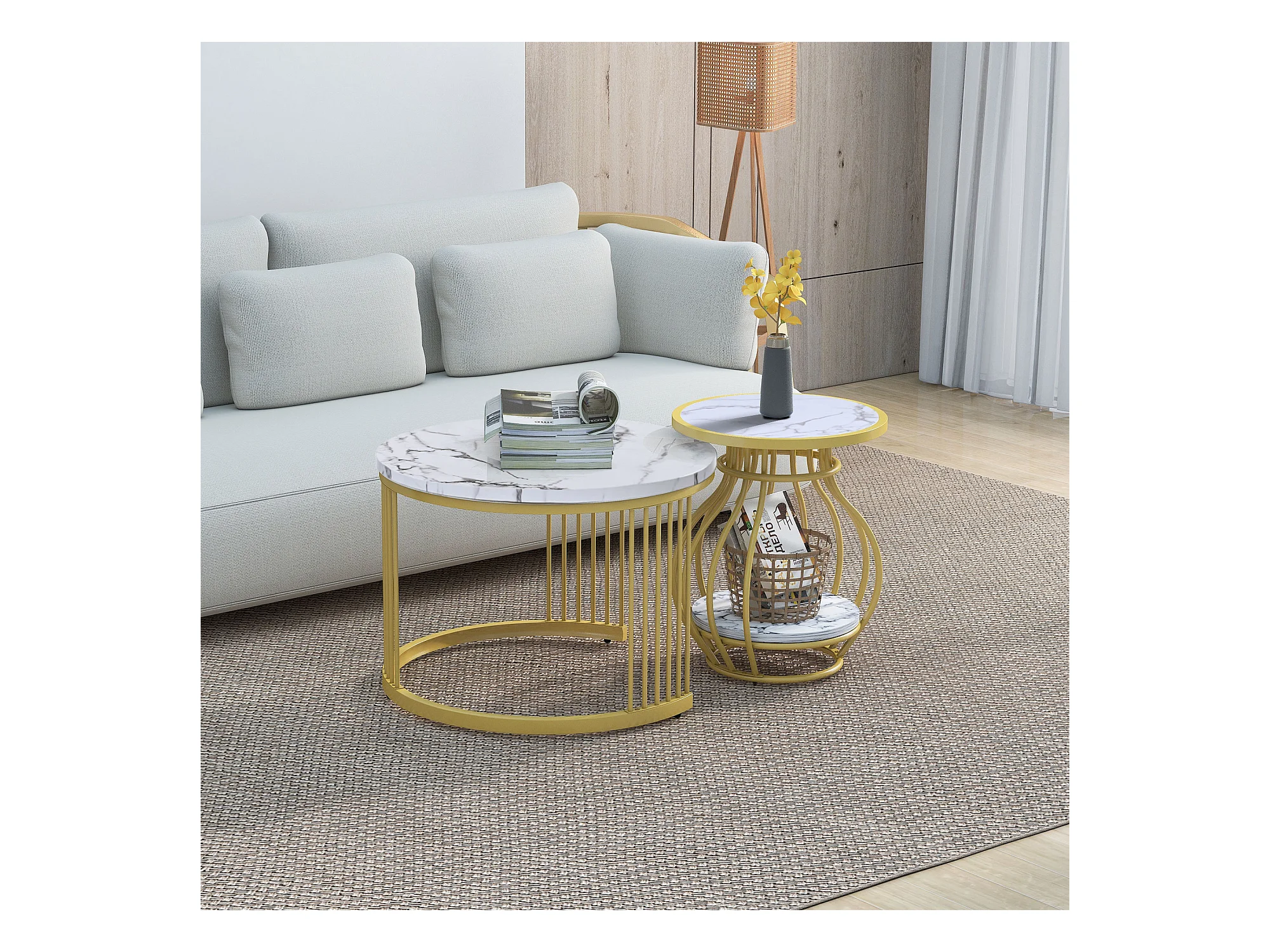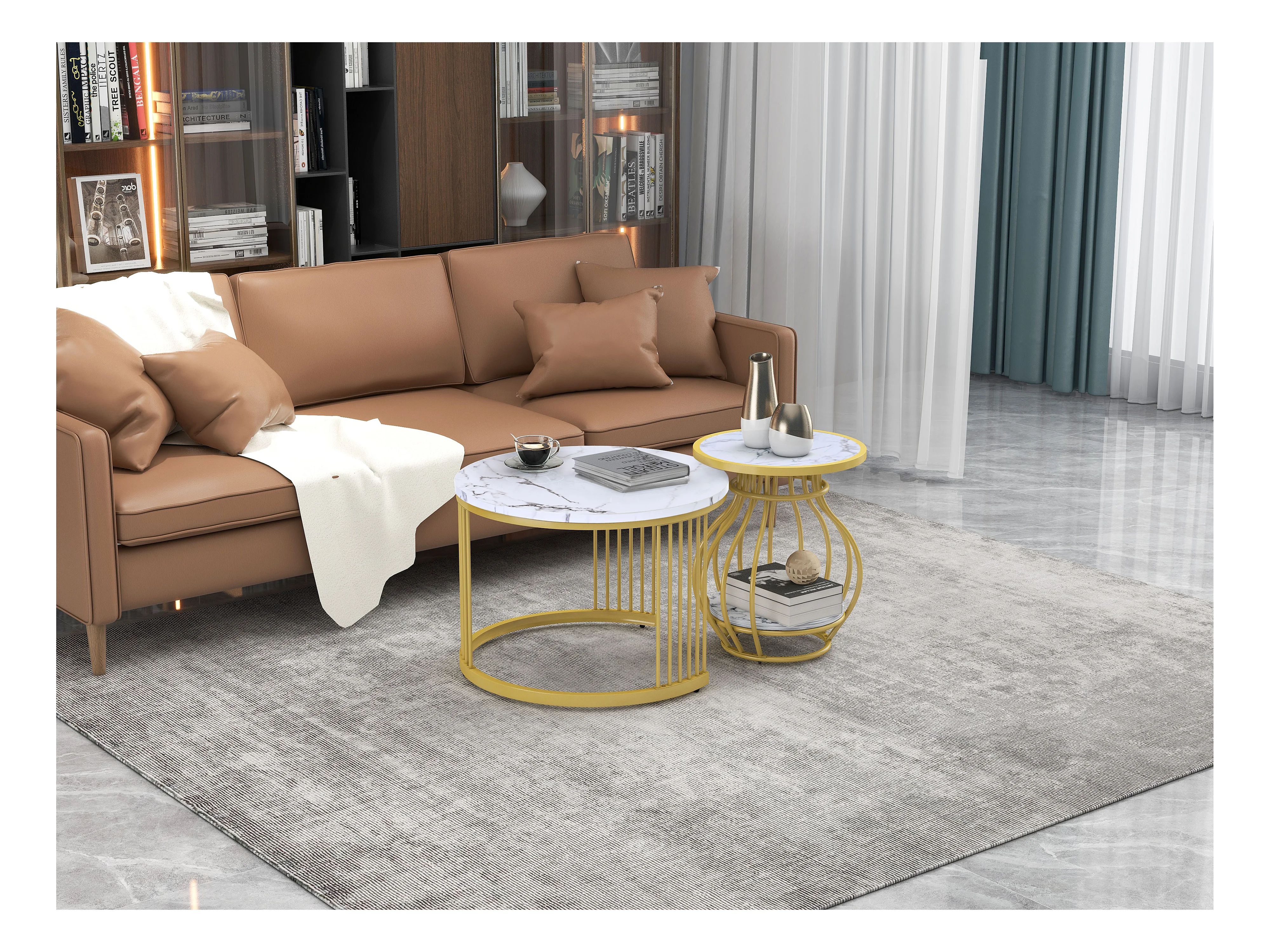 Set aus 2 runden Wohnzimmer-Couchtischen – Metall und MDF – Satztische – Marmoroptik – Weiß