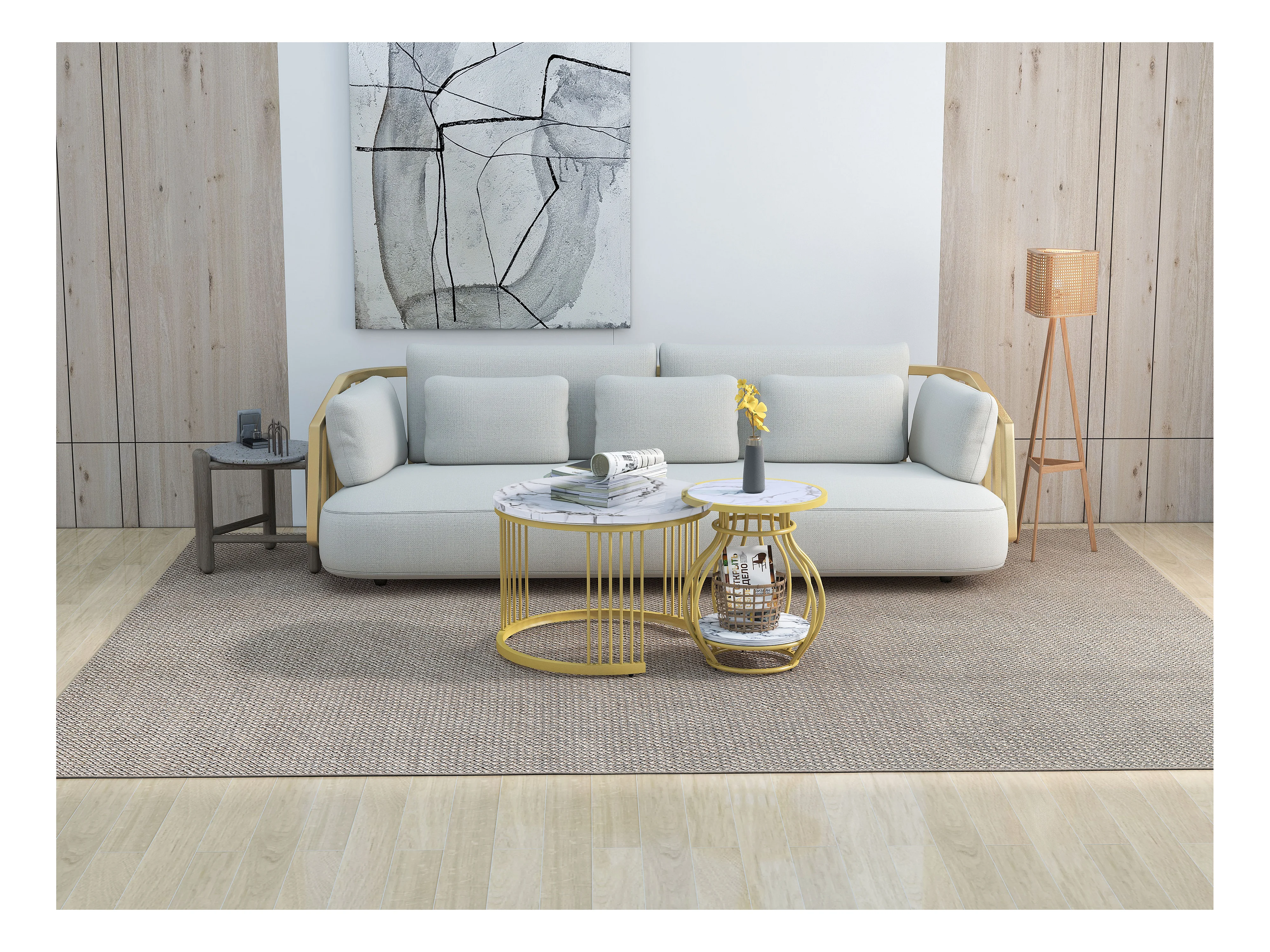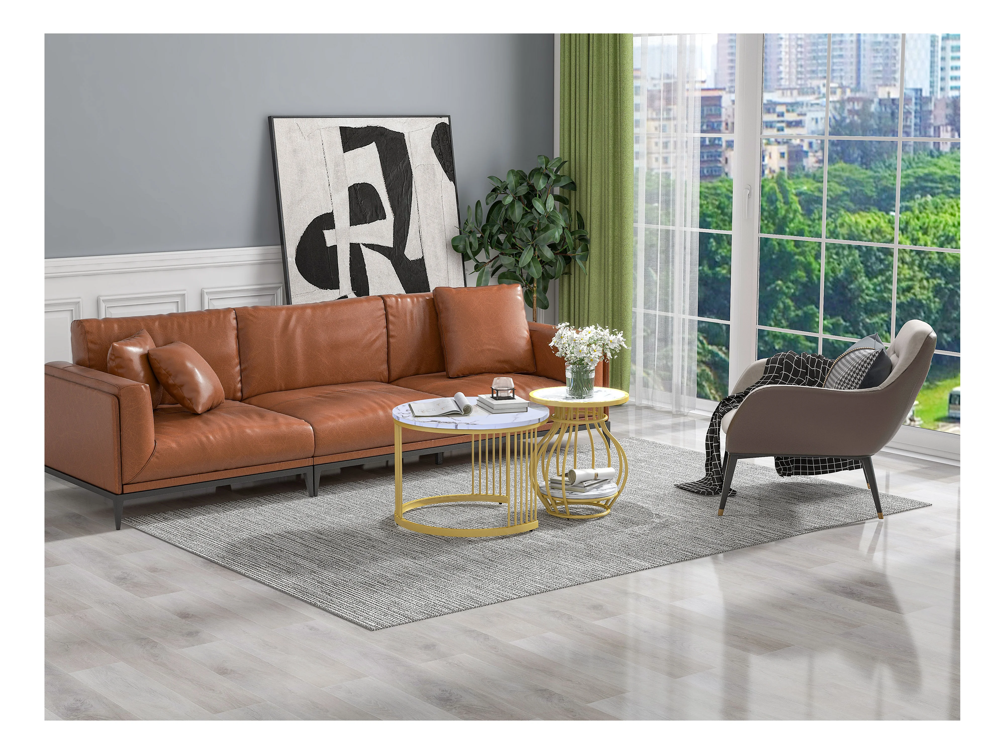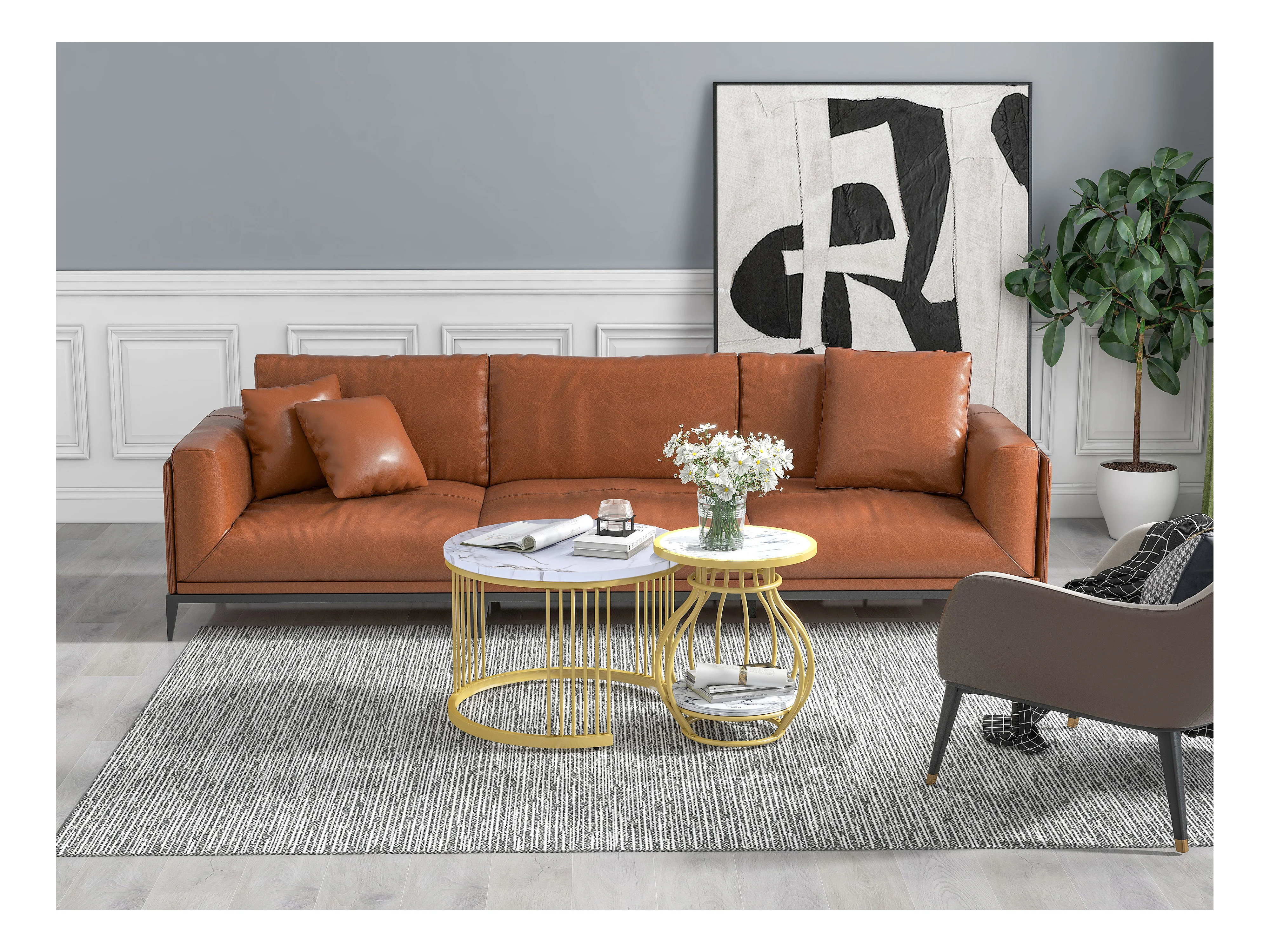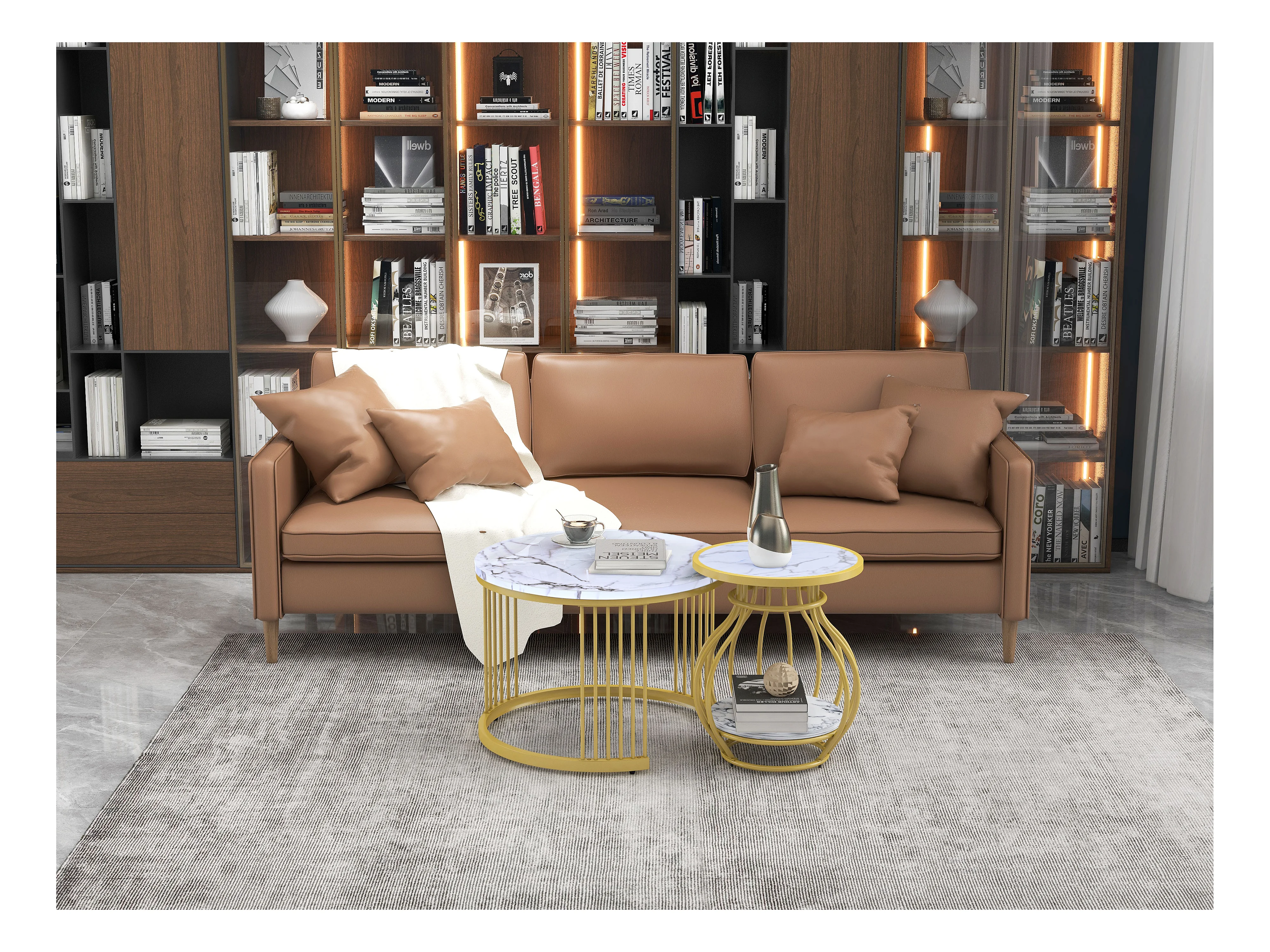 Set aus 2 runden Wohnzimmer-Couchtischen – Metall und MDF – Satztische – Marmoroptik – Weiß