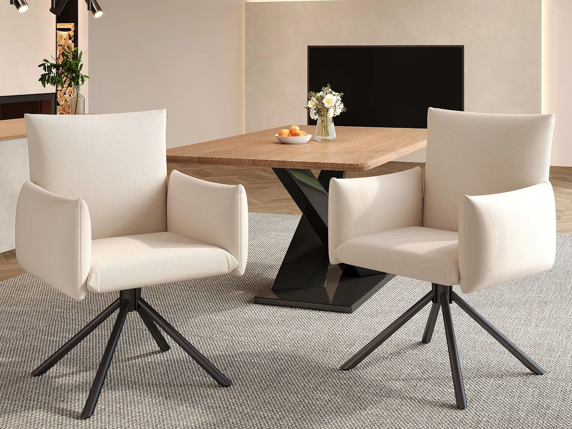Set mit 2 gepolsterten Sesseln - 360° Drehfunktion - mit 4 Metallbeinen - Leinen - Beige