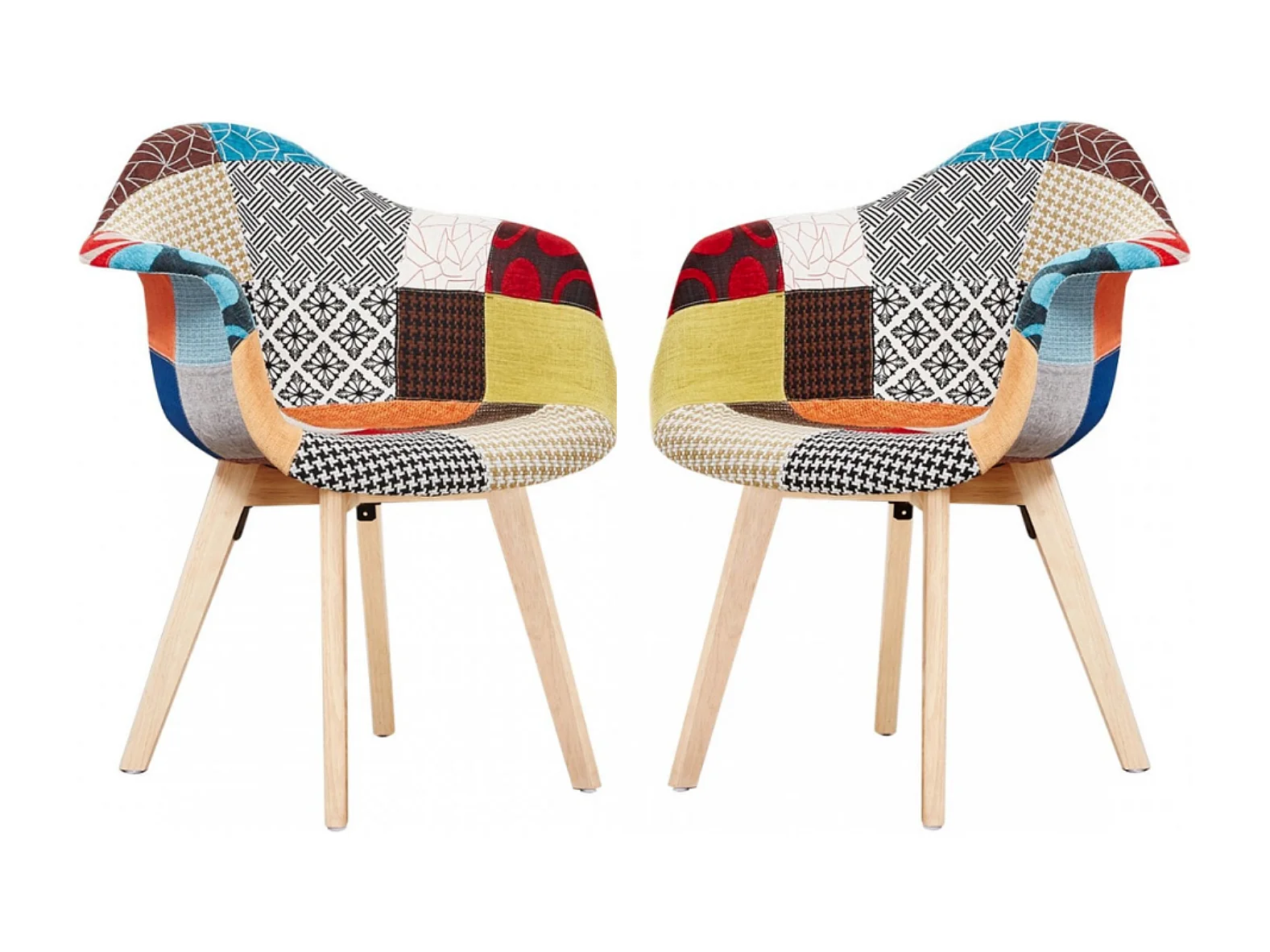 Set mit 2 skandinavischen Patchwork-Wannensesseln – Stoffbezug mit Holzbeinen – Mehrfarbig