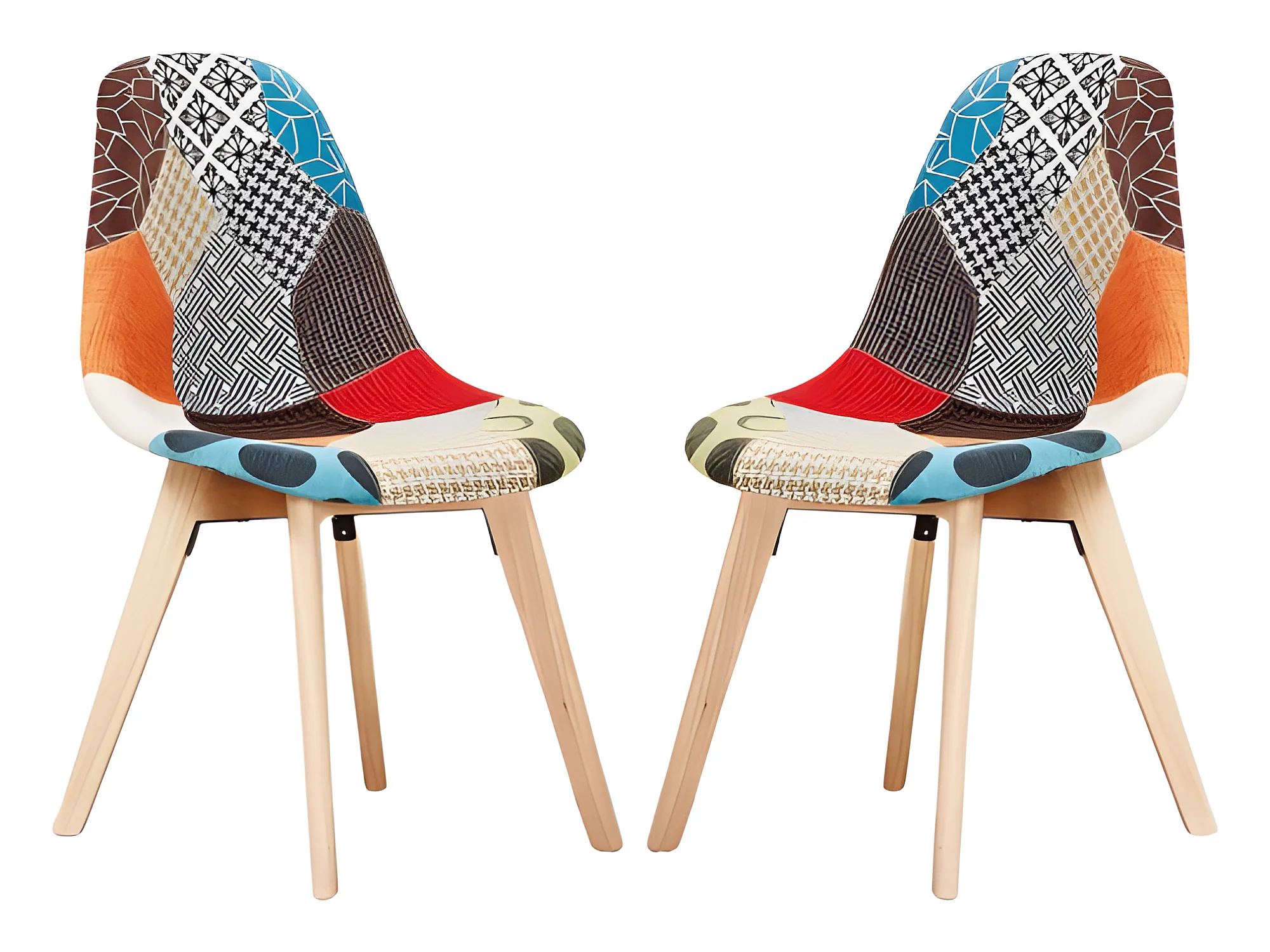Set mit 2 skandinavischen-Patchwork-Stühlen – Stoffbezug mit Holzbeinen – Mehrfarbig