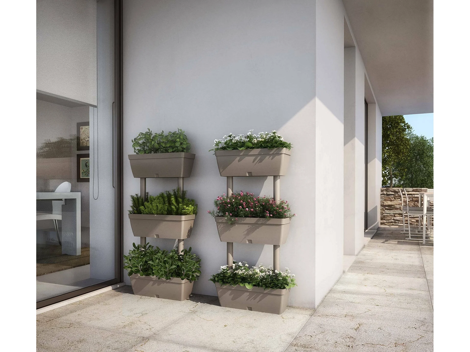 Set mit 3 Dantonacci-Vasen, Komposition für den heimischen Gemüsegarten, Blumenhalter-Set für drinnen oder draußen, 100 % Made in Italy, 49 x 16 x 100 cm, Taupe