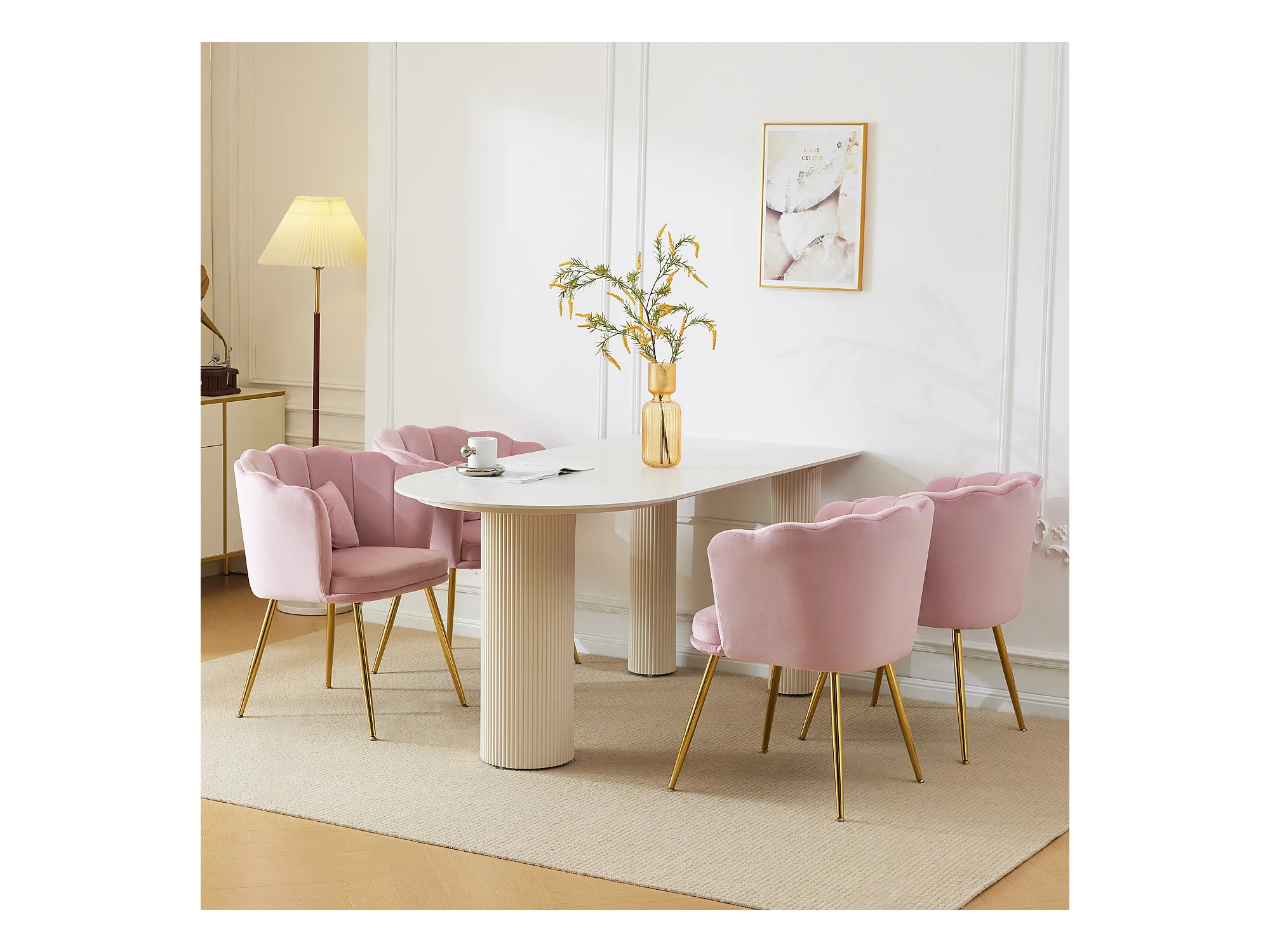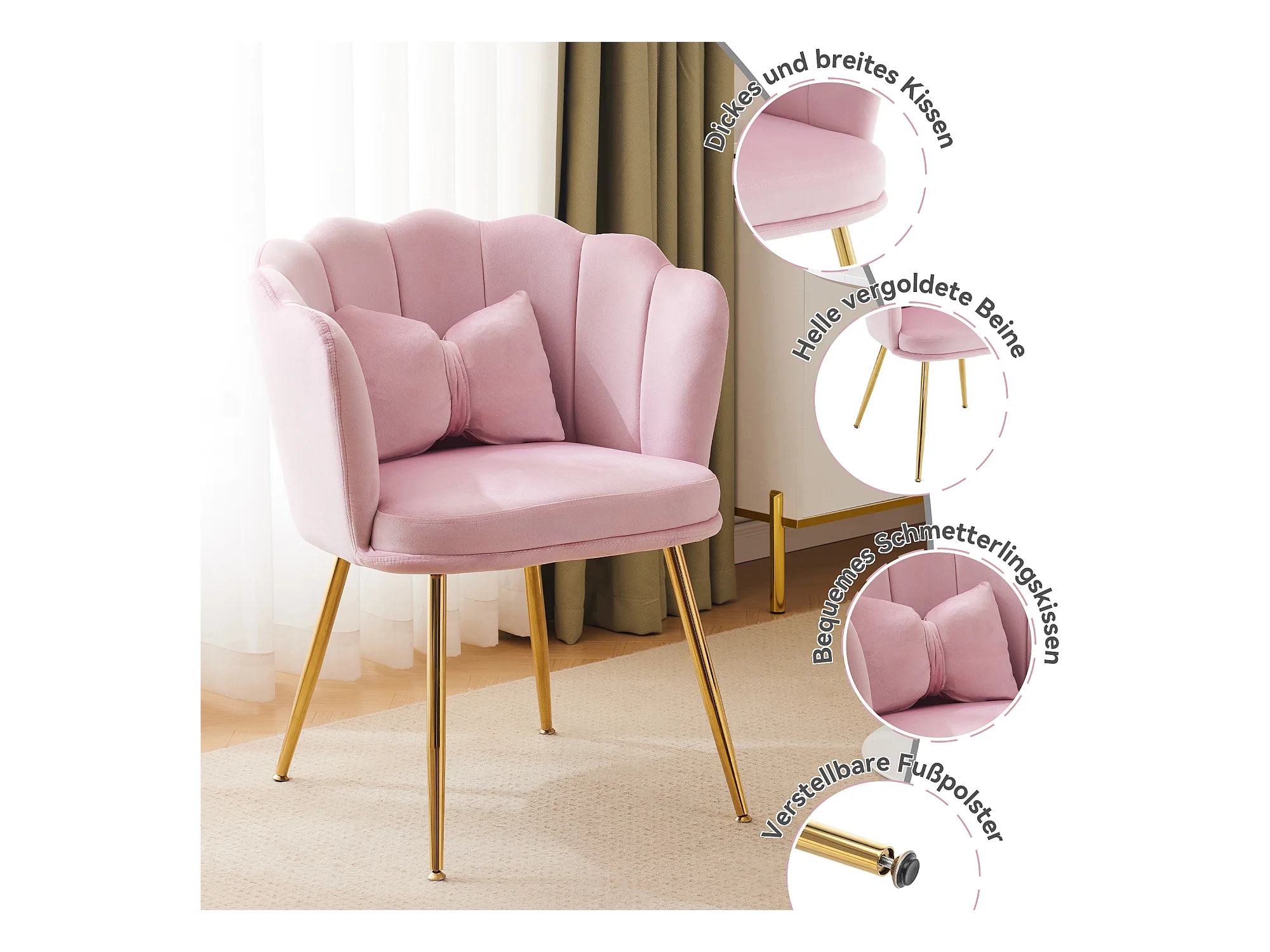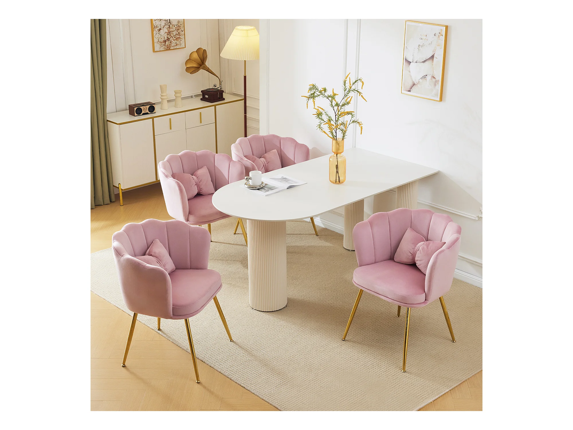 Set mit 4 Esszimmerstühlen aus Samt – 62 x 54,5 x 77 cm – mit Rückenlehne – Metallbeine – Rosa
