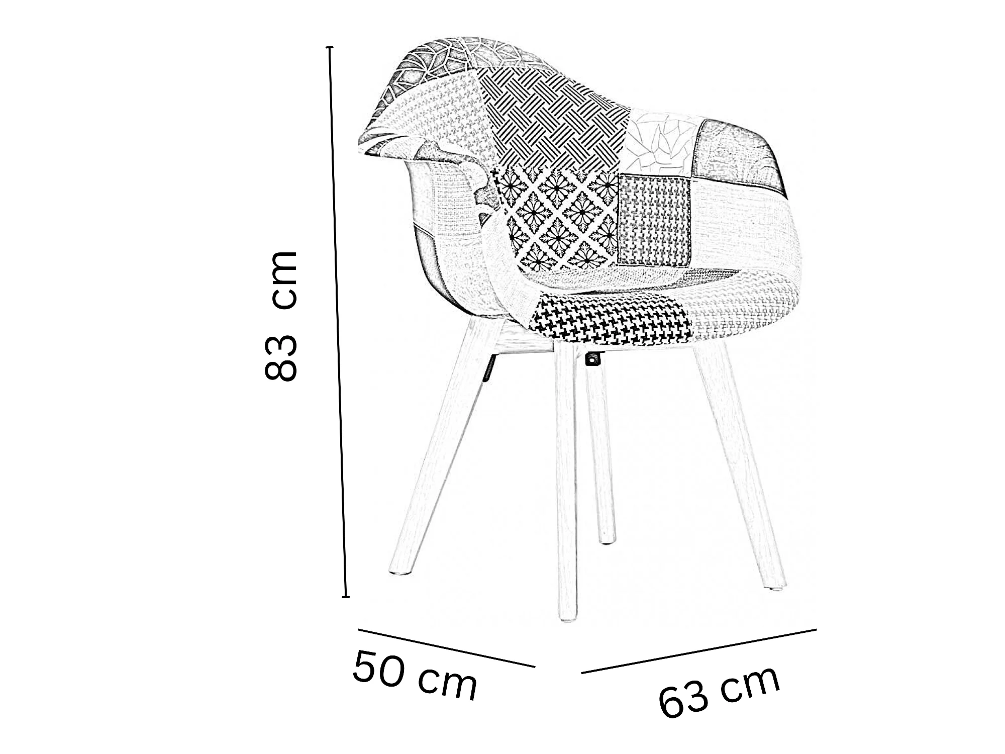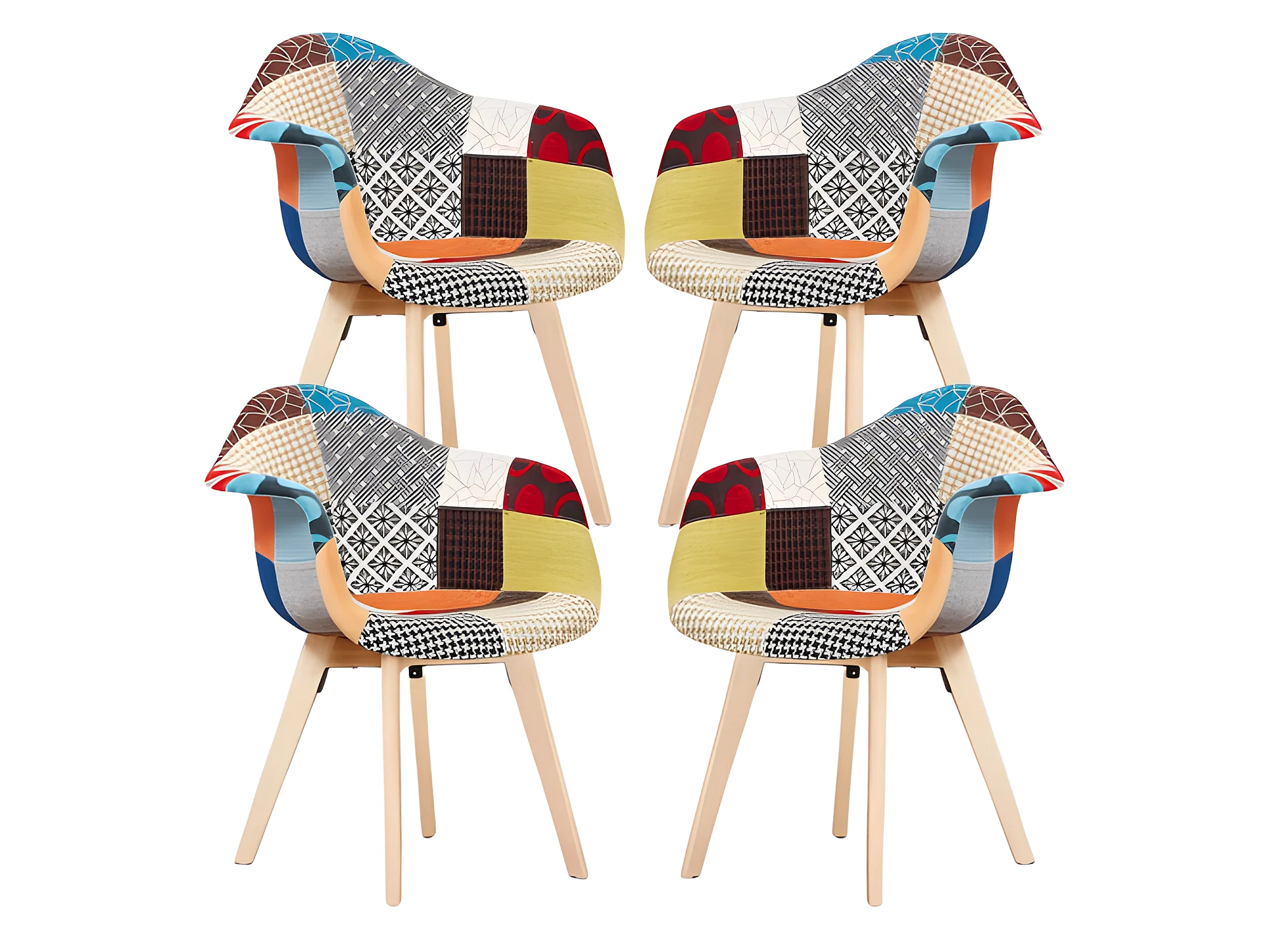 Set mit 4 skandinavischen Patchwork-Wannensesseln – stoffbezogene Holzbeine – mehrfarbig