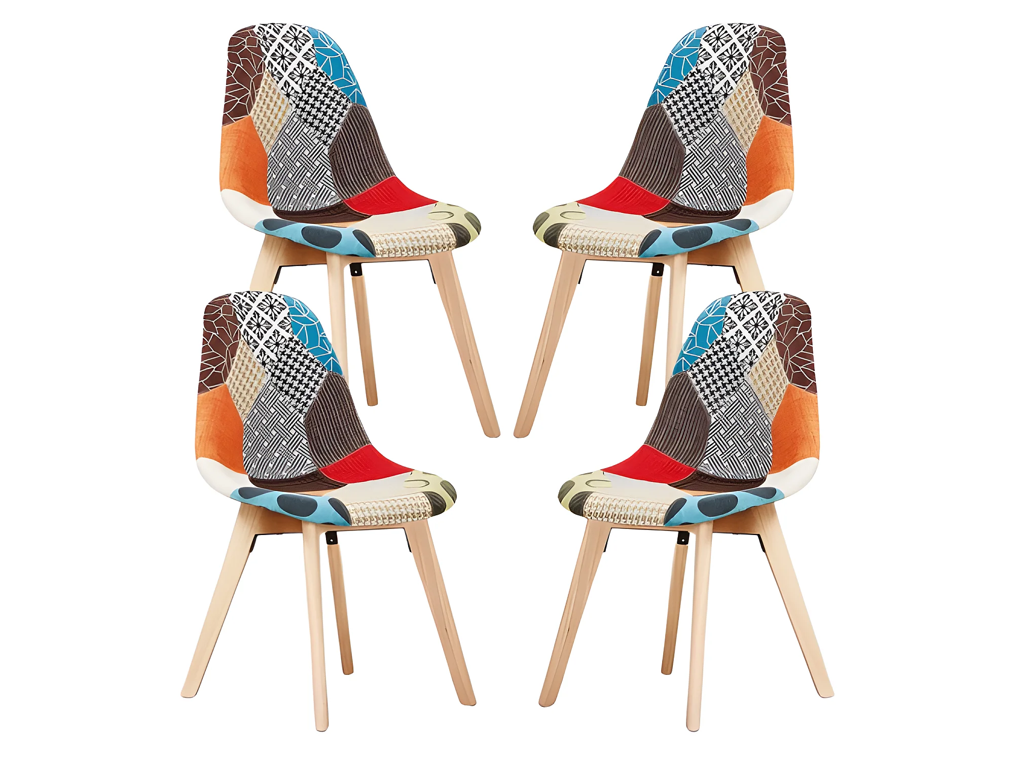 Set mit 4 skandinavischen-Patchwork-Stühlen – Stoffbezug mit Holzbeinen – Mehrfarbig