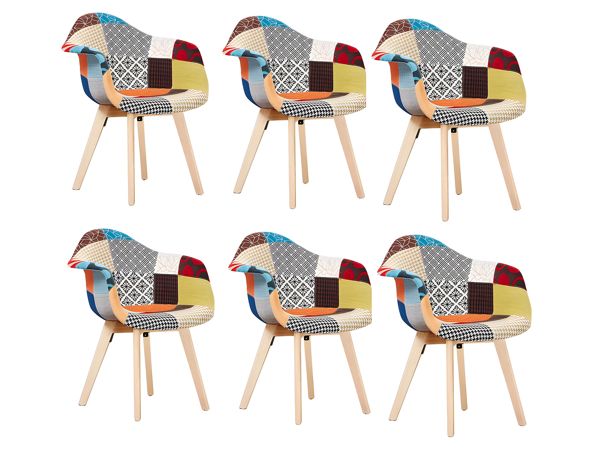 Set mit 6 skandinavischen Patchwork-Wannensesseln – stoffbezogene Holzbeine – mehrfarbig