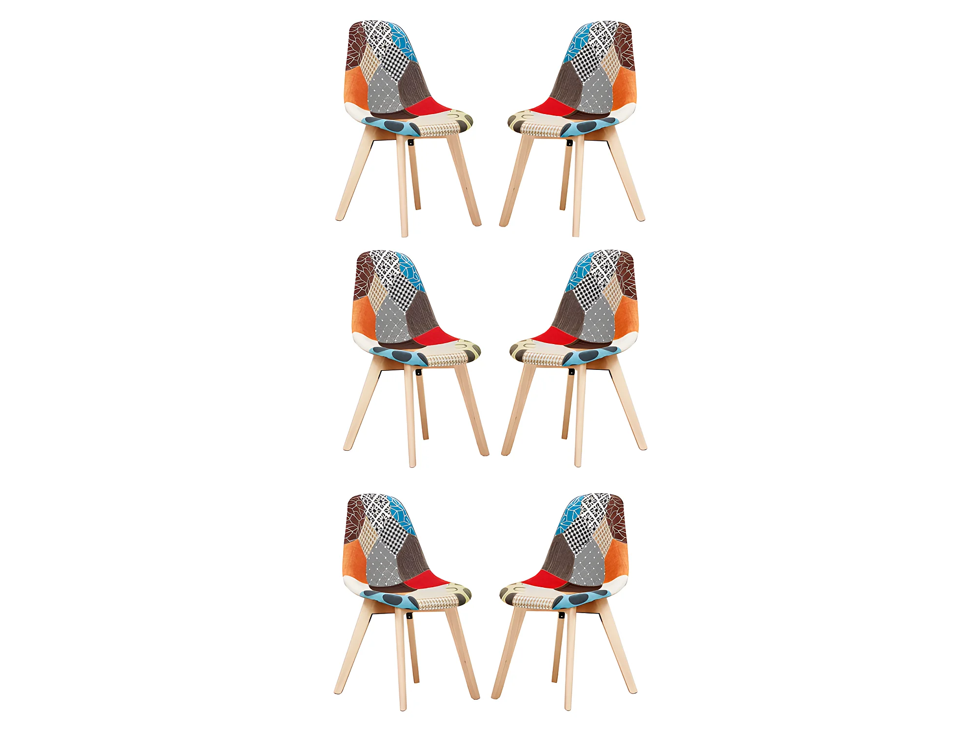 Set mit 6 skandinavischen-Patchwork-Stühlen – Stoffbezug mit Holzbeinen – Mehrfarbig