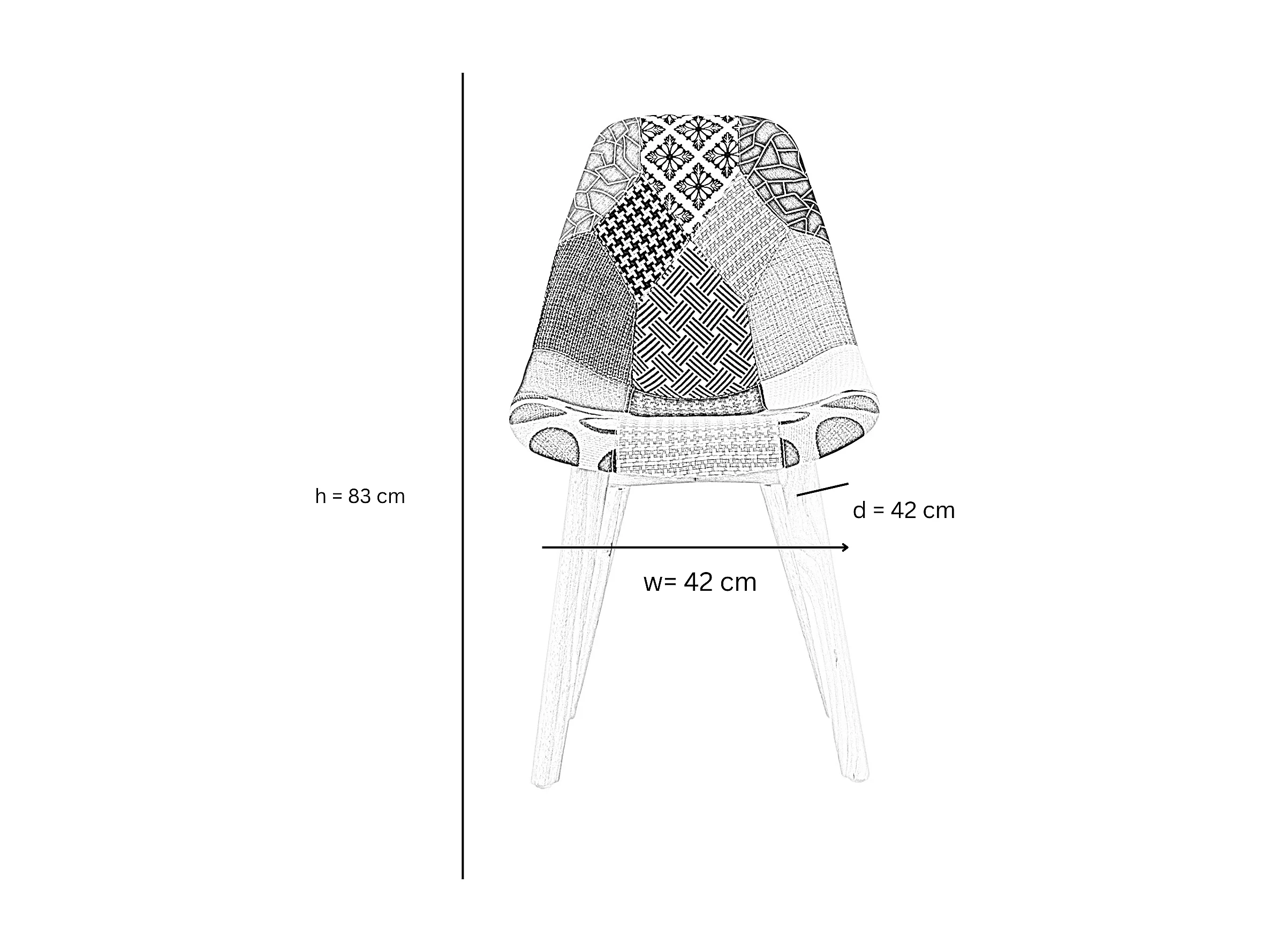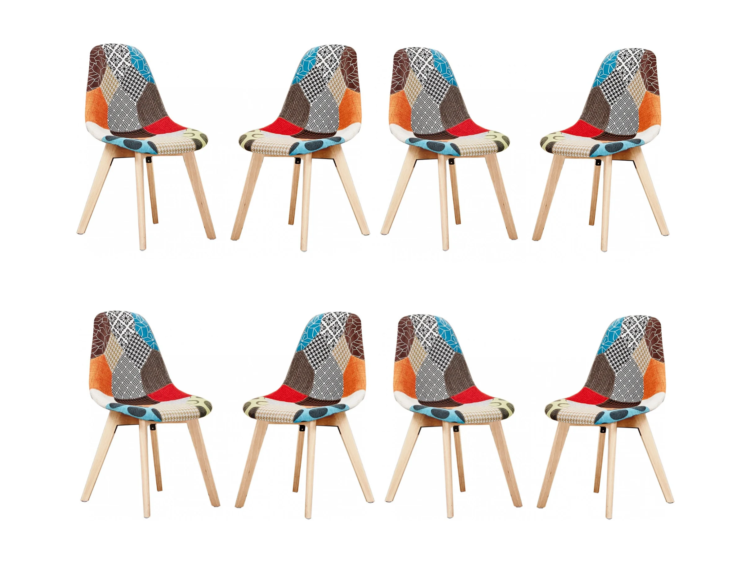 Set mit 8 skandinavischen-Patchwork-Stühlen – stoffbezogene Holzbeine – mehrfarbig