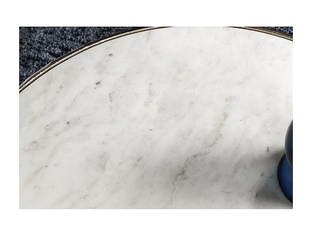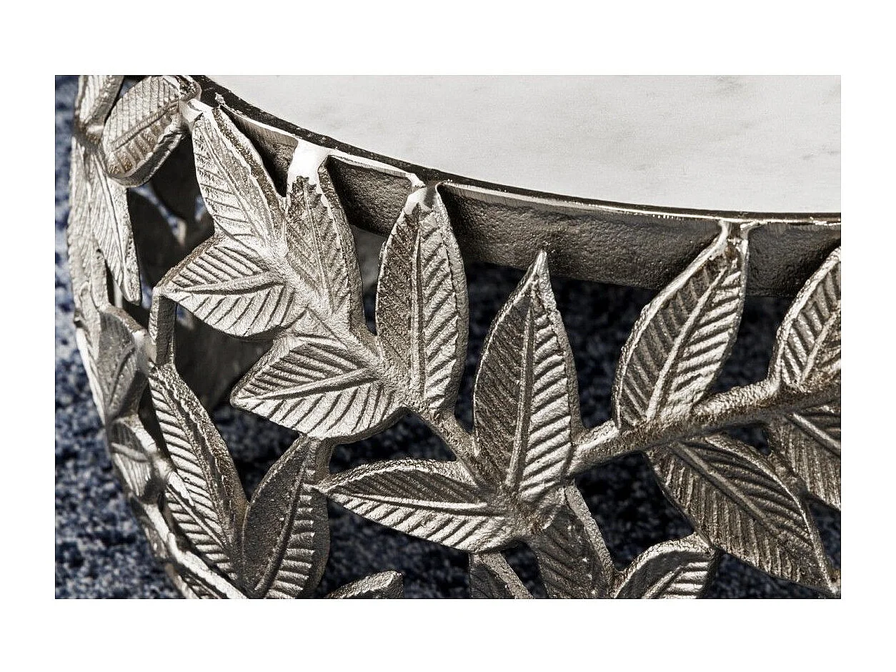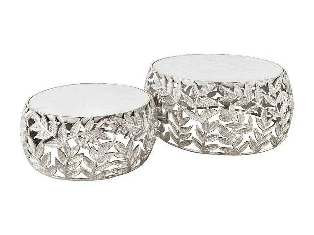 Set von 2 silbernen METRIX Couchtischen mit Marmorplatte – Design-Couchtische mit Blattmotiv