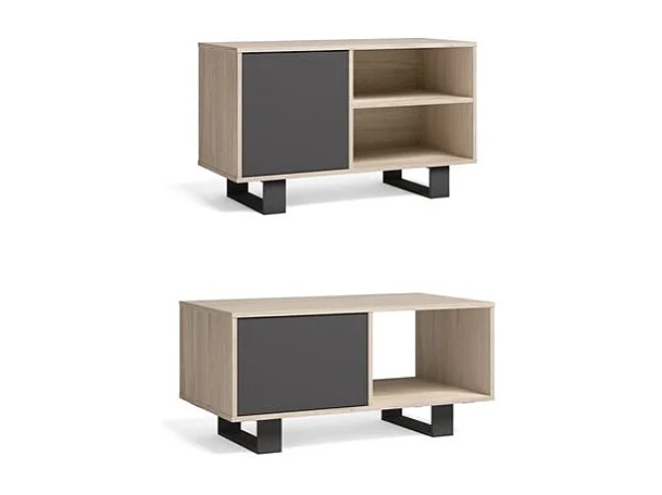 Set WIND, Wohnzimmer-/Esszimmermöbelset bestehend aus 1 TV100-Möbel und 1 Couchtisch, Eiche/Grau, Schwarze Füße