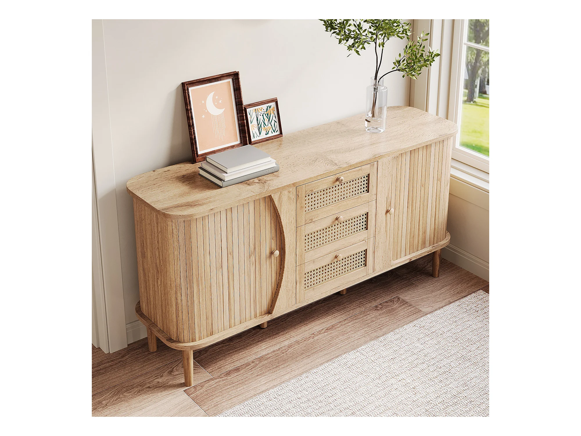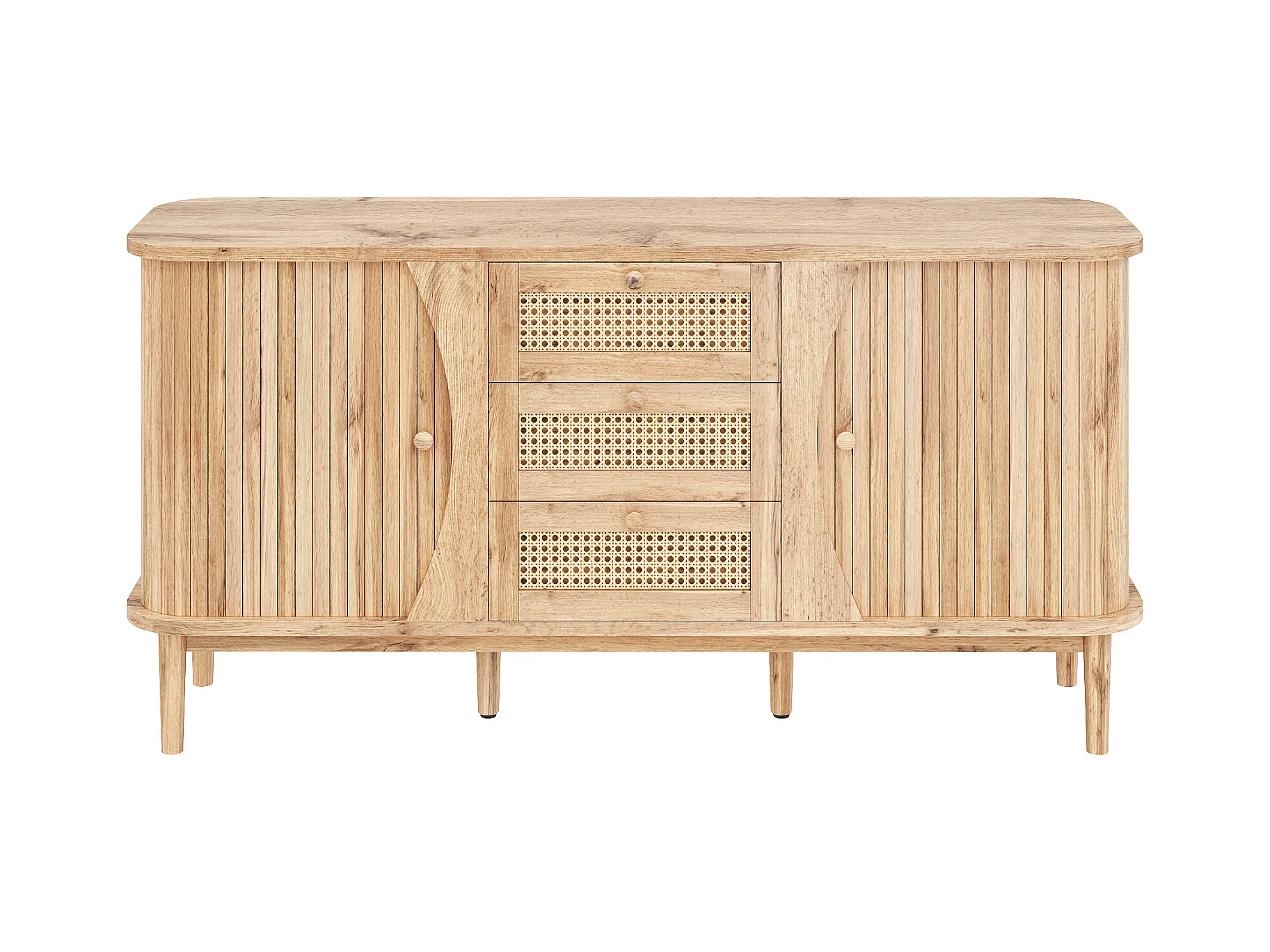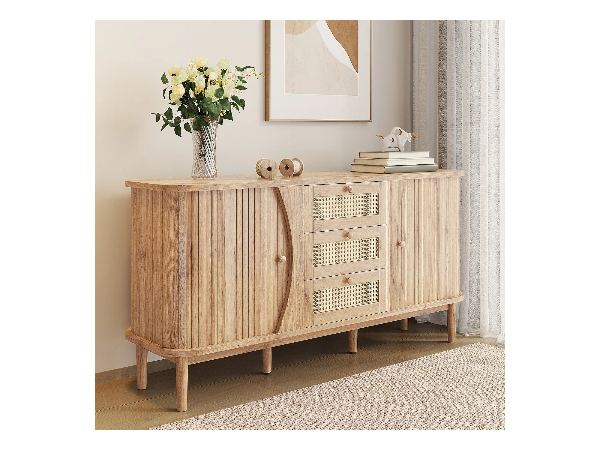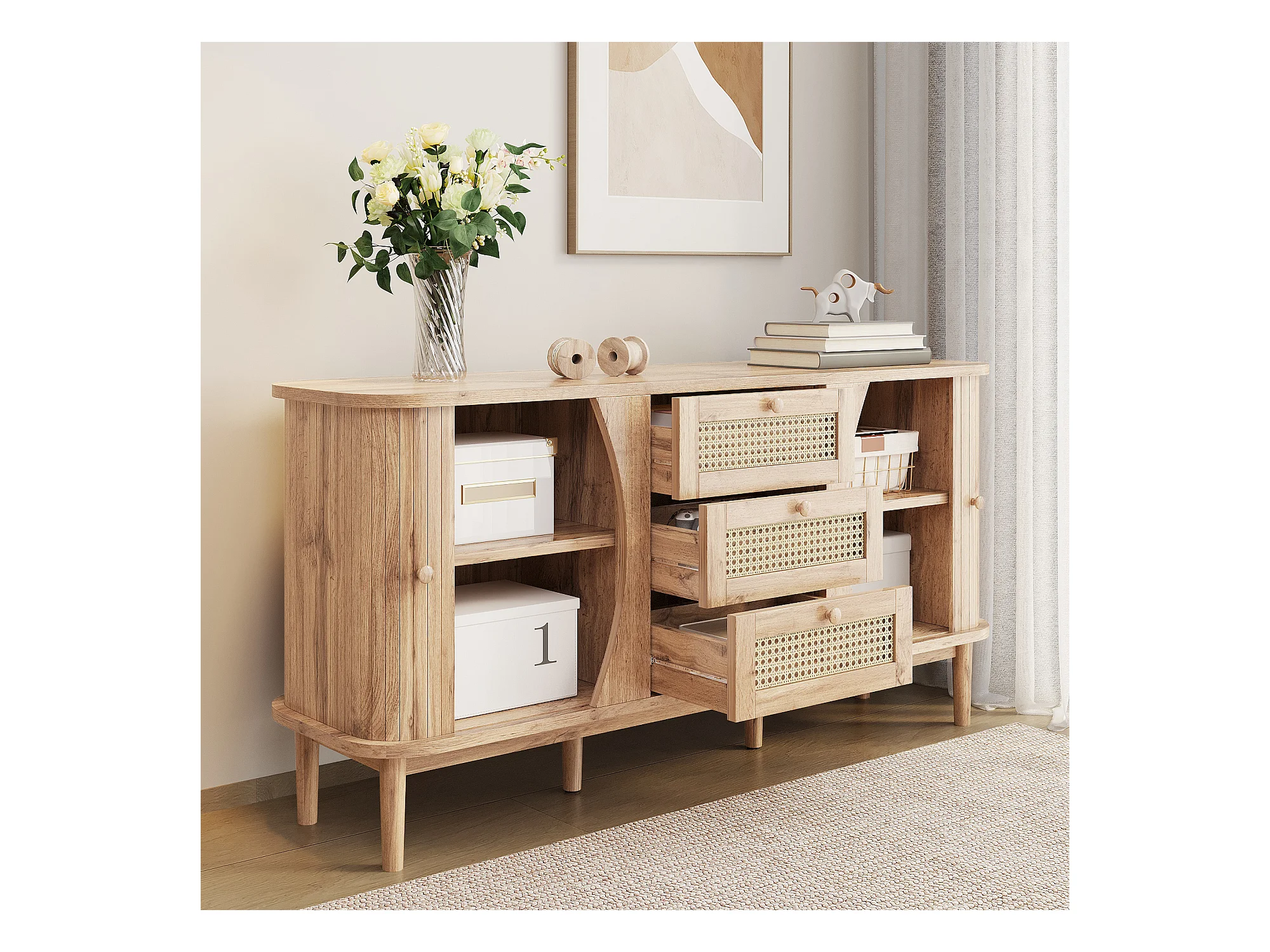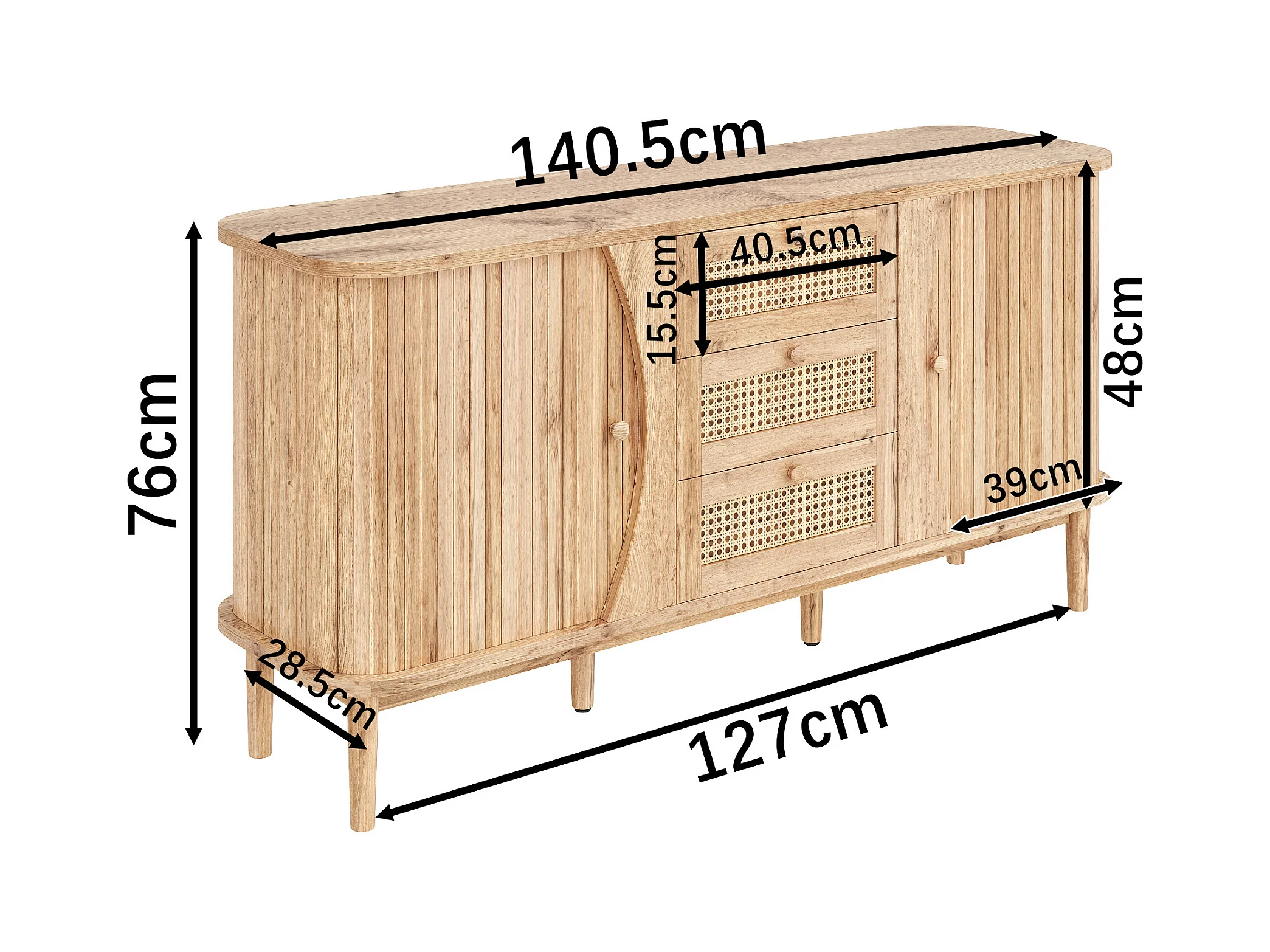Sideboard 140,5×40×76 cm - 3 Rattan-Schubladen - 2 Schiebetüren - höhenverstellbare Fächer - natur