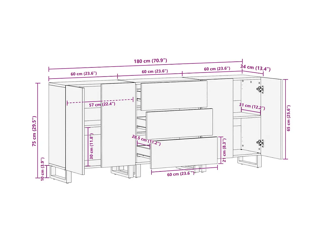 Sideboard 3 Stk. 60x34x75 cm Massivholz Akazie